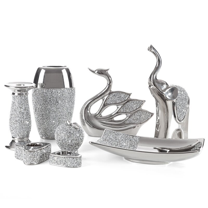 Ceramika dekoracyjna posiada nieocenione walory dekoracyjne. To dzięki elementom takim jak figurki dekoracyjne, wazony, patery, świeczniki wnętrze nabiera wyrazu i charakteru. Poprzez dodatki personalizujemy nasze prywatne wnętrza aby spełniały nasze oczekiwania zarówno użytkowe jak i wizualne. Srebrny wazon ceramiczny będzie pięknym dodatkiem dekoracyjnym wnętrza urządzonego w stylu glamour.