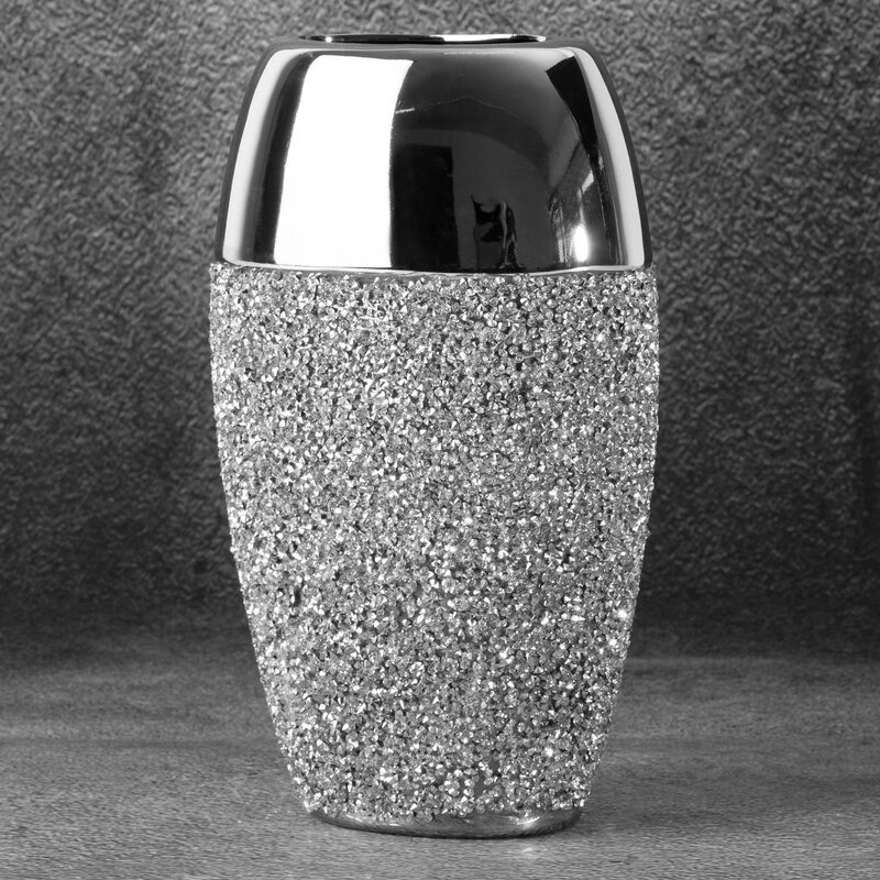 Oryginalny wazon z pirytem - elegancki wazon dekoracyjny zdobiony błyszczącymi szkiełkami do 2/3 wysokości. Wazon ceramiczny zachwyca kształtem oraz elegancją i ponadczasową kolorystyką. Srebrne dodatki do wnętrz cieszą się ogromną popularnością. A te które dodatkowo ozdobione są kryształkami szczególnie. Ceramika z pirytem podkreśla elegancję wnętrza oraz dodaje mu blasku.