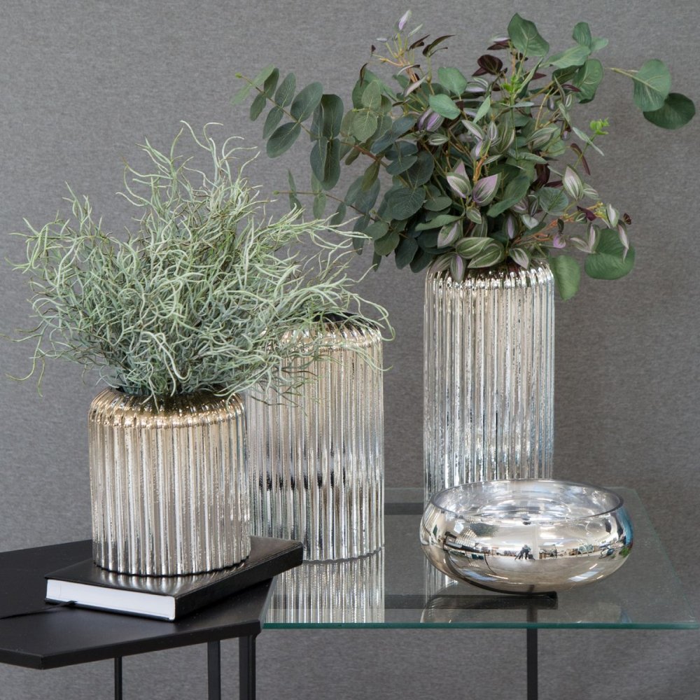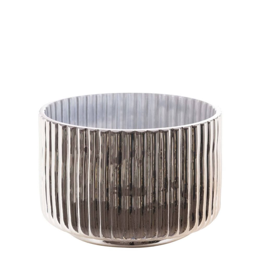 NOWOCZESNY ŚWIECZNIK WYKONANY ZE SZKŁA. ŚWIECZNIK O RYFLOWANEJ STRUKTURZA W KOLORZE SREBRNYM - SREBRO Z EFEKTEM PRZYPOMINAJĄCYM CHROM - ŚWIETNIE WKOMPONUJE SIĘ WE WNĘTRZA NOWOCZESNE JAK I TE URZĄDZONE W STYLU GLAMOUR. NOWOCZESNA FORMA JAK I KOLORYSTYKA BĘDĄ PIĘKNĄ OZDOBĄ STÓŁU, KOMODY JAK I BLATU KUCHENNEGO.