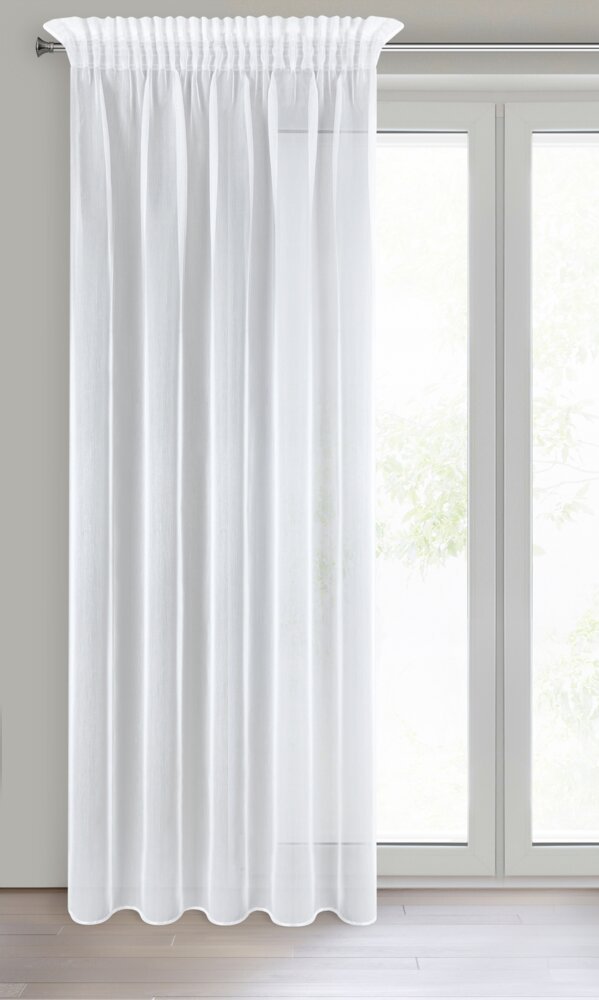 Gotowa firana z taśmą marszczącą oraz tunelem MIREA doskonale nadaje się do salonu, sypialni, jadalni oraz innych pomieszczeń, które potrzebują eleganckiej i stylowej dekoracji okiennej. Jej nabłyszczana struktura sprawi, że wnętrza będą wyglądać jaśniej i bardziej przestronnie. Miranę można zamontować na żabki, agrafki jak również naciągnąć na rurkę dzięki tunelowi.
