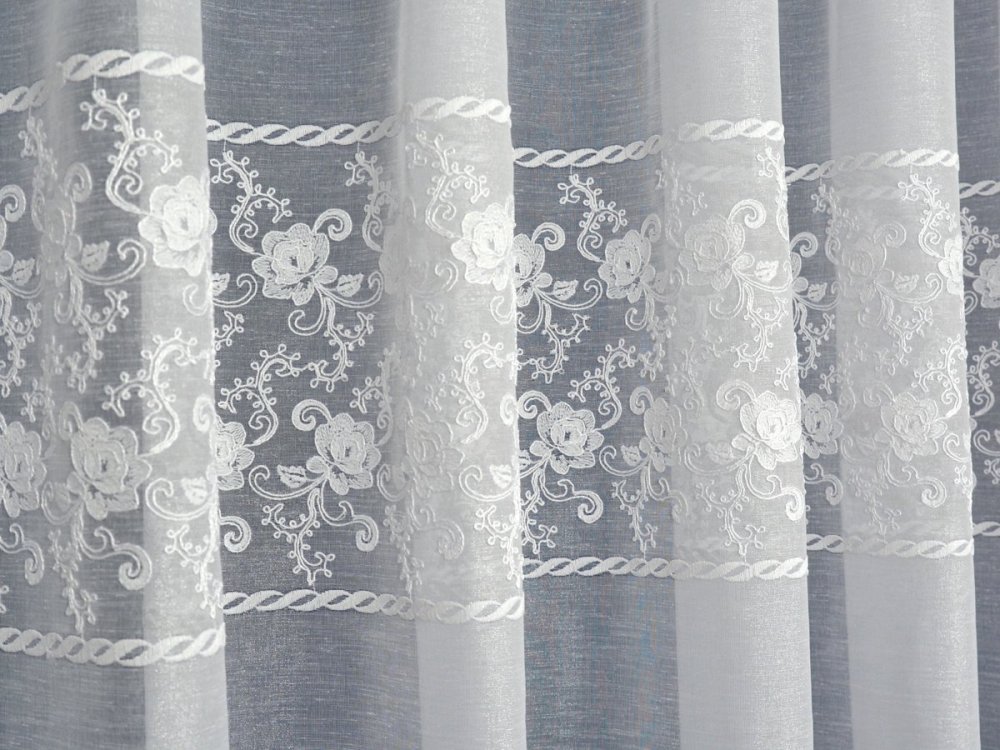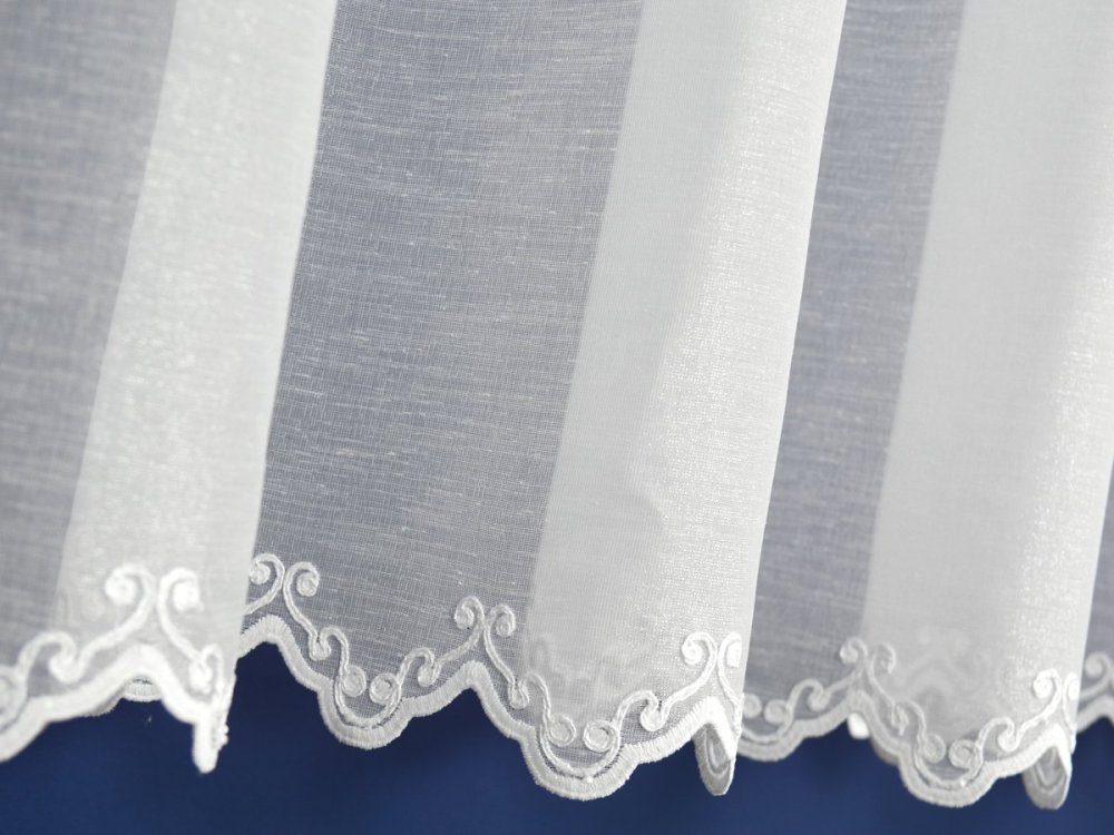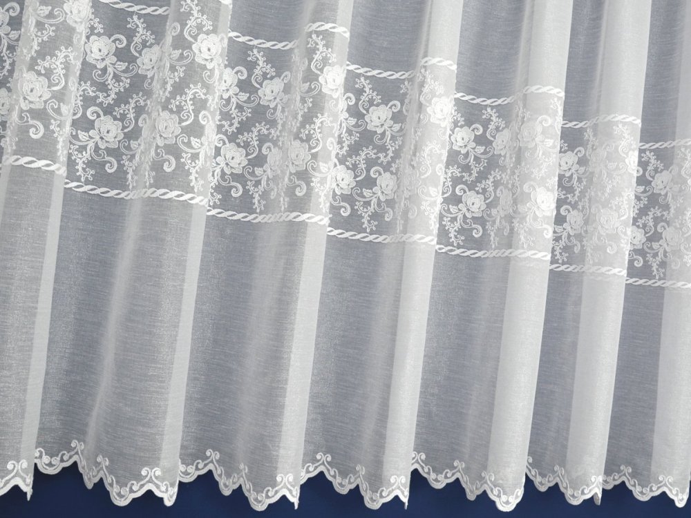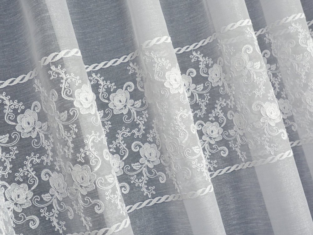 WYSOKOGATUNKOWA, ELEGANCKA, TURECKA FIRANA Z ETAMINY HAFTOWANEJ SZLAKOWO. GŁÓWNĄ OZDOBĄ FIRANY JEST SZEROKI SZLAKOWY HAFT TWORZĄCY A'LA APLIKACJĘ. WZÓR SIĘGA DO WYSOKOŚCI 69CM. OD DOŁU TKANINA ZAKOŃCZONA HAFTOWANYMI ZĄBKAMI. TŁO FIRANY STANOWI ETAMINA NABŁYSZCZANA - DELIKATNIE MIENI SIĘ POD WPŁYWEM ŚWIATŁA ROZŚWIETLAJĄC POMIESZCZENIE.