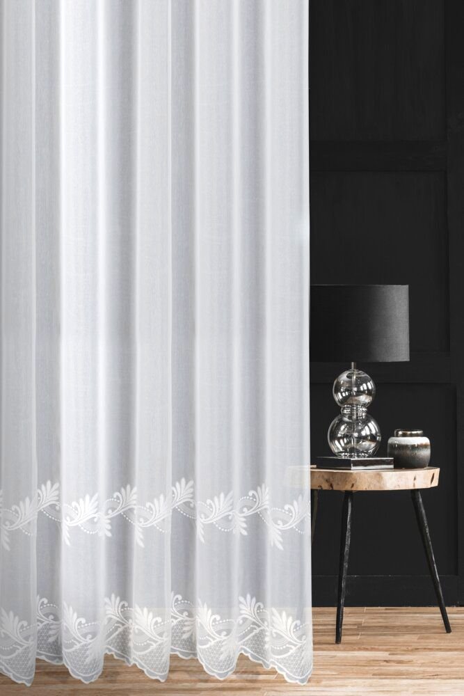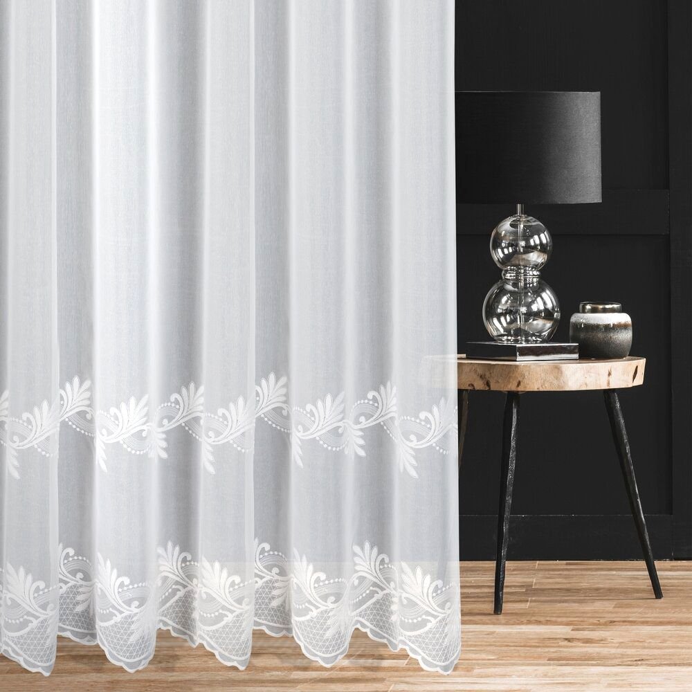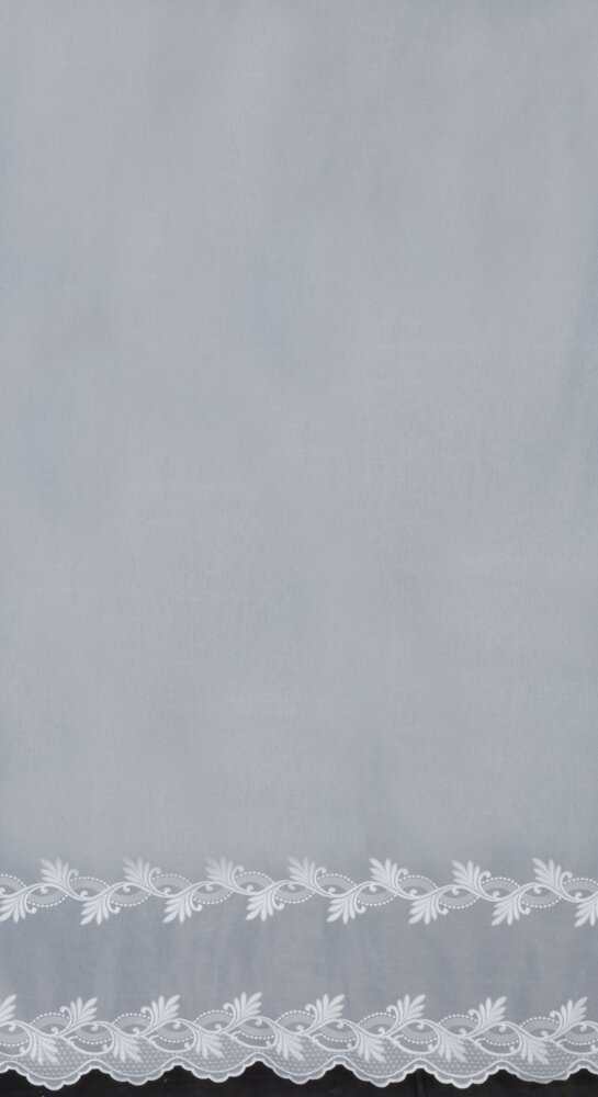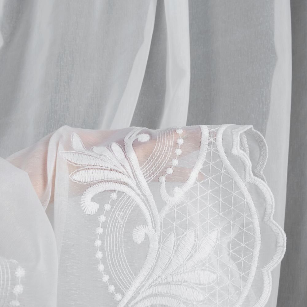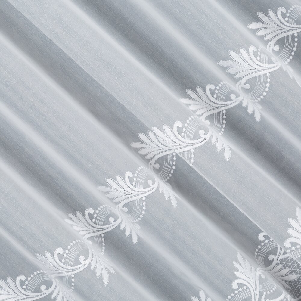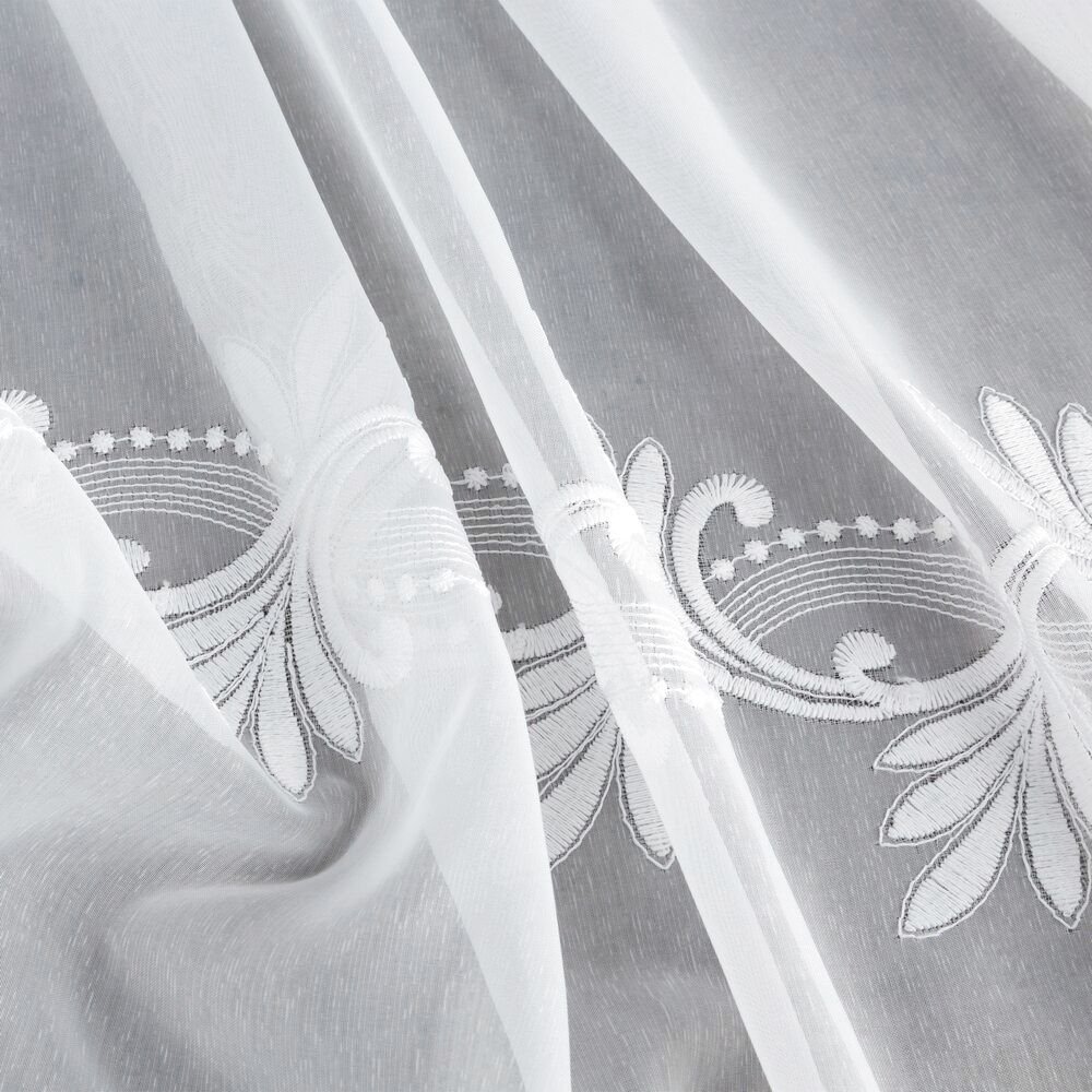 Dolna część firany została starannie wykończona dwoma szlakami haftu, które sięgają do wysokości 45 cm. Wzór jest matowy, podobnie jak tło tkaniny, dzięki czemu całość wygląda elegancko i nie daje efektu połysku. Haft tworzy delikatną, florystyczną linię dekoracyjną, która subtelnie podkreśla dół firany i nadaje jej wyrafinowanego charakteru.