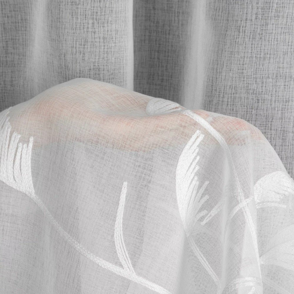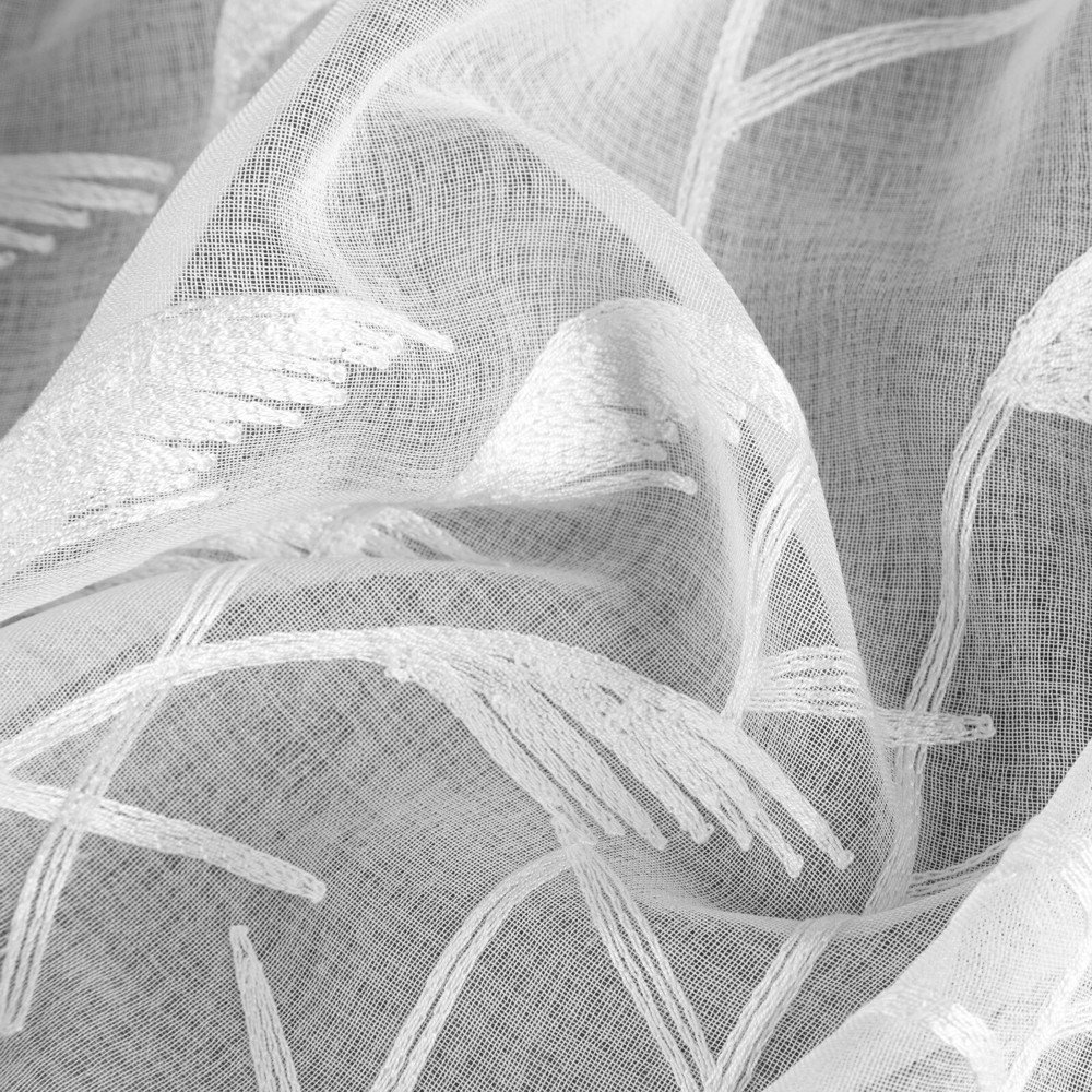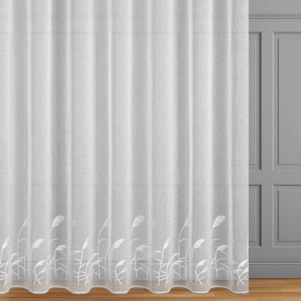 Ta biała firana z etaminy to połączenie naturalnej lekkości tkaniny z subtelnym, kordonkowym haftem przypominającym delikatne źdźbła traw poruszane wiatrem. Haft jest lekko wypukły, dzięki czemu wzór widoczny jest zarówno z bliska, jak i przy świetle dziennym — tworzy efekt eleganckiej, subtelnej dekoracji okna.