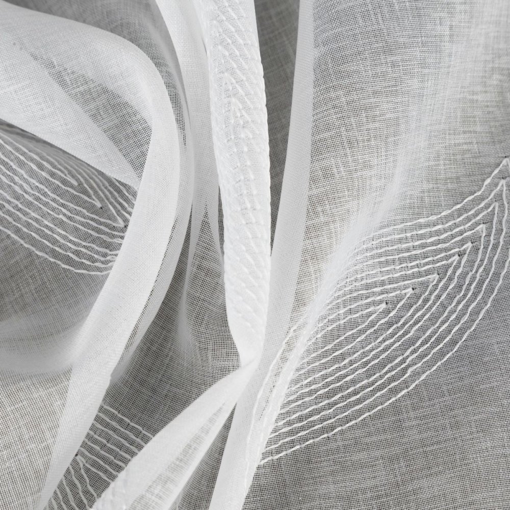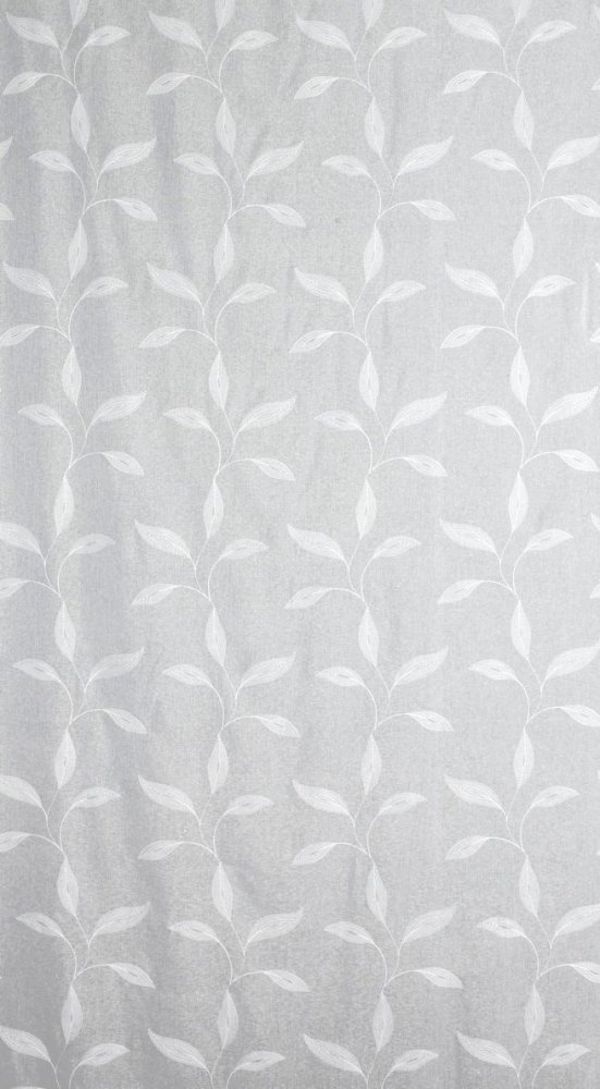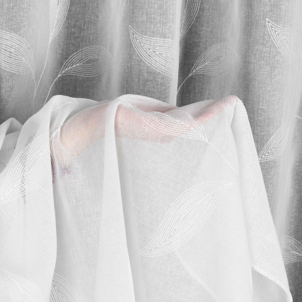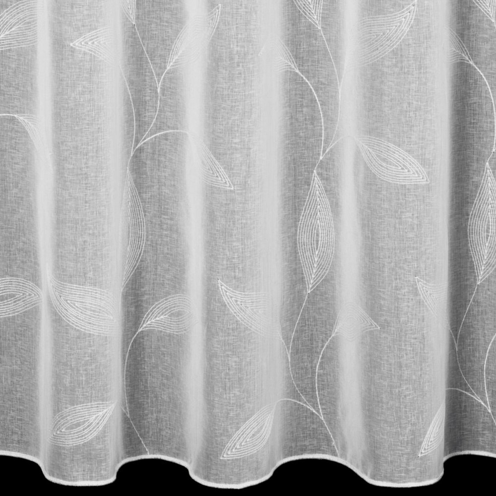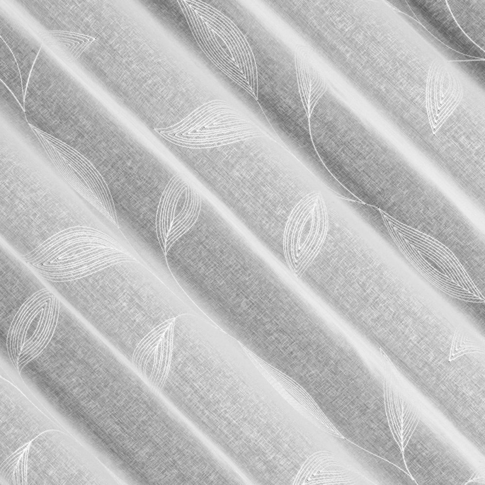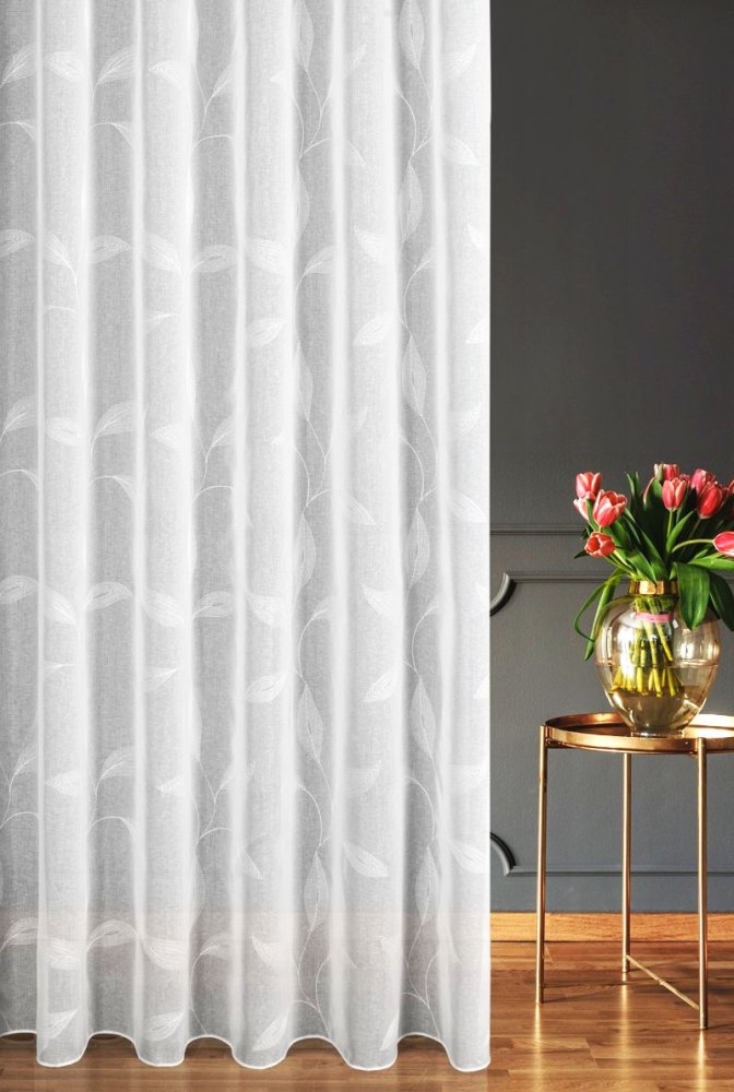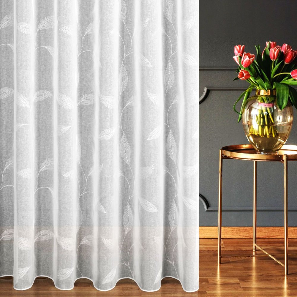 Całą wysokość firany zdobi haftowany wzór liści, który wprowadza do wnętrza świeżość i harmonię. Haft rozciąga się do wysokości 2,80 m, co w połączeniu z fabryczną wysokością 3 m pozwala na zawieszenie firany nawet w bardzo wysokich pomieszczeniach.