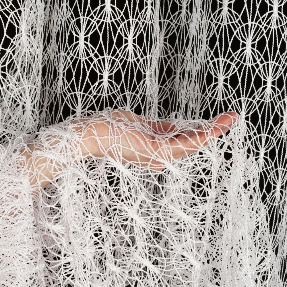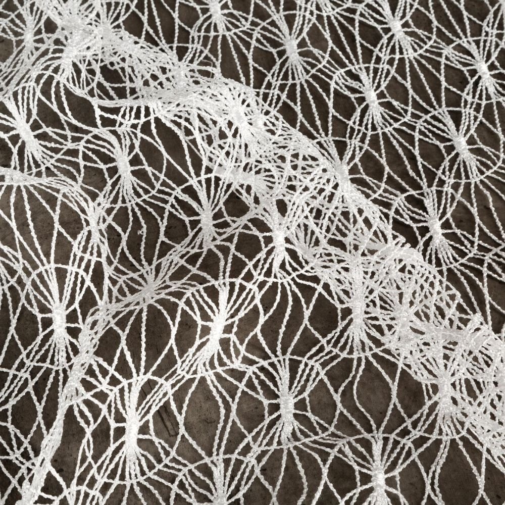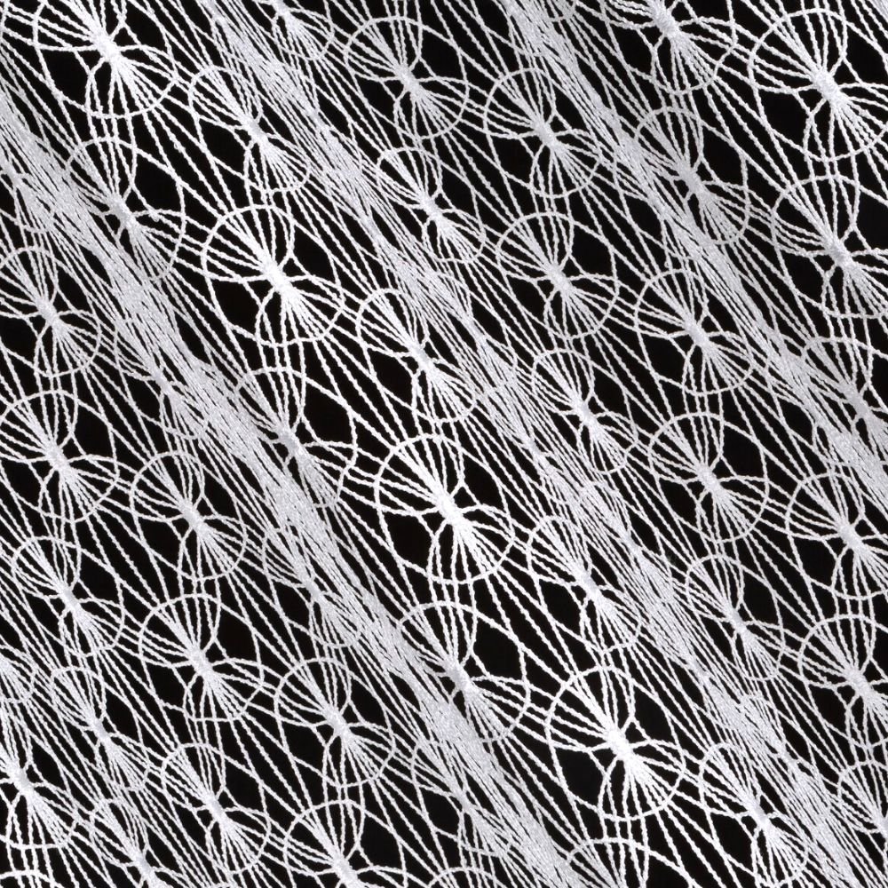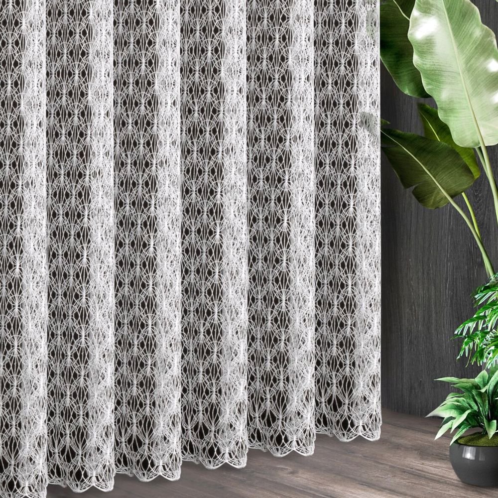Ta ekskluzywna tkanina firanowa zachwyca delikatną, ażurową strukturą inspirowaną koronkowymi splotami retro. Wzór geometryczny tworzy misterną kompozycję, która doskonale prezentuje się zarówno w klasycznych salonach, jak i nowoczesnych przestrzeniach.