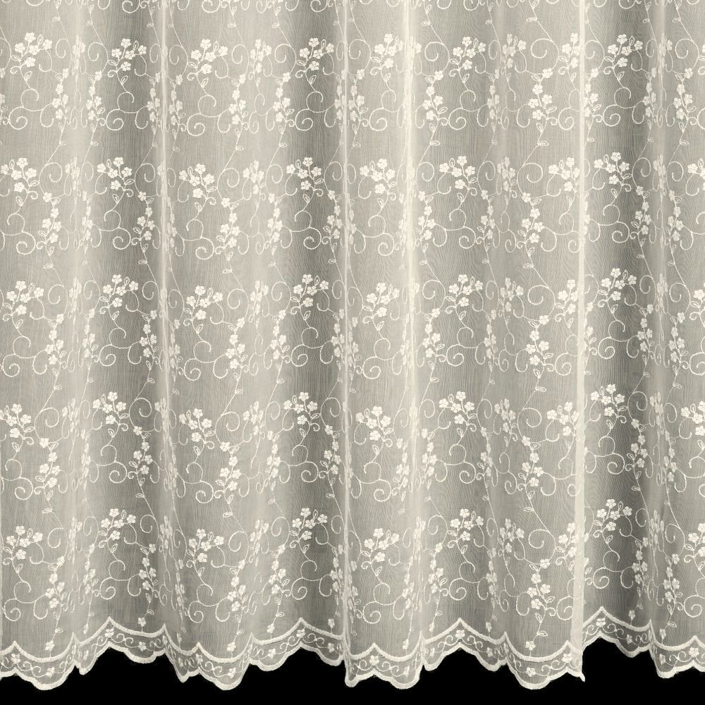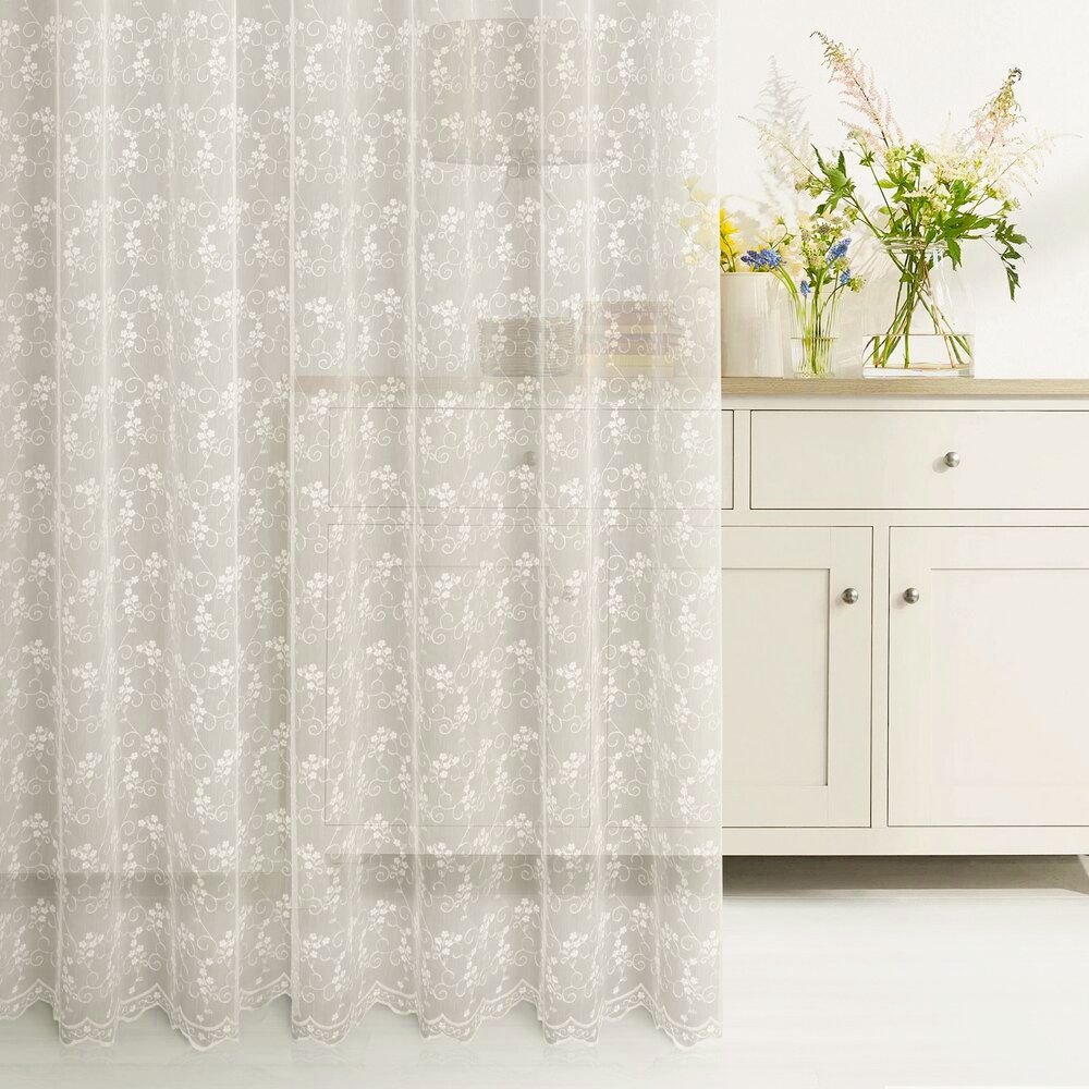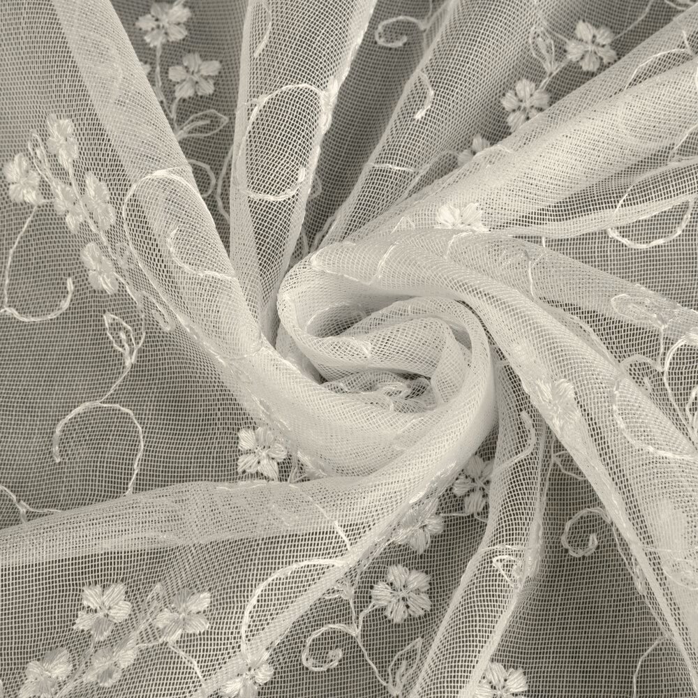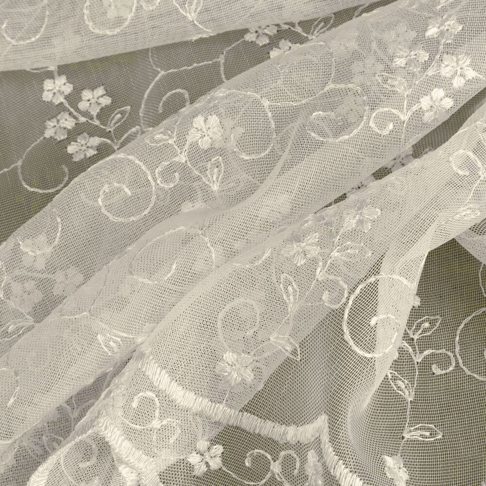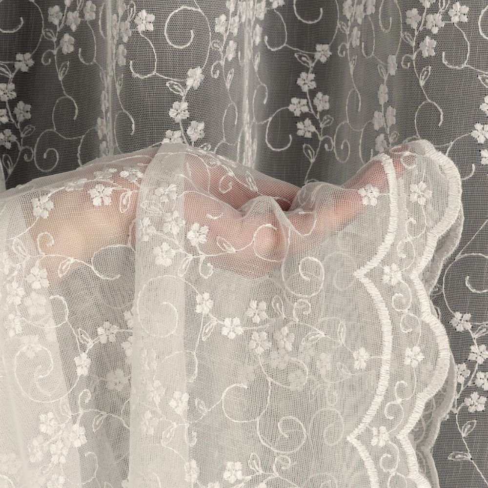 Wzór haftowanych motywów roślinnych wprowadza do pomieszczenia naturalny, elegancki akcent, który pasuje zarówno do kuchni, jak i do salonu, jadalni czy pokoju dziennego. Gęsty, ale lekki haft tworzy wrażenie intymności, nie ograniczając przy tym widoczności ani dopływu światła.