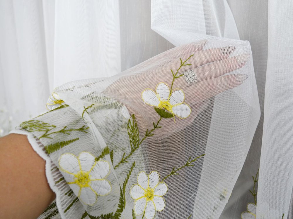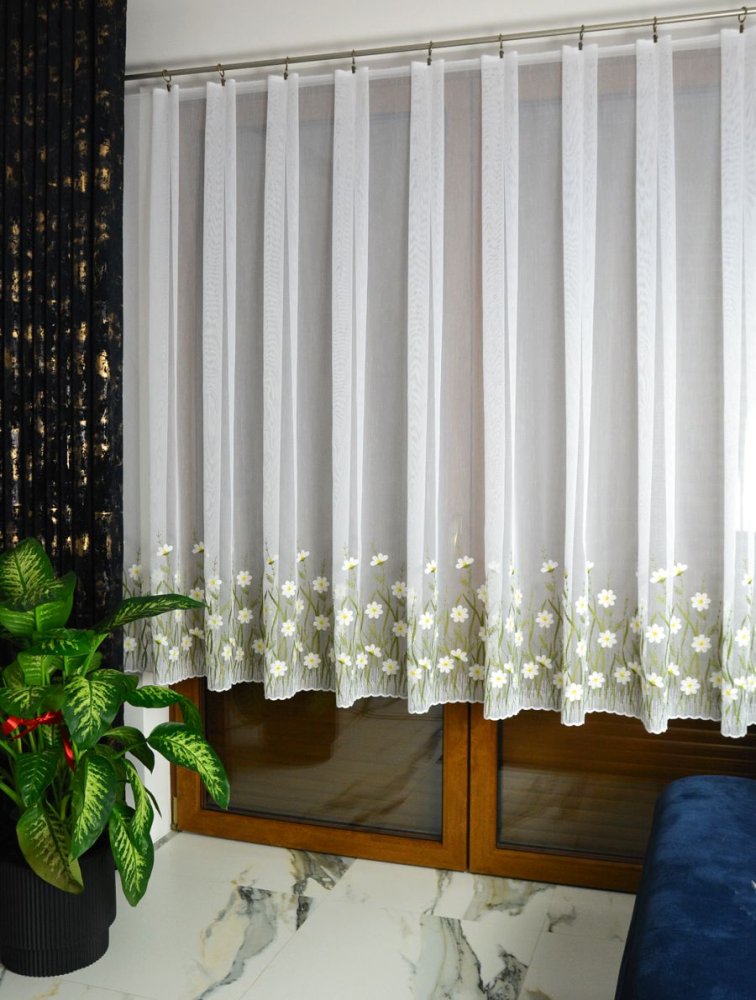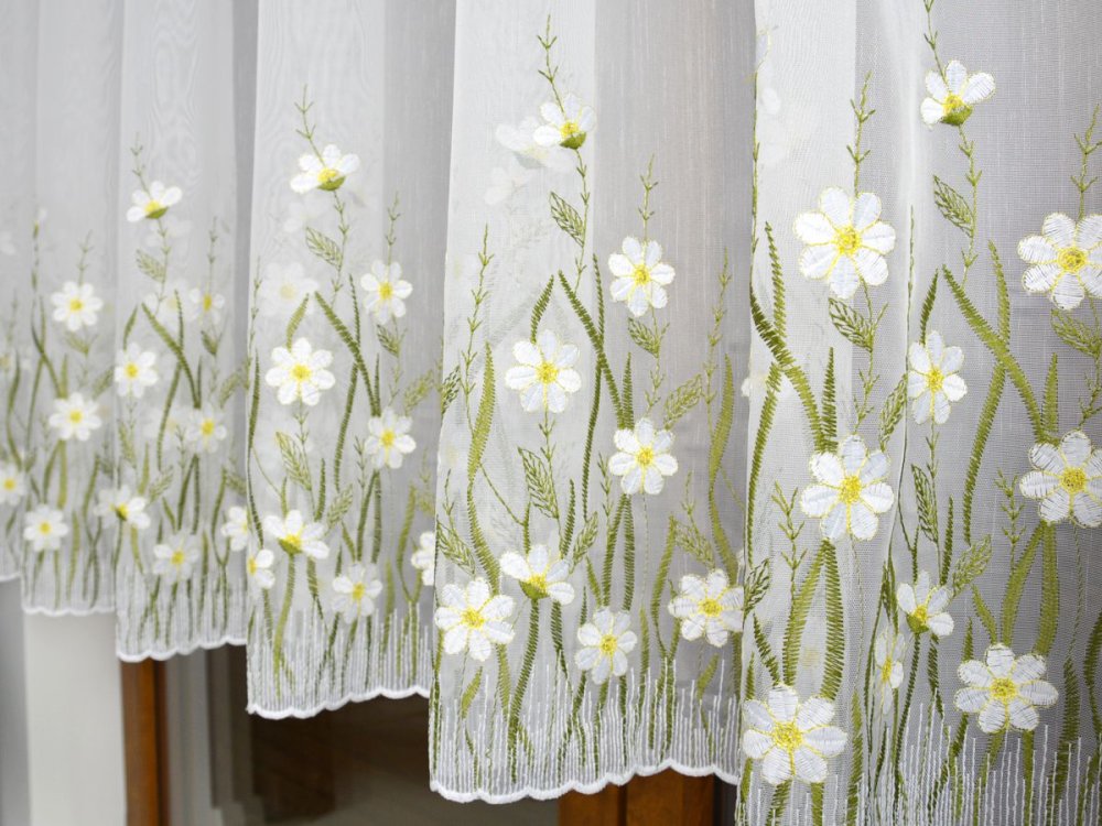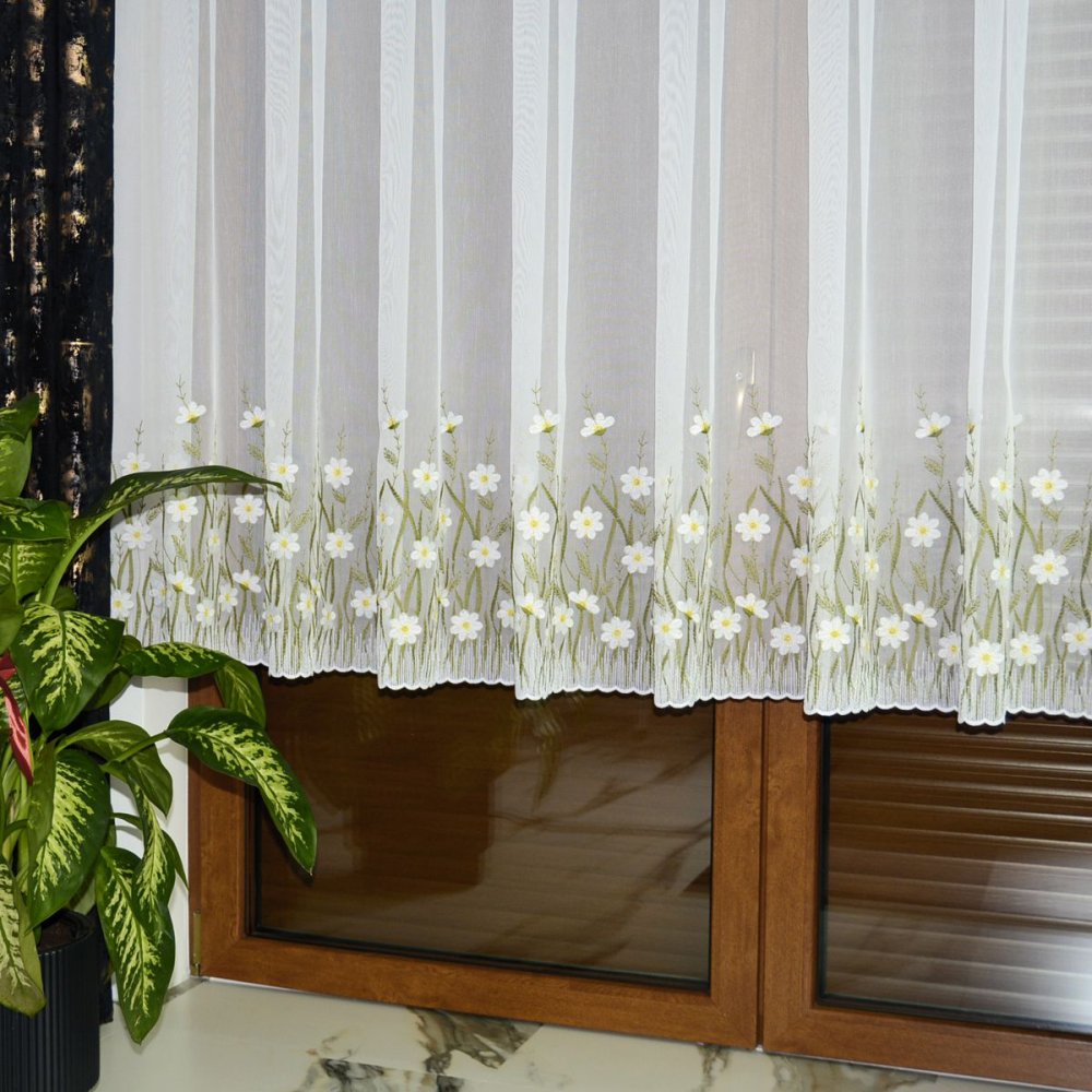 Firana STOKROTKA 170 cm to krótka, jasna firanka zaprojektowana z myślą o wnętrzach, w których dekoracja okna ma wprowadzać świeżość i przytulny charakter bez ograniczania światła dziennego. Bazą jest markizeta typu ADEN (tzw. firana bambusowa) o subtelnym efekcie „deszczyku”, który nadaje tkaninie miękkość wizualną i naturalny wygląd. Dolną część zdobi kolorowy haft przedstawiający łąkę kwitnących stokrotek w biało-zielonej tonacji, wykonany z wysoką precyzją i równomiernym kryciem nici.