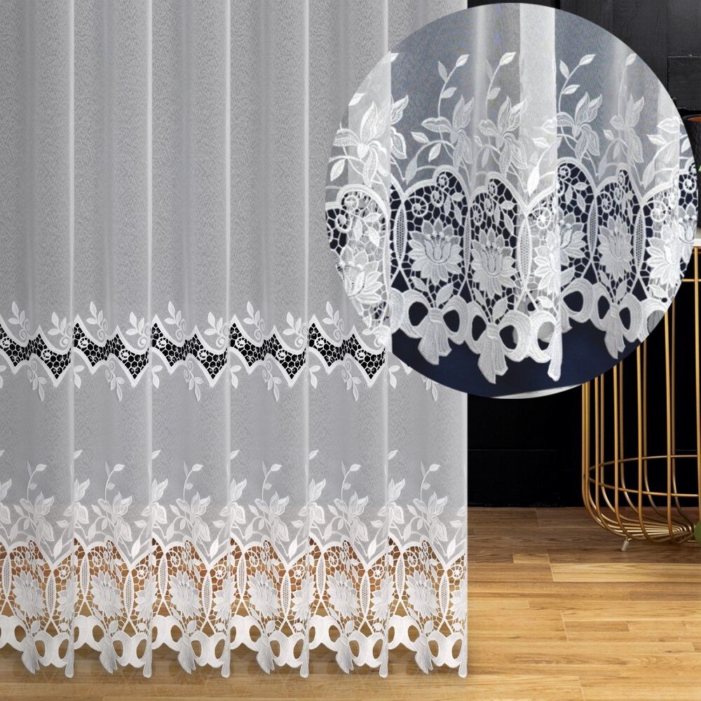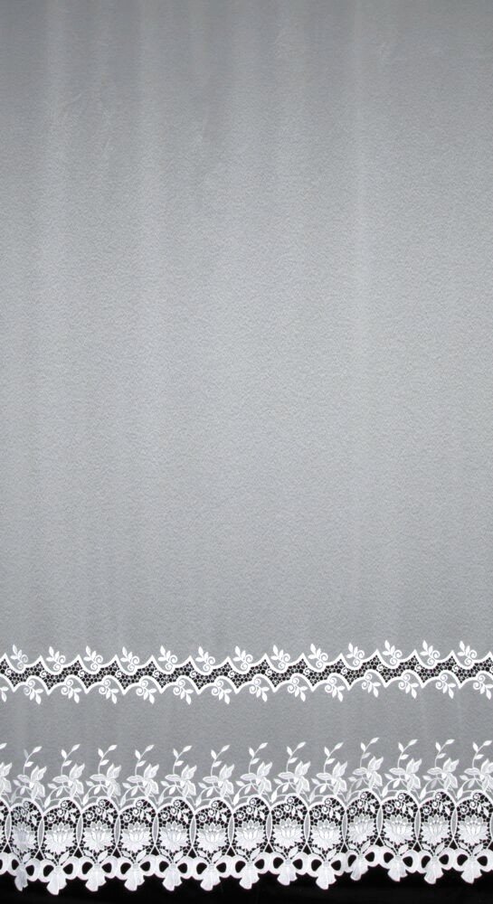 KOKARDKI to elegancka, krótka firana z markizety w klasycznej bieli, subtelnie wykończona dwoma szlakami gipiury o delikatnym wzorze kokardek. Dzięki wysokości 1,75 m jest idealna na skrzydło okienne w kuchni, jadalni, salonie czy domowym gabinecie.