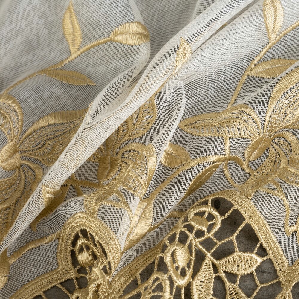 Markizeta posiada delikatną, półprzezroczystą strukturę, układa się w miękkie fale i nie wymaga prasowania — wystarczy zawiesić. Gipiura w kolorze starego złota dodaje wyrafinowania, subtelnie akcentuje dekorację okna i wprowadza elegancki akcent w pomieszczeniu.