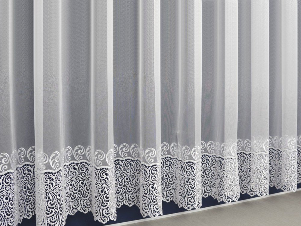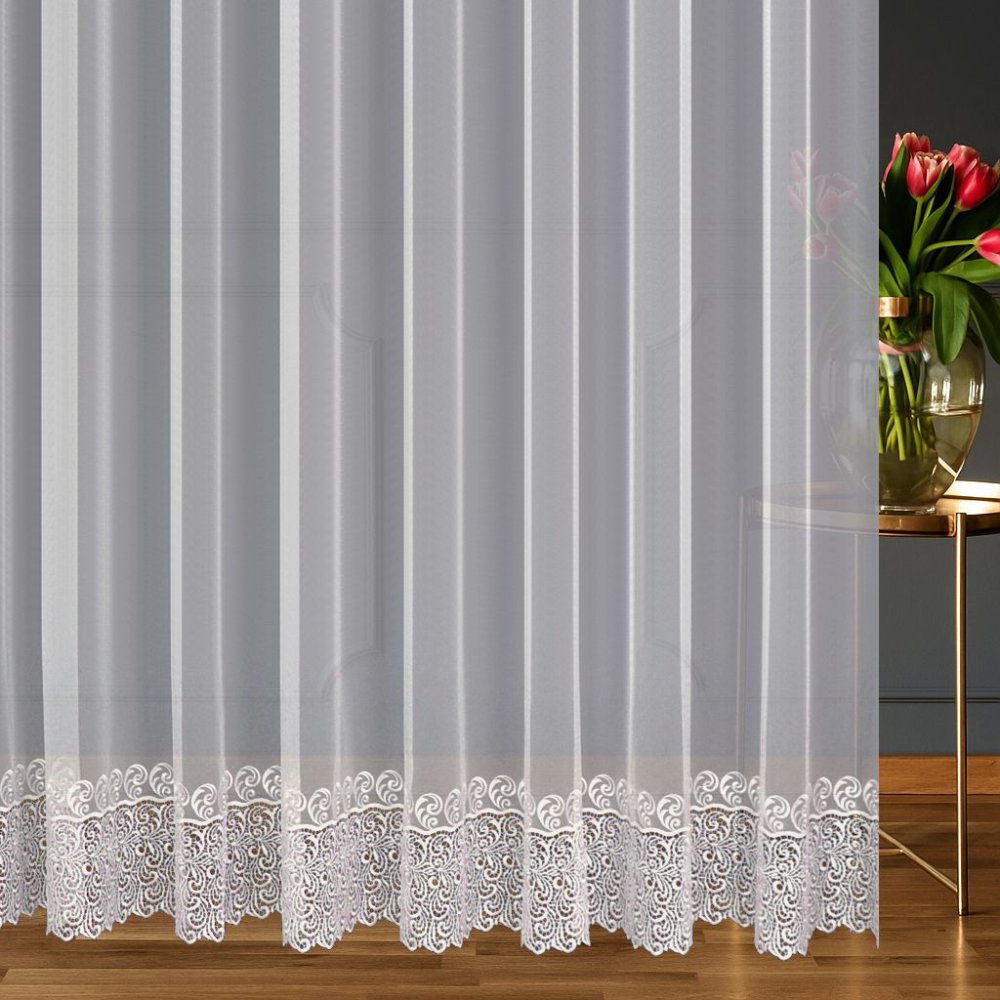 Dekoracyjny element w dolnej części firany nadaje jej charakteru bez przytłaczania całej kompozycji.