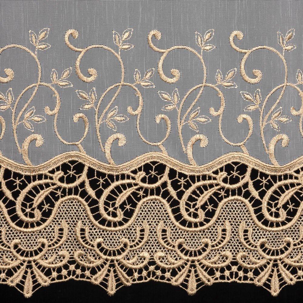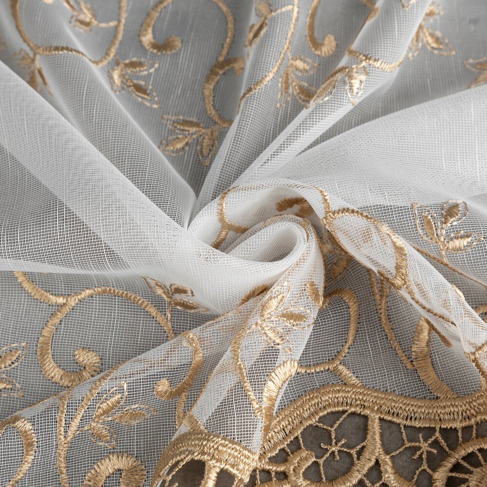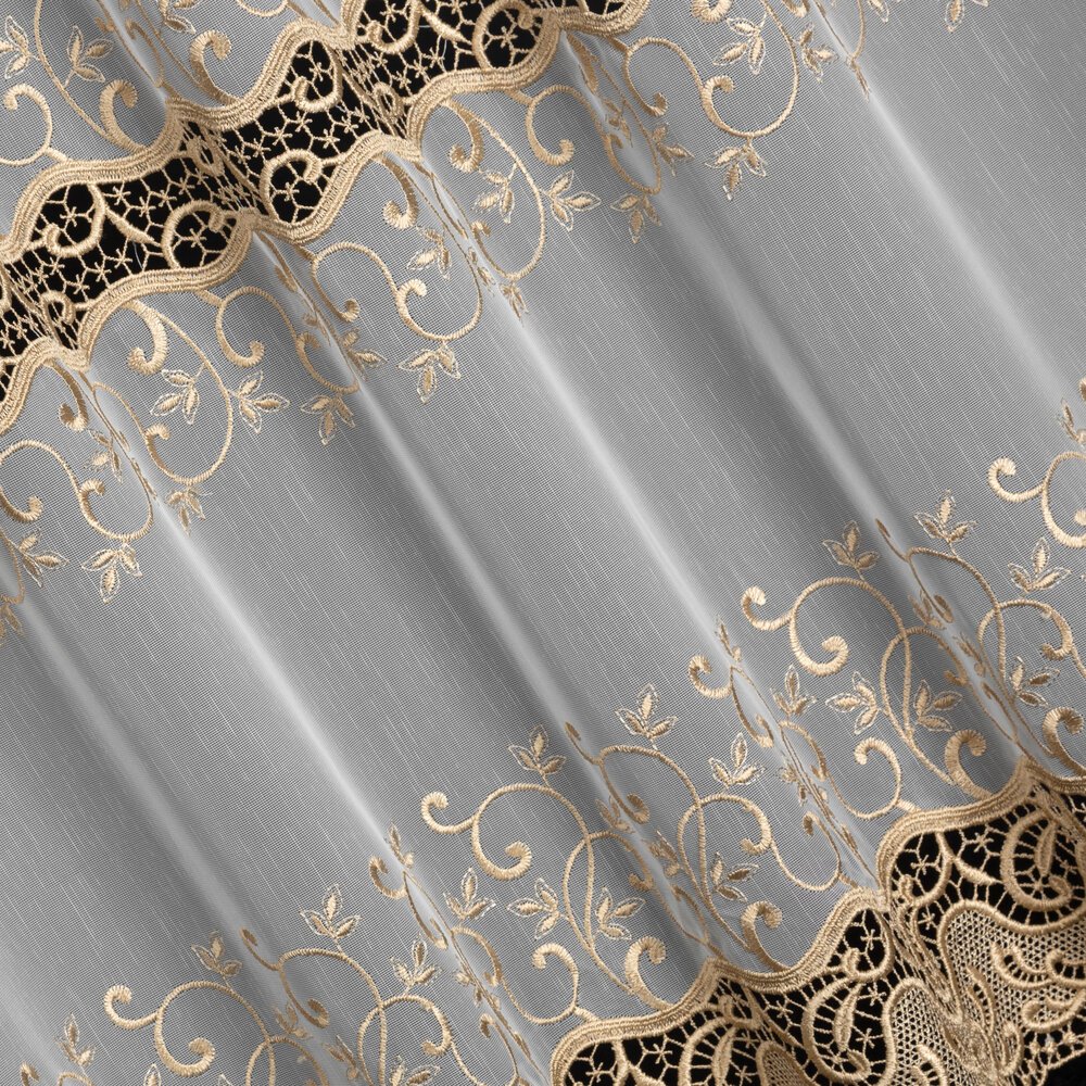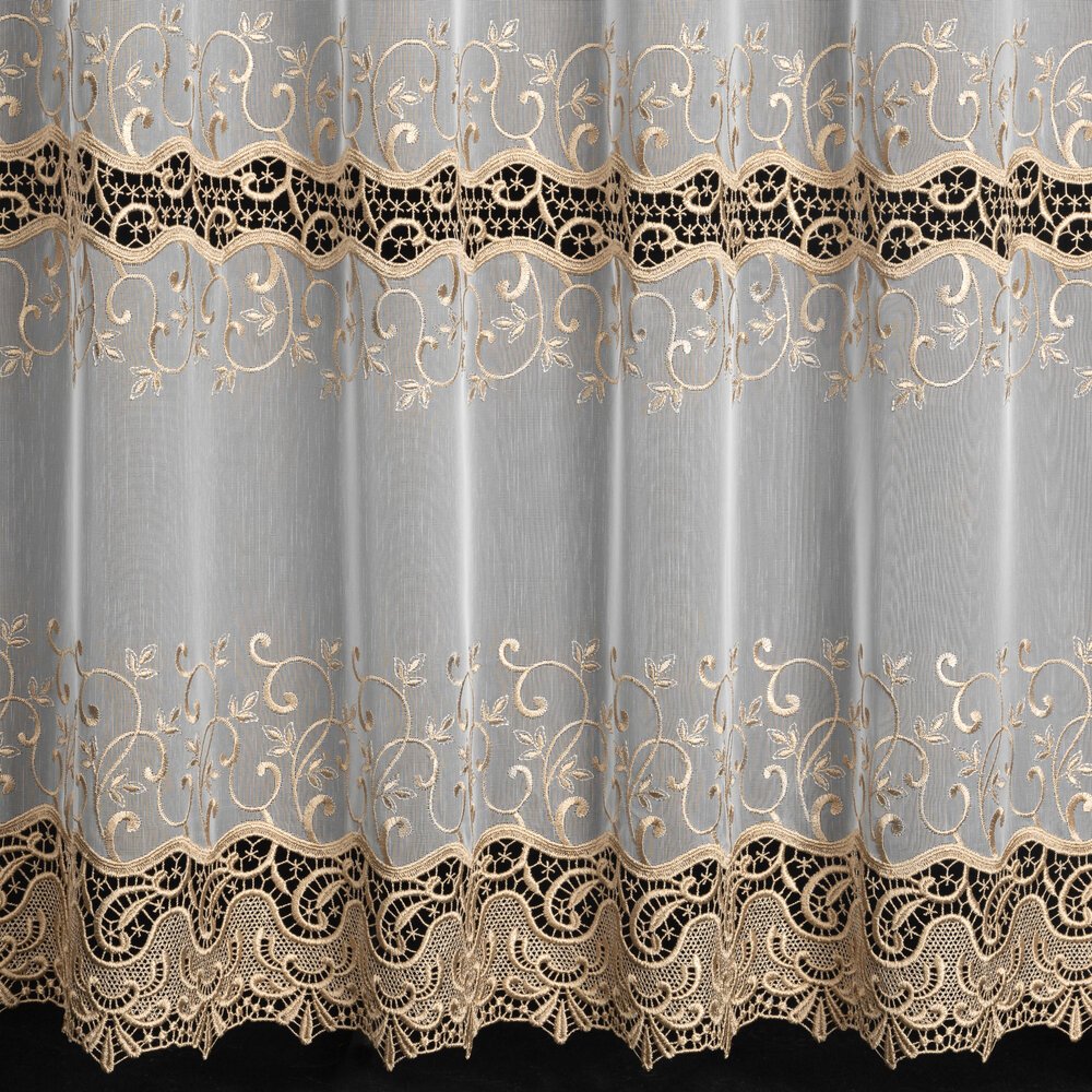 Firana VERBA to elegancka firana wykonana z matowej markizety typu aden (potocznie zwanej bambusem), ozdobiona dwoma pasami wyrazistej gipiury w kolorze starego złota, które dodają jej stylowego charakteru. Delikatna tkanina pięknie się układa i zapewnia półprzezroczysty efekt, dzięki czemu wnętrze jest jasne, ale zachowuje przytulność i prywatność.