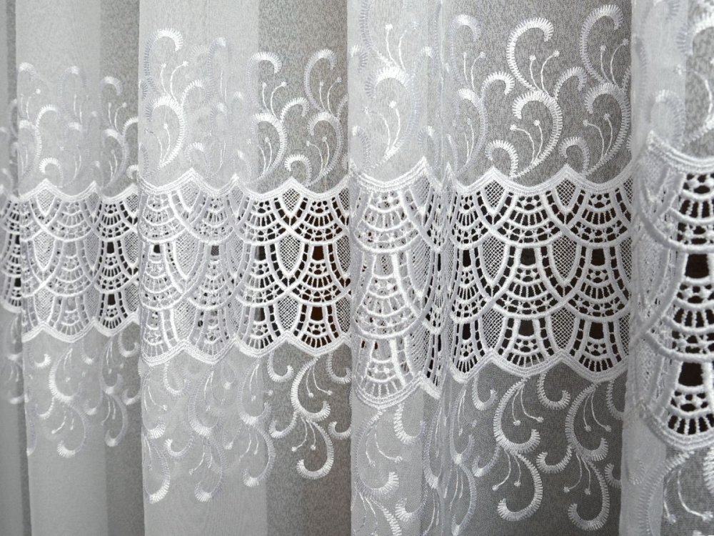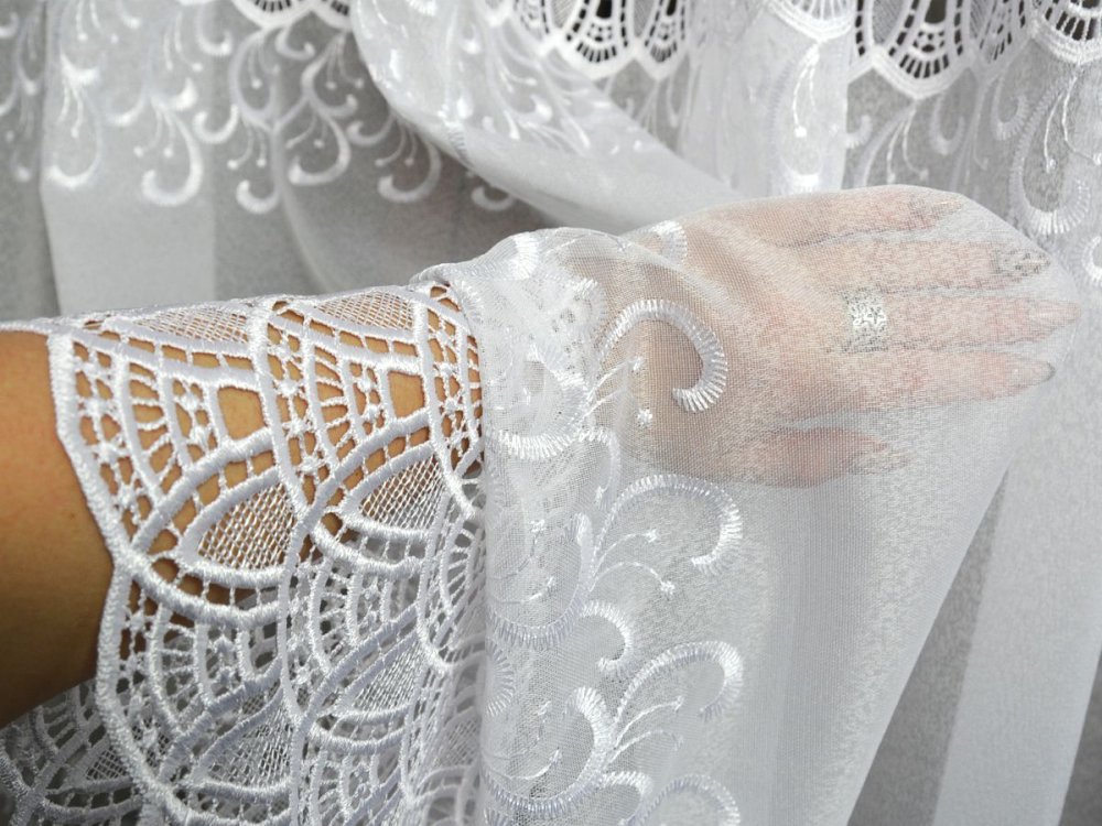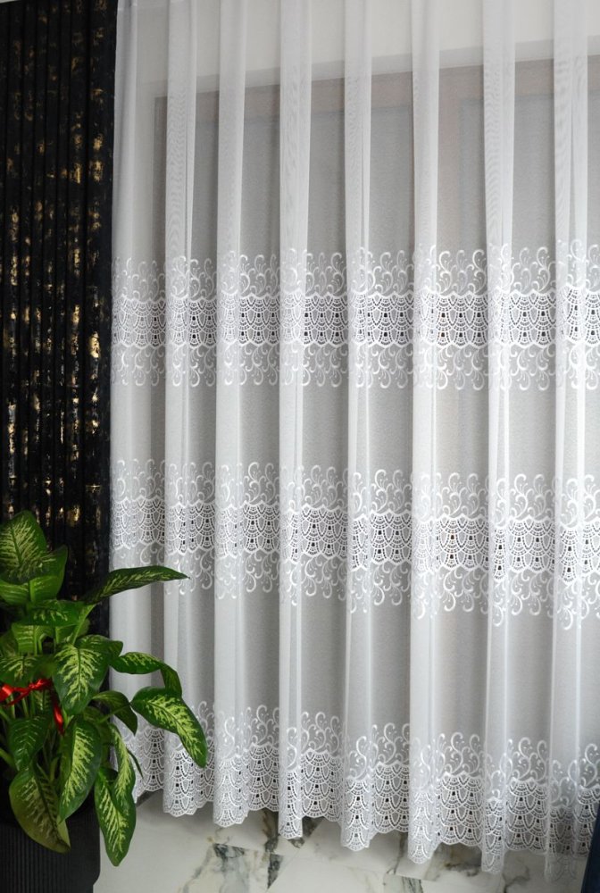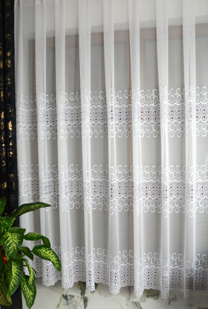 Firana BASKO 265 cm to model o wyraźnie dekoracyjnym charakterze, zaprojektowany dla wnętrz wymagających eleganckiej oprawy okna bez stosowania ciężkich tkanin. Bazą jest klasyczna markizeta o delikatnym splocie typu „deszczyk”, która równomiernie filtruje światło i nadaje tkaninie miękką pionowość. Dolna i środkowa część firany została wzbogacona trzema szerokimi szlakami gipiury o gęstym, wyrazistym wzorze, co buduje efekt luksusu i wizualnej głębi.