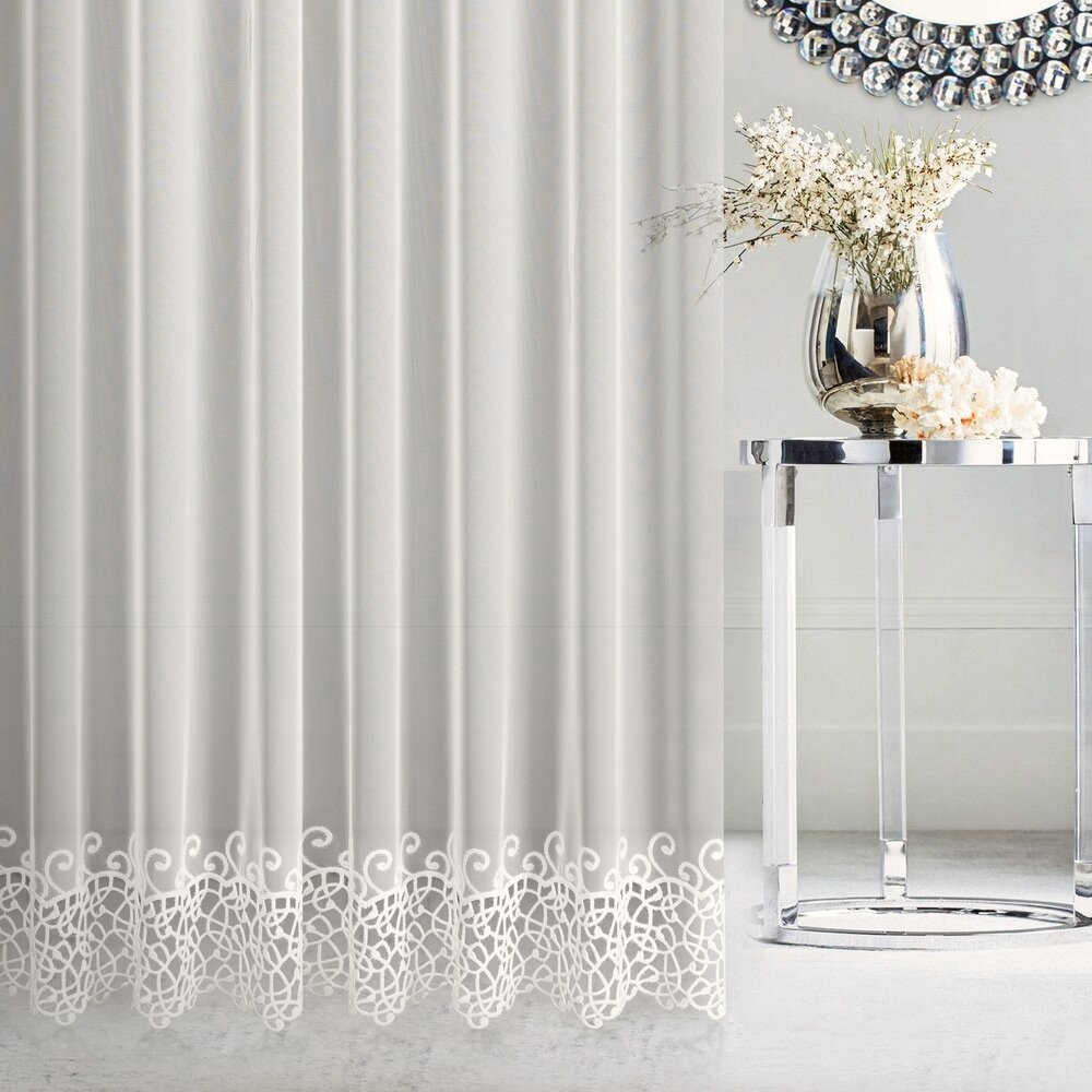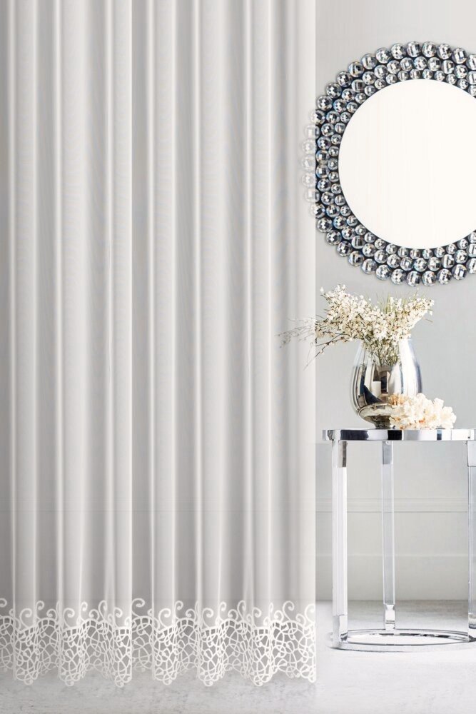 Dół firany tworzy efektowną, ozdobną linię, nadając wnętrzu lekkości i elegancji w stylu glamour. SCILLA doskonale prezentuje się zarówno jako samodzielna dekoracja, jak i w zestawieniu z zasłonami – szczególnie tymi z miękkiego, połyskującego welwetu.
