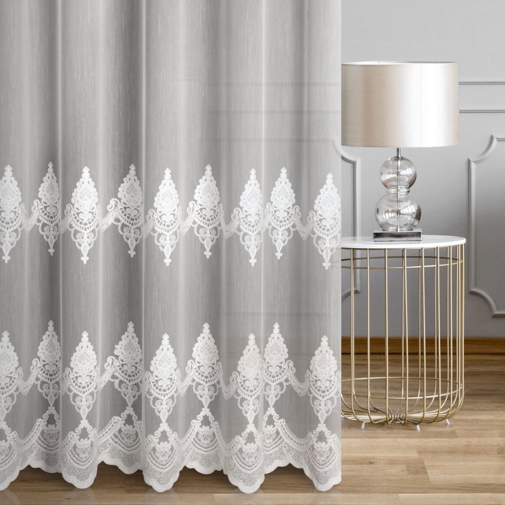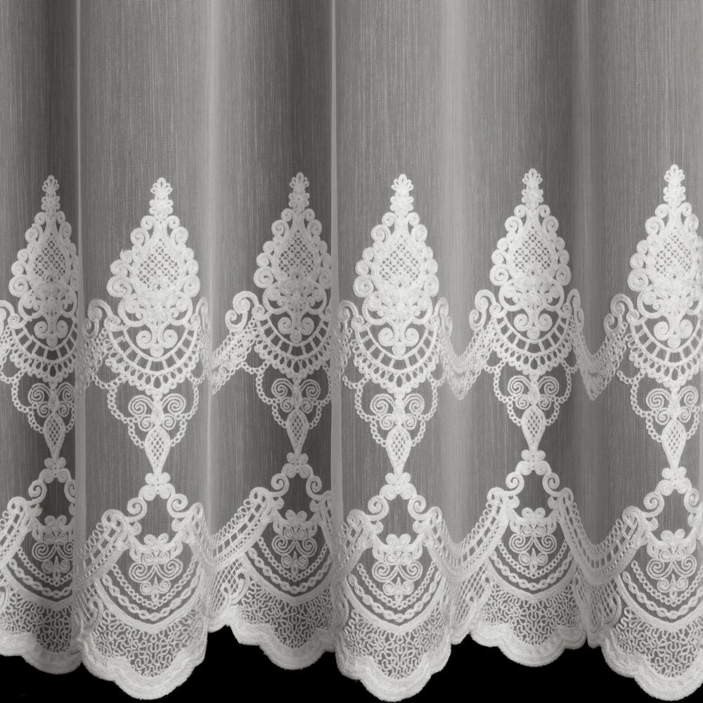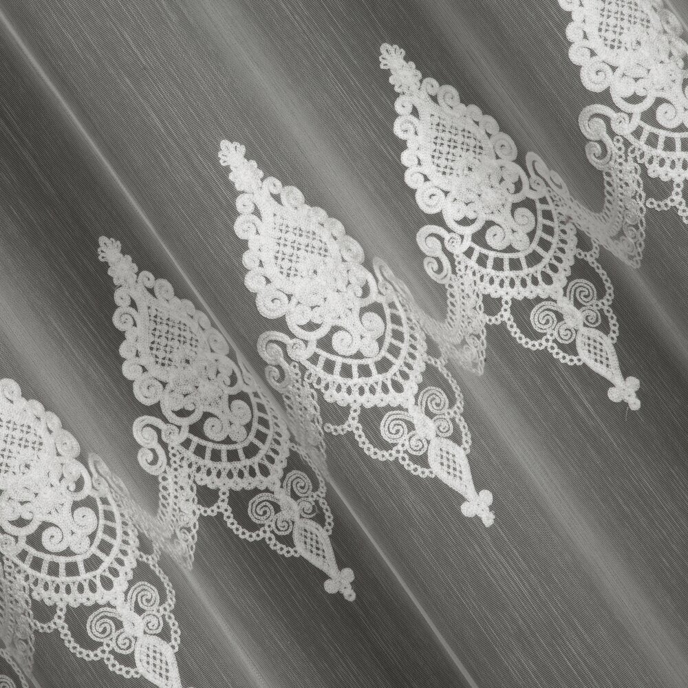 Dolną część firany zdobi okazały haft łańcuszkowy w formie ornamentów ułożonych w podwójnym szlaku, zakończony delikatnymi ząbkami. Subtelny połysk i dopracowany detal nadają firanie wyjątkowo królewski charakter – w pełni zasługujący na miano kolekcji ROYAL.