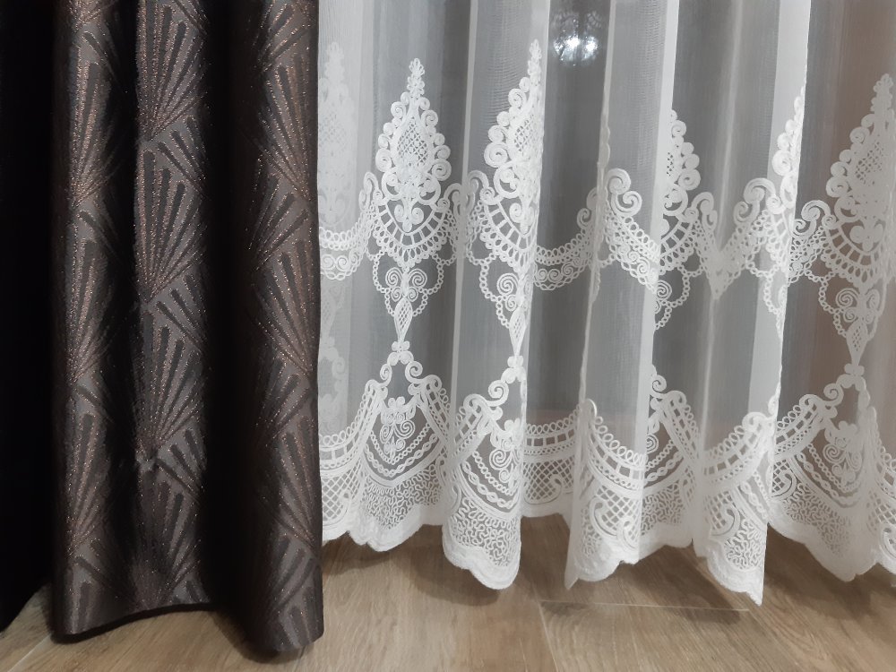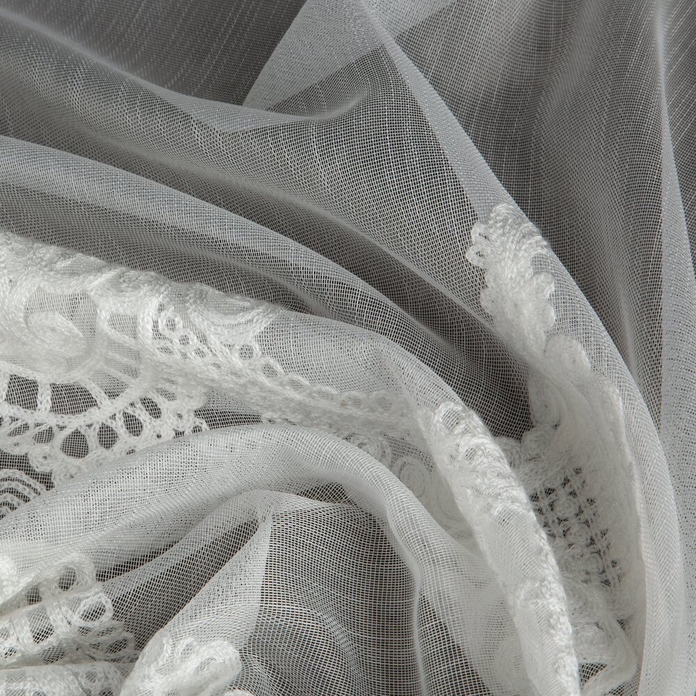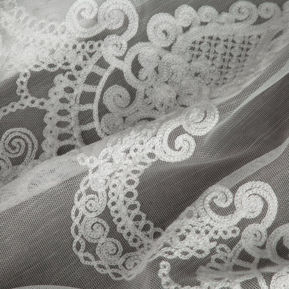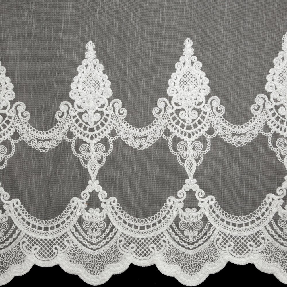 Dolną część firany zdobi okazały haft łańcuszkowy w formie ornamentów ułożonych w podwójnym szlaku, zakończony delikatnymi ząbkami. Subtelny połysk i dopracowany detal nadają firanie wyjątkowo królewski charakter – w pełni zasługujący na miano kolekcji ROYAL.