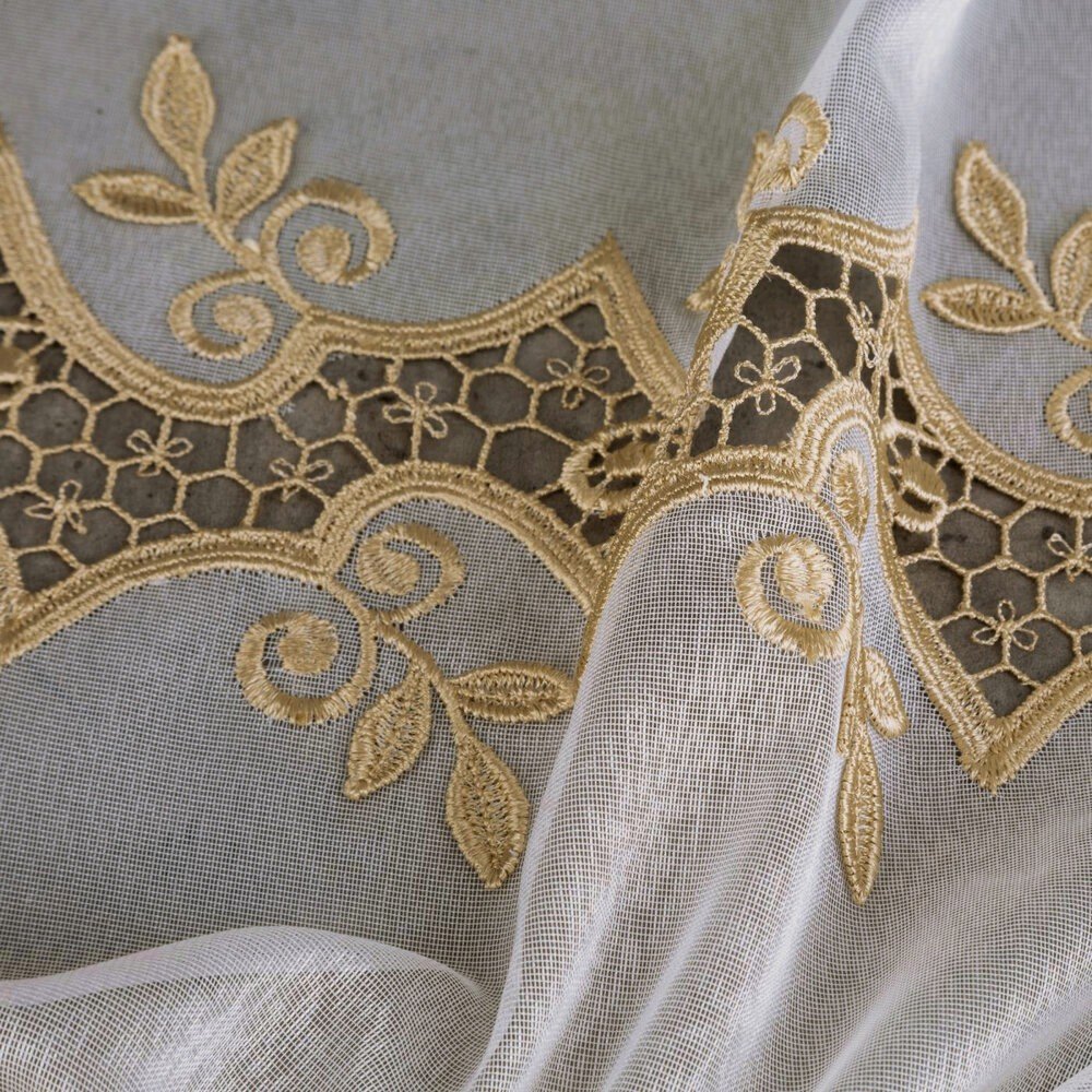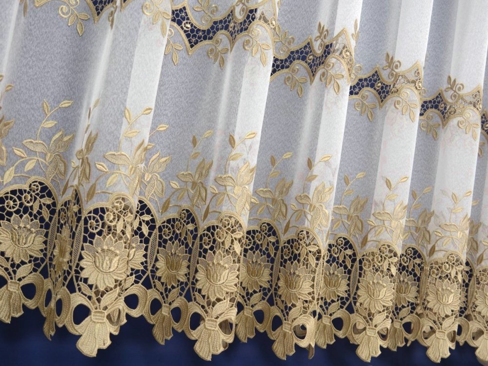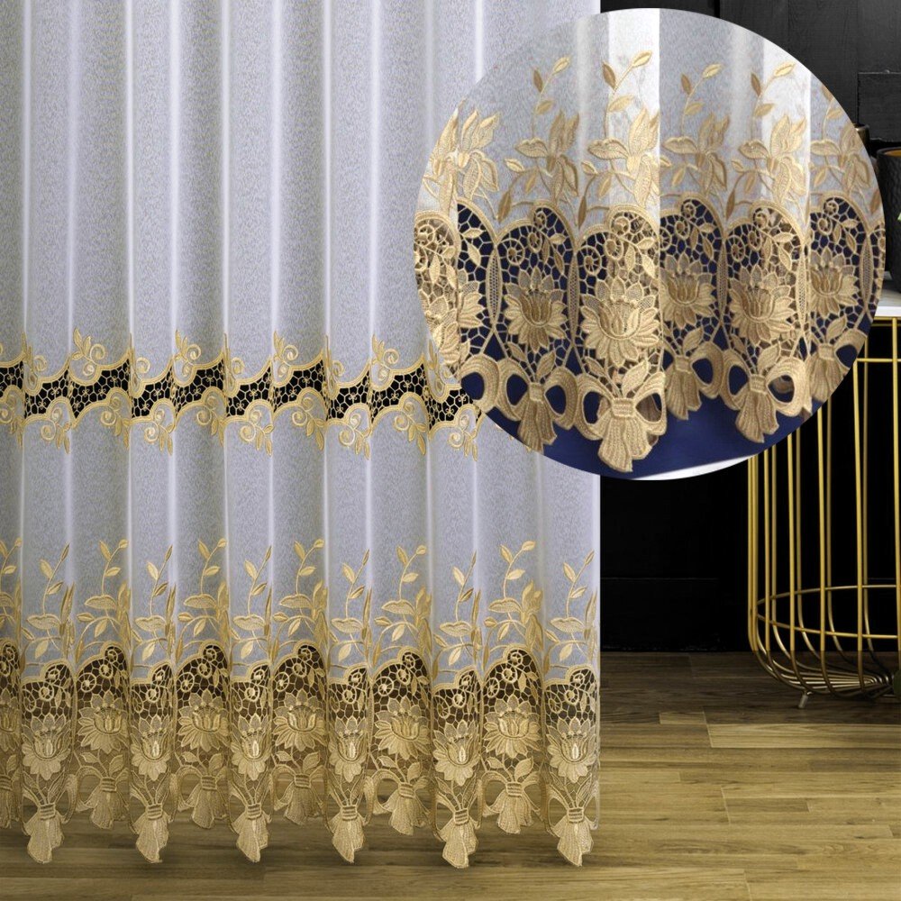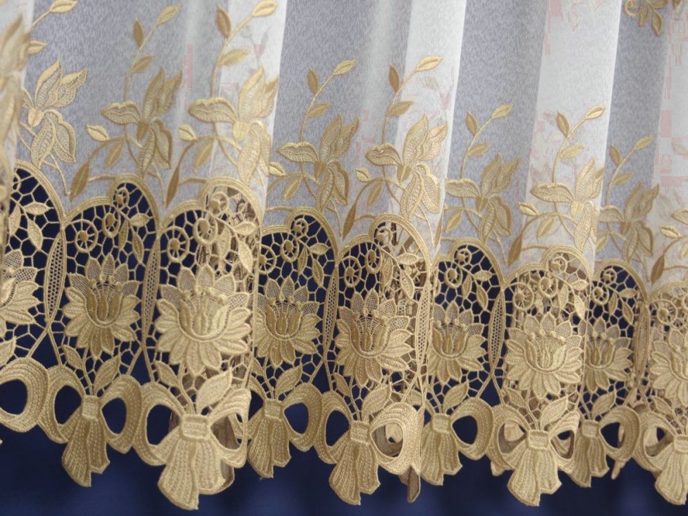 Firana z gipiurą KOKARDKI – Krem/Stare Złoto o wysokości 2,90 m to efektowna, długa firana z markizety w kolorze czystej bieli z elegancką gipiurą w kolorze starego złota. Model idealny na drzwi balkonowe, tarasowe lub wysokie okna w salonie, gdzie dekoracja będzie widoczna zarówno od środka, jak i na zewnątrz.