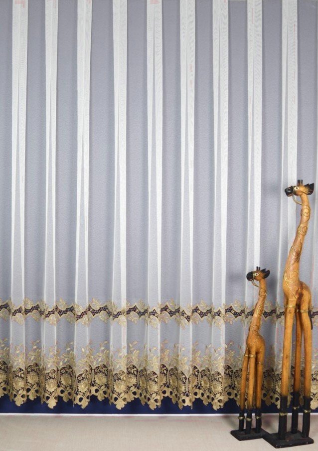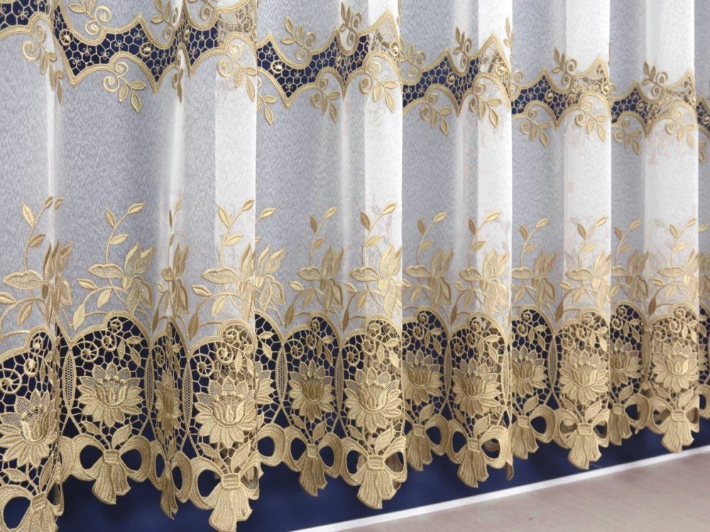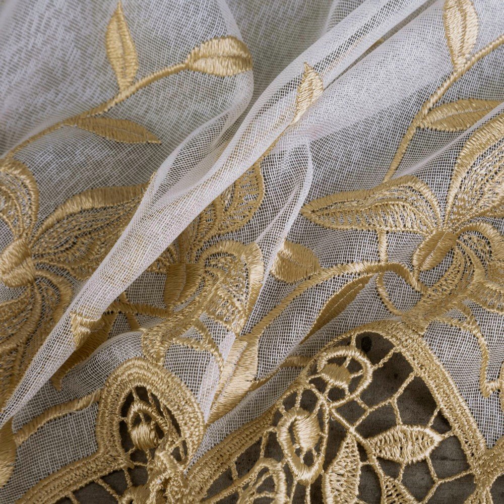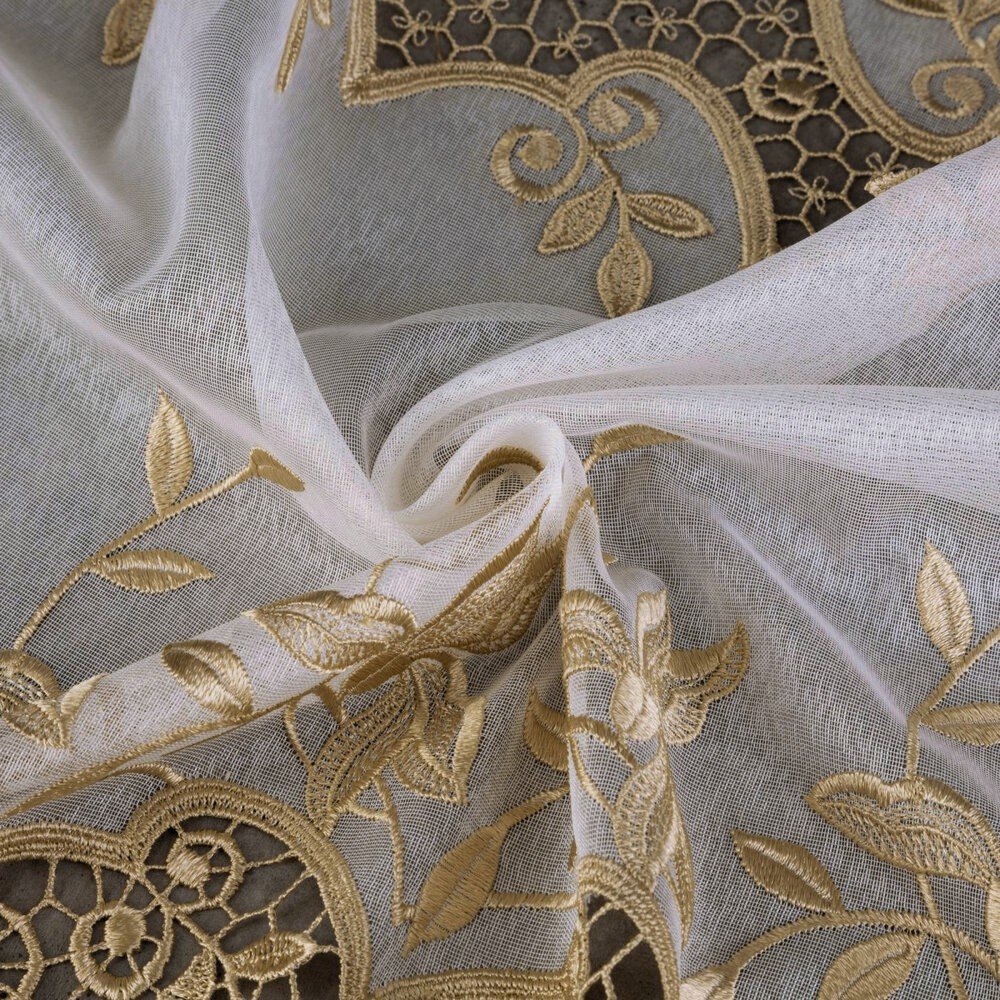 Firana z gipiurą KOKARDKI – Krem/Stare Złoto o wysokości 2,90 m to efektowna, długa firana z markizety w kolorze czystej bieli z elegancką gipiurą w kolorze starego złota. Model idealny na drzwi balkonowe, tarasowe lub wysokie okna w salonie, gdzie dekoracja będzie widoczna zarówno od środka, jak i na zewnątrz.