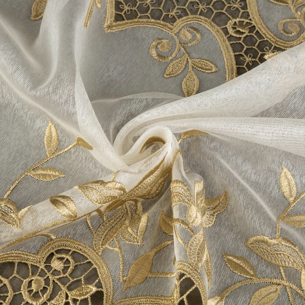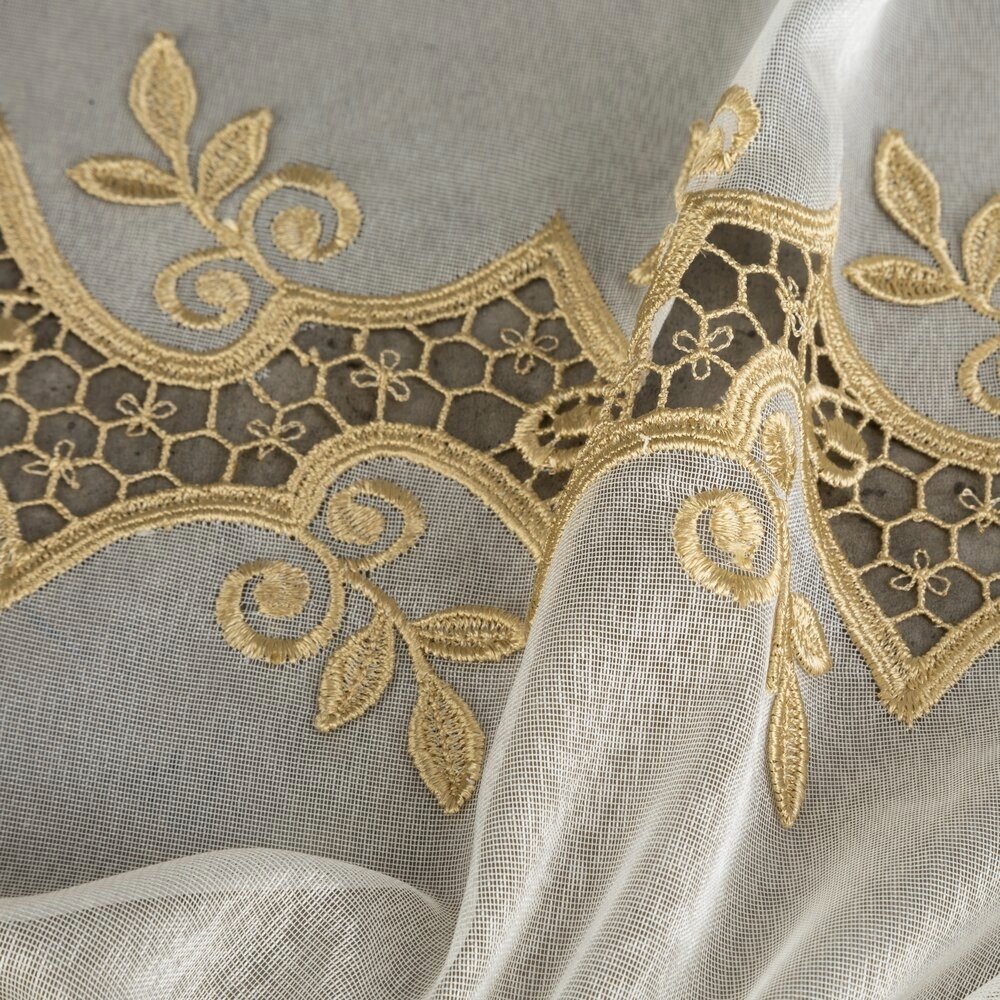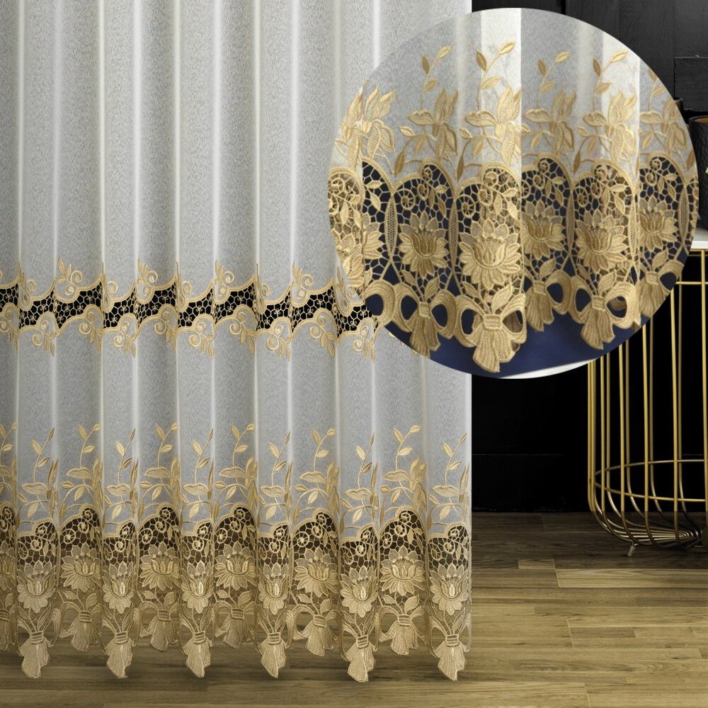Firana z gipiurą KOKARDKI – Krem/Stare Złoto o wysokości 2,90 m to efektowna, długa firana z markizety w kolorystyce kremowej z elegancką gipiurą w kolorze starego złota. Model idealny na drzwi balkonowe, tarasowe lub wysokie okna w salonie, gdzie dekoracja będzie widoczna zarówno od środka, jak i na zewnątrz.