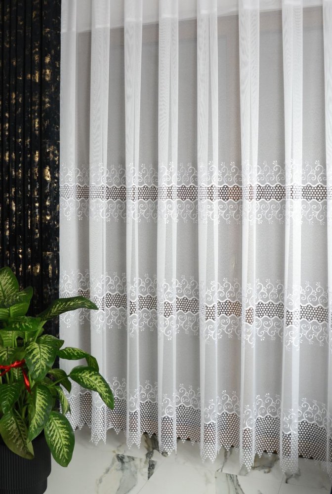 Firana ADRIA to propozycja dla osób, które szukają ponadczasowej elegancji bez konieczności prasowania. Wykonana z wysokiej jakości markizety tureckiej produkcji, wyróżnia się trzema dekoracyjnymi szlakami gipiury oraz subtelnym haftem, który nadaje całości luksusowego charakteru. Biała kolorystyka sprawia, że firana doskonale rozświetla wnętrze i pasuje zarówno do nowoczesnych, jak i klasycznych aranżacji.