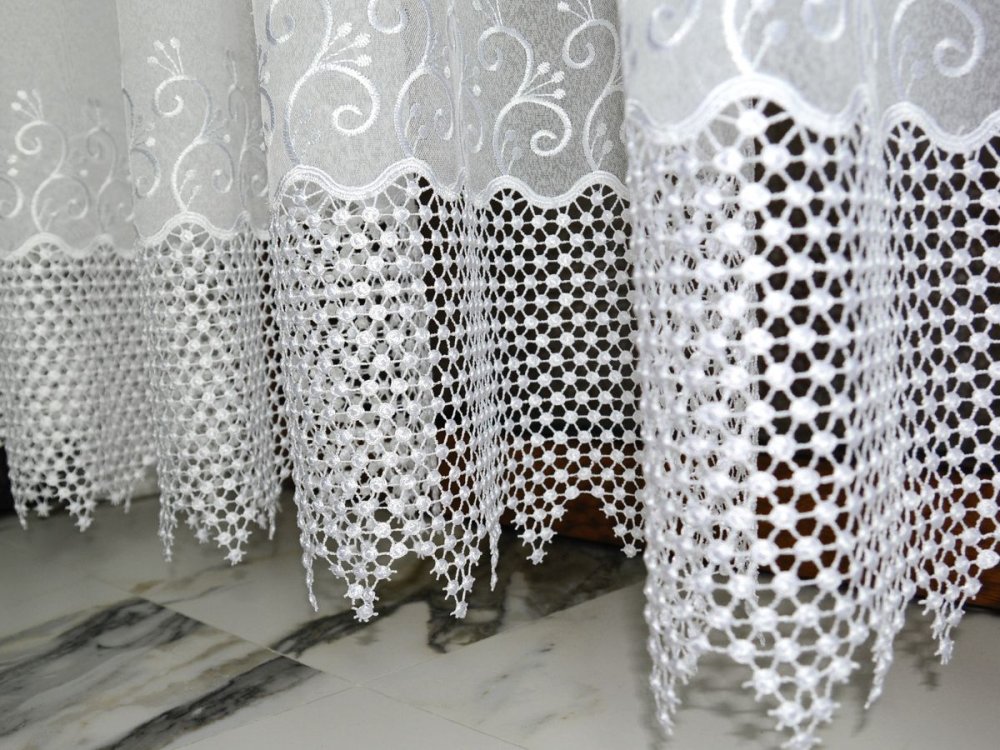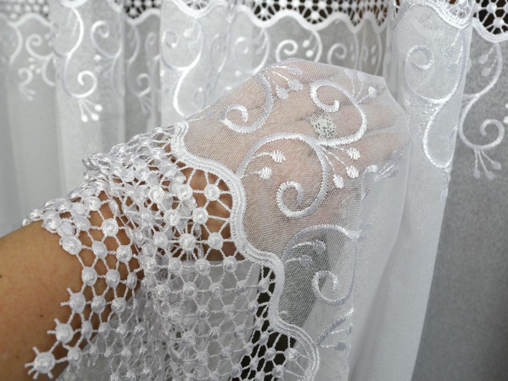 Firana łączy w sobie delikatność tkaniny z wyraźnym, eleganckim wzorem. Gipiura w trzech rzędach buduje efekt dekoracyjny już od dolnej krawędzi, natomiast haftowane przejścia pomiędzy pasami tkaniny nadają głębi i lekkości. Dzięki zastosowaniu markizety materiał pięknie się układa, przepuszcza światło i nie wymaga prasowania po praniu.
