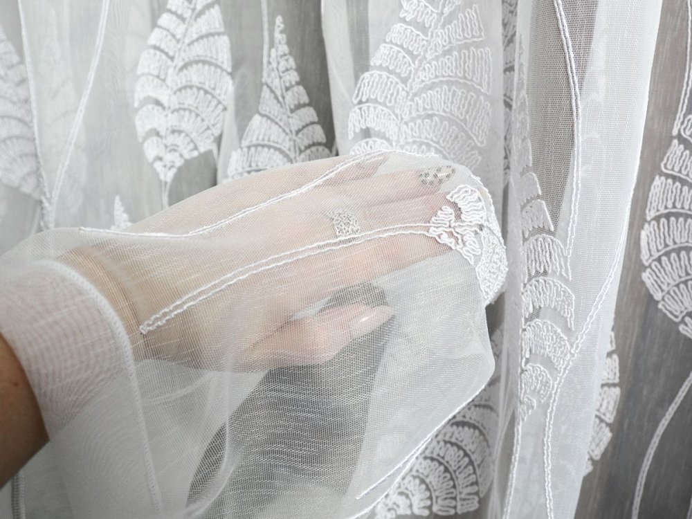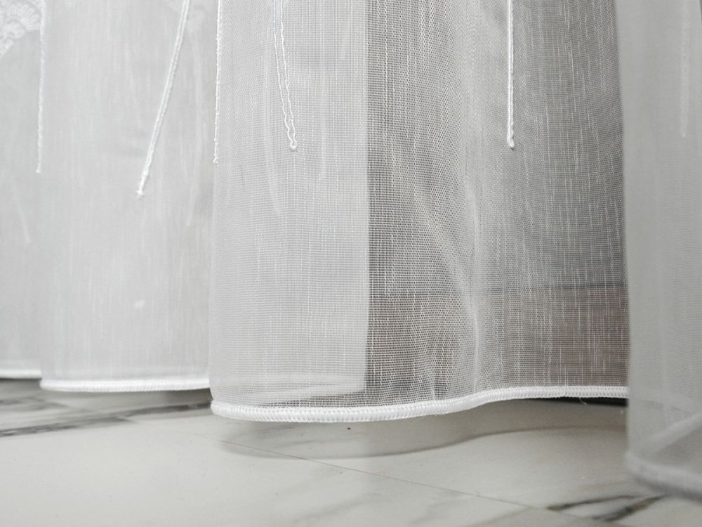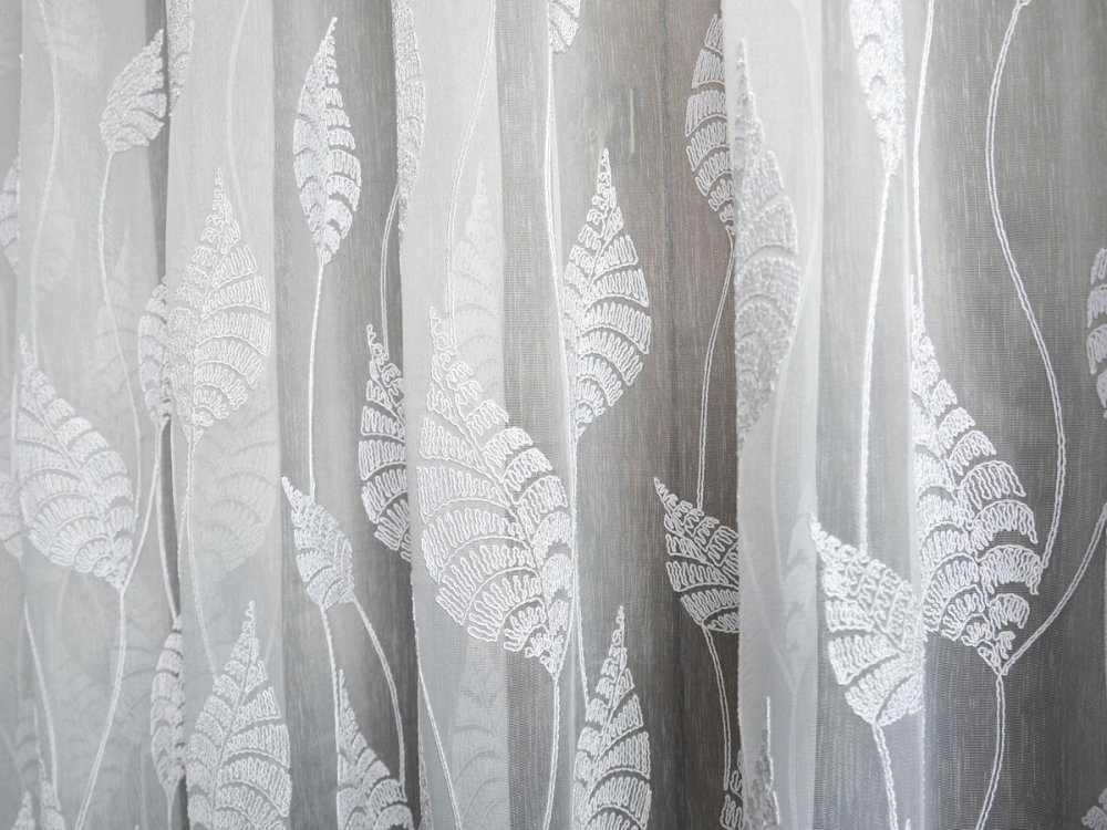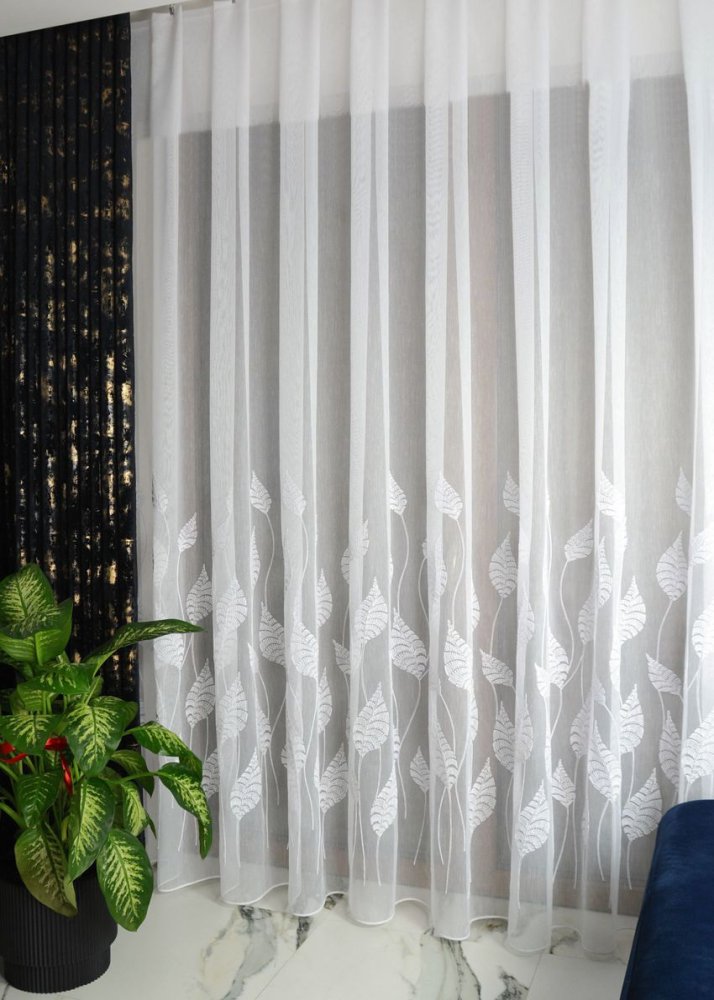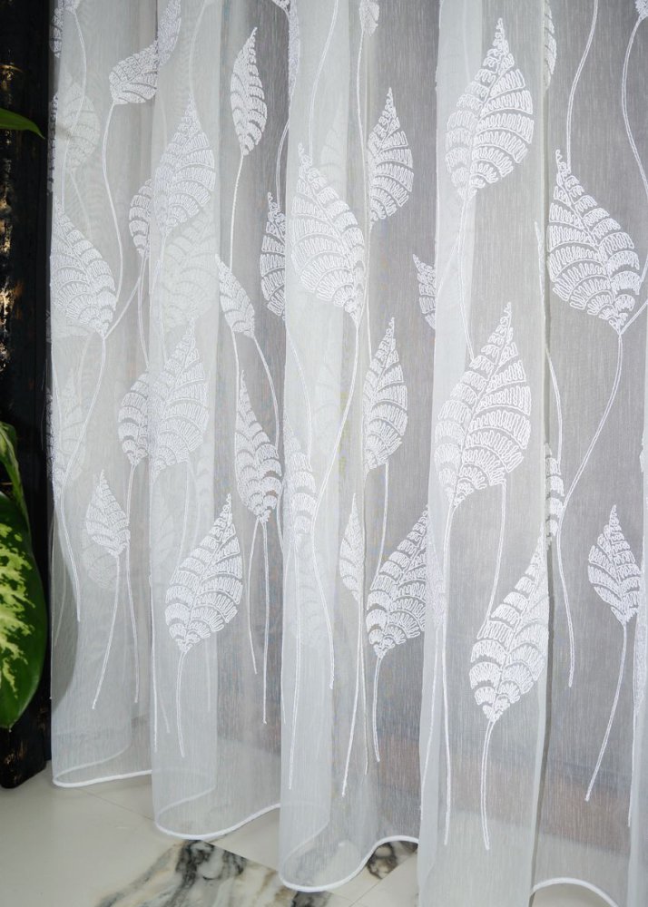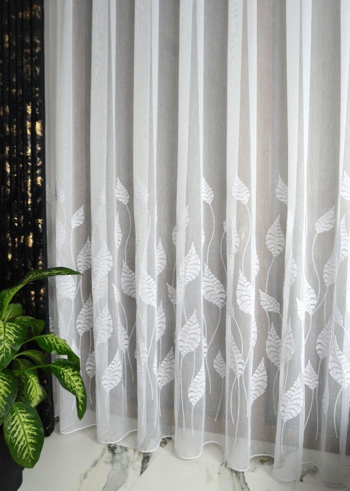 Dolną część firany zdobi oryginalny haft liści bananowca wykonany grubszą, wypukłą nitką, dzięki czemu wzór ma przestrzenność i wyraźny charakter (efekt 3D). Ornamenty są precyzyjnie dopasowane, a ich układ jest estetyczny i powtarzalny, co przekłada się na spójny wygląd na całej szerokości okna.