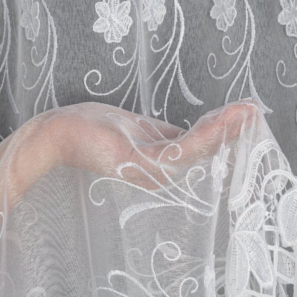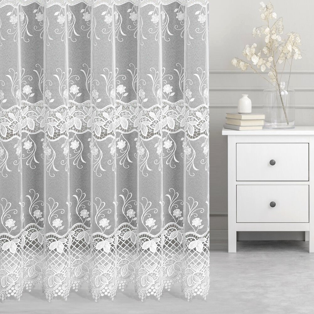 FIONA to elegancka, długa firana z markizety w klasycznej bieli, wykończona trzema szlakami subtelnej gipiury. Dzięki temu układowi, trzeci szlak gipiury jest widoczny w świetle okna, powyżej parapetu, co sprawia, że w drzwiach balkonowych i tarasowych firana prezentuje się w pełnej okazałości zarówno od wewnątrz, jak i na zewnątrz.