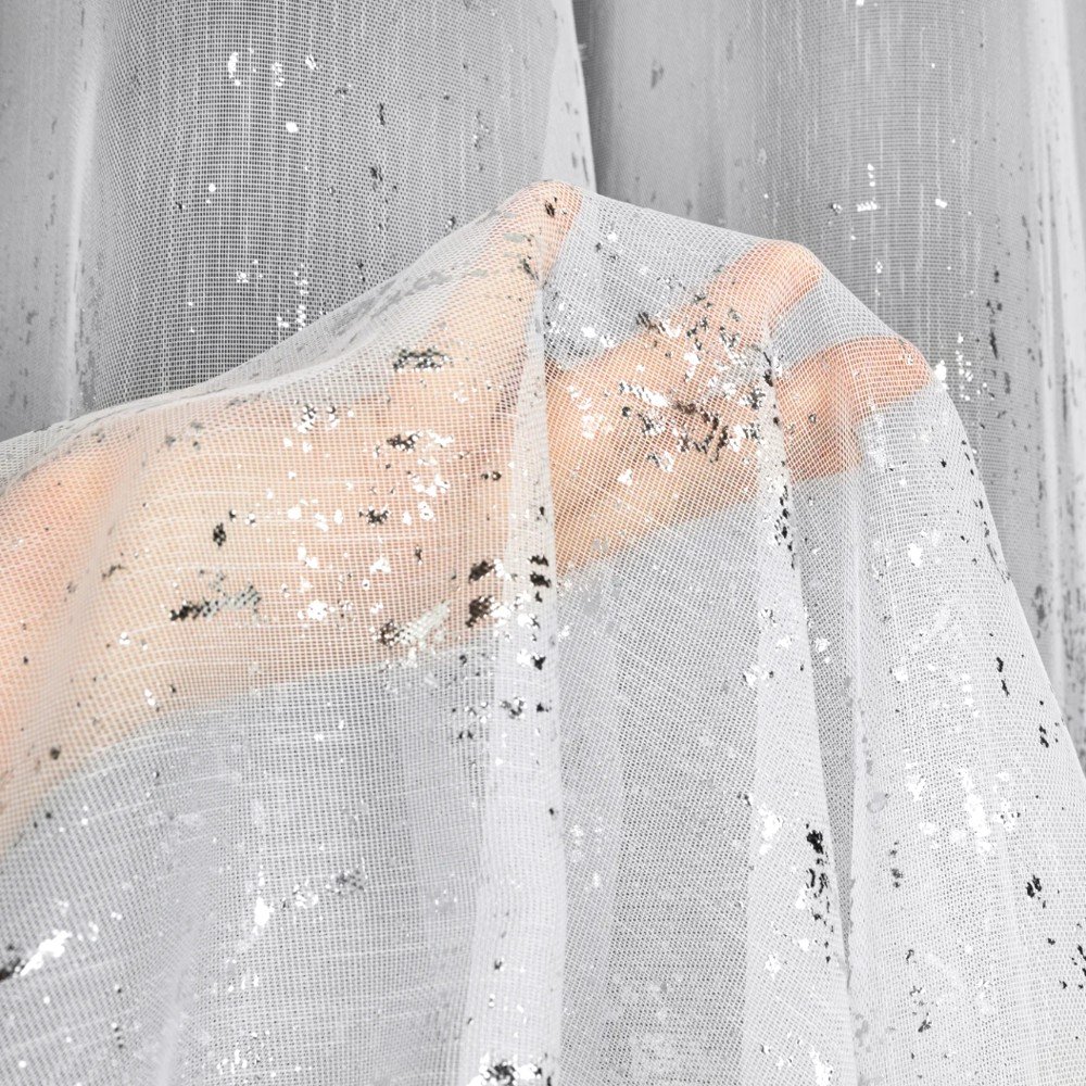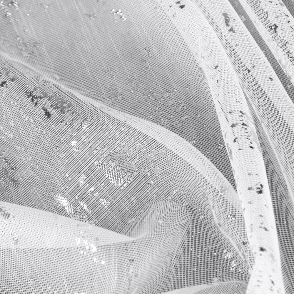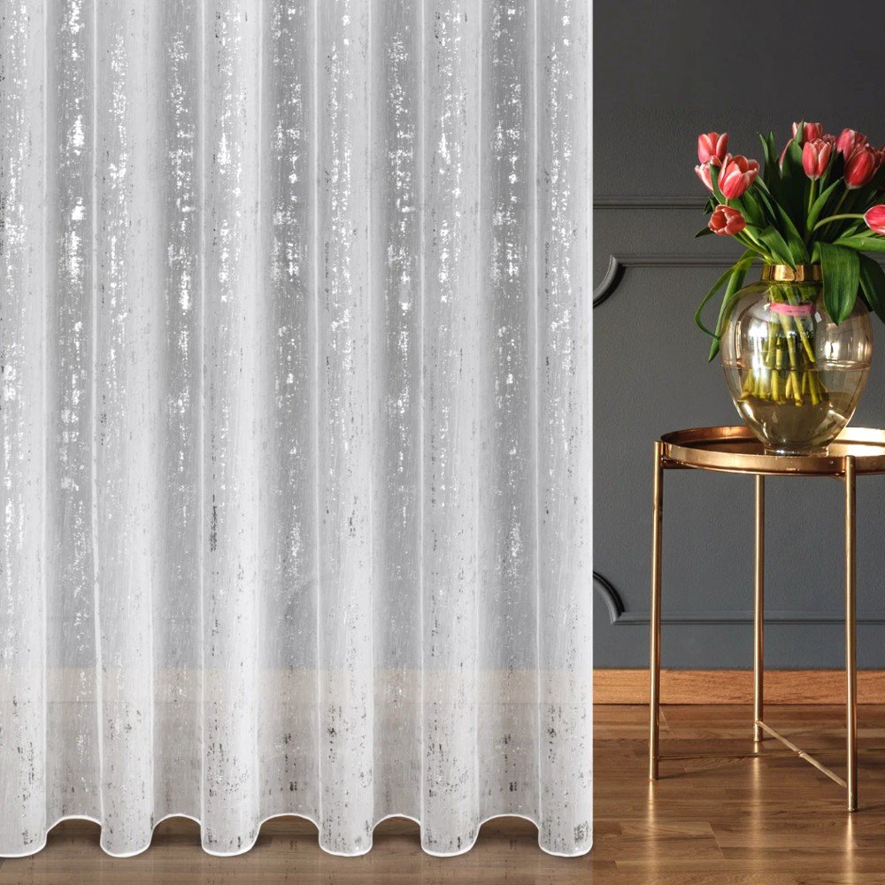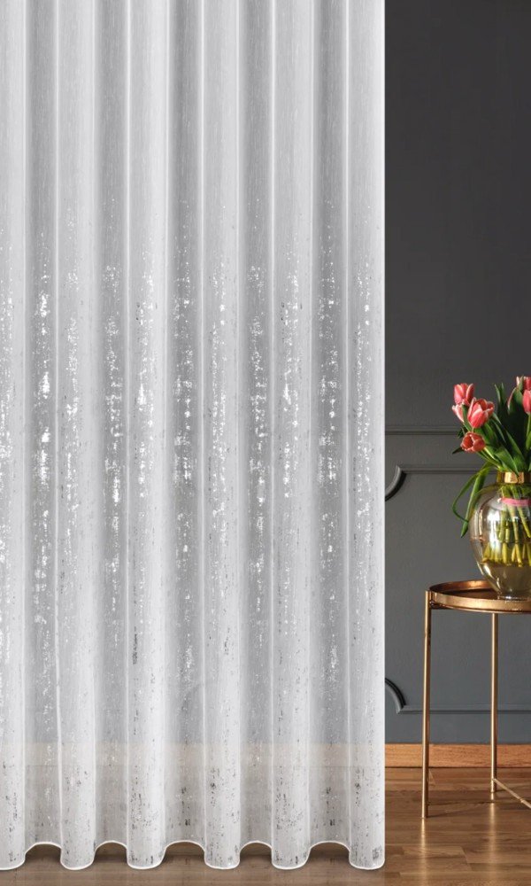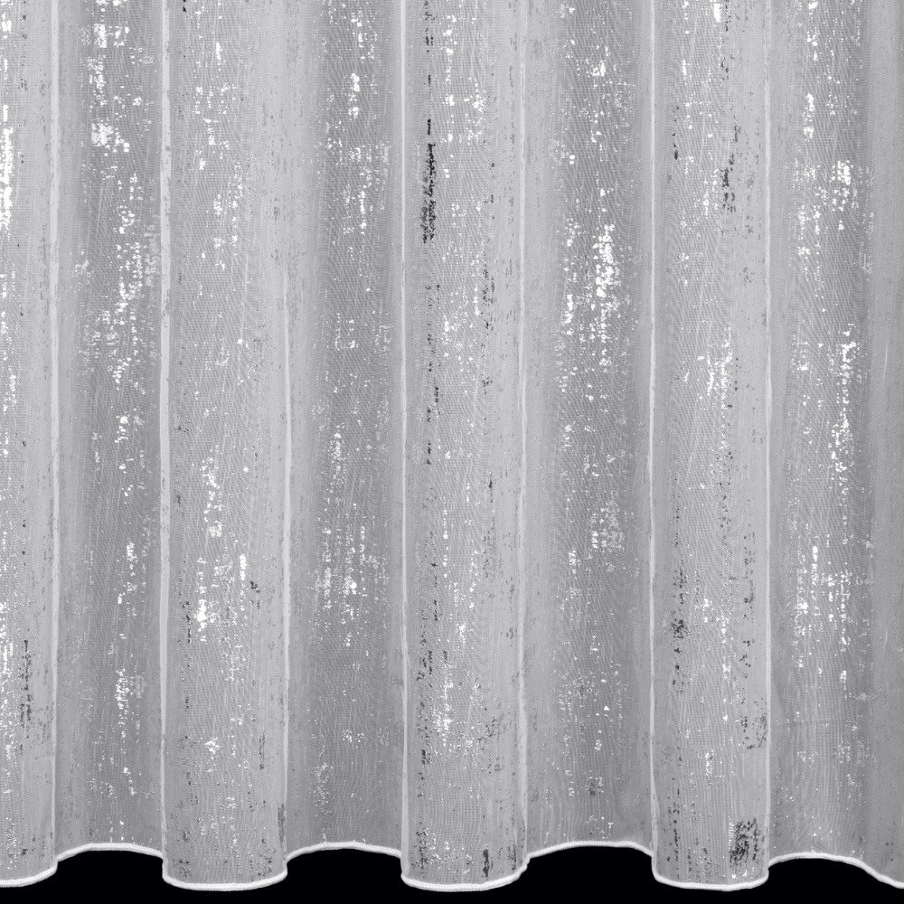 Nowoczesne, długie firany będą ozdobą każdego okna w salonie, jadalni lub sypialni. Nakrapiany, srebrny wzór od dołu firany dodaje blasku oraz charakteru. Firana "MARGOT" wykonana z markizety typu aden potocznie zwanej "bambusem". Firana o zwartej strukturze z delikatnym deszczykiem. Bardzo dobrze przepuszcza światło. Jest bardzo miękka i doskonale się układa. Srebrny wzór na firanie sięga do wysokości 1,40m.