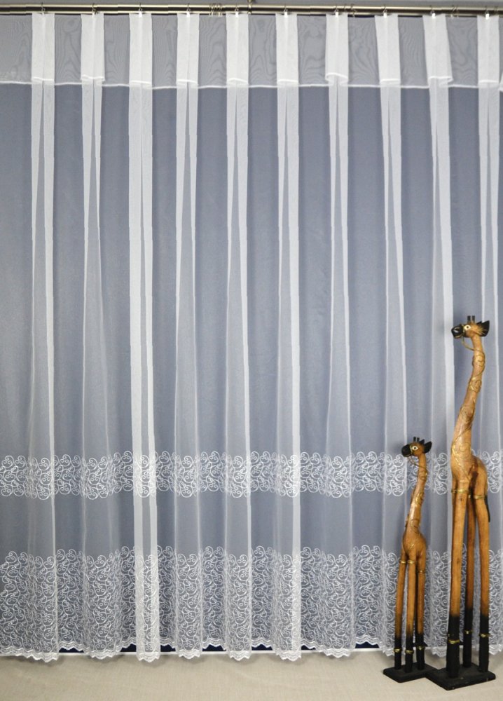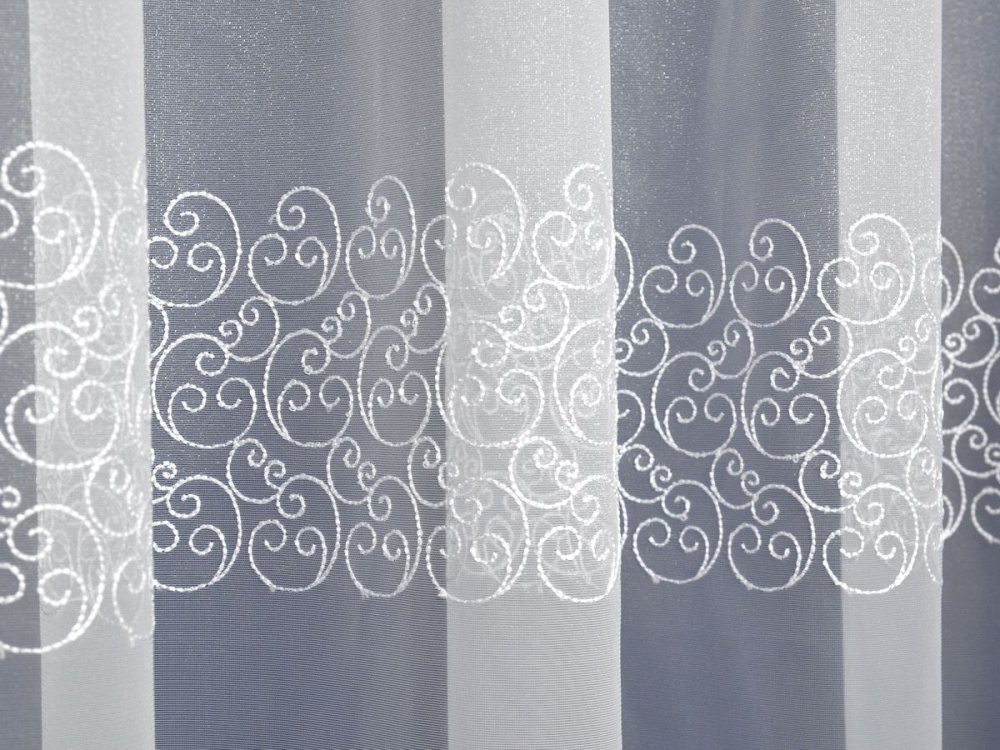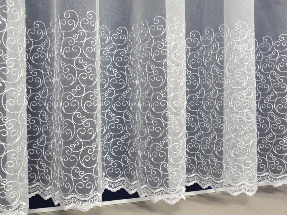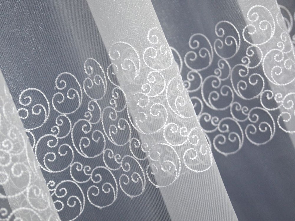 ELEGANCKA I DELIKATNA JEDNOCZEŚNIE FIRANA HAFTOWANA - SZLAKOWY WZÓR ŚLIMACZKÓW SUBTELNIE PODKREŚLONY OD DOŁU GRUBYM HAFTEM ORAZ ZĄBKAMI.