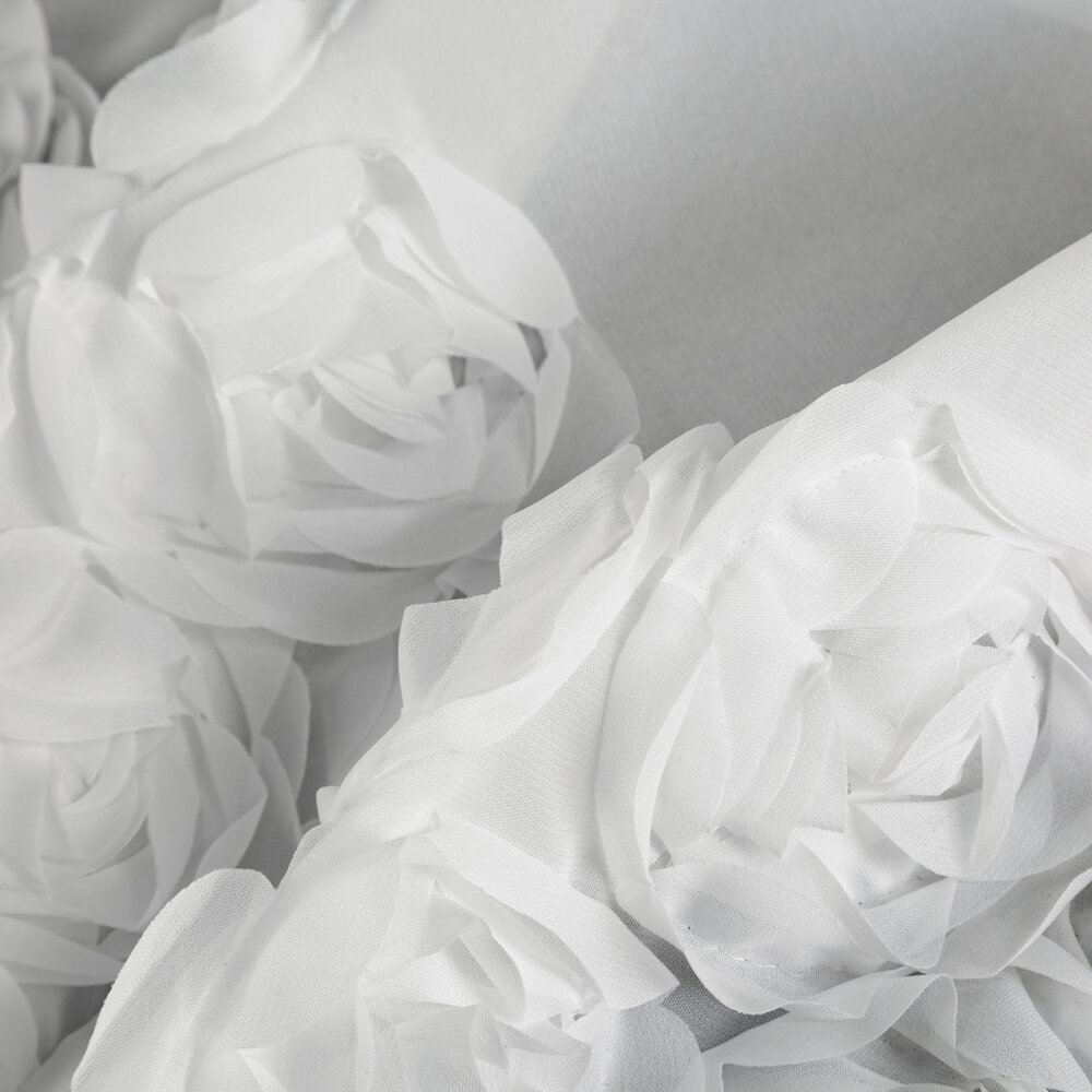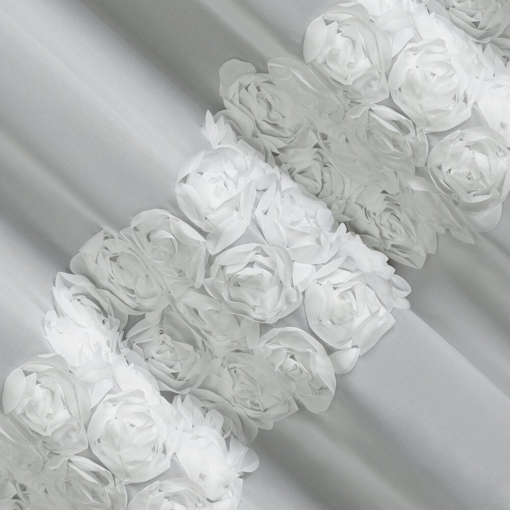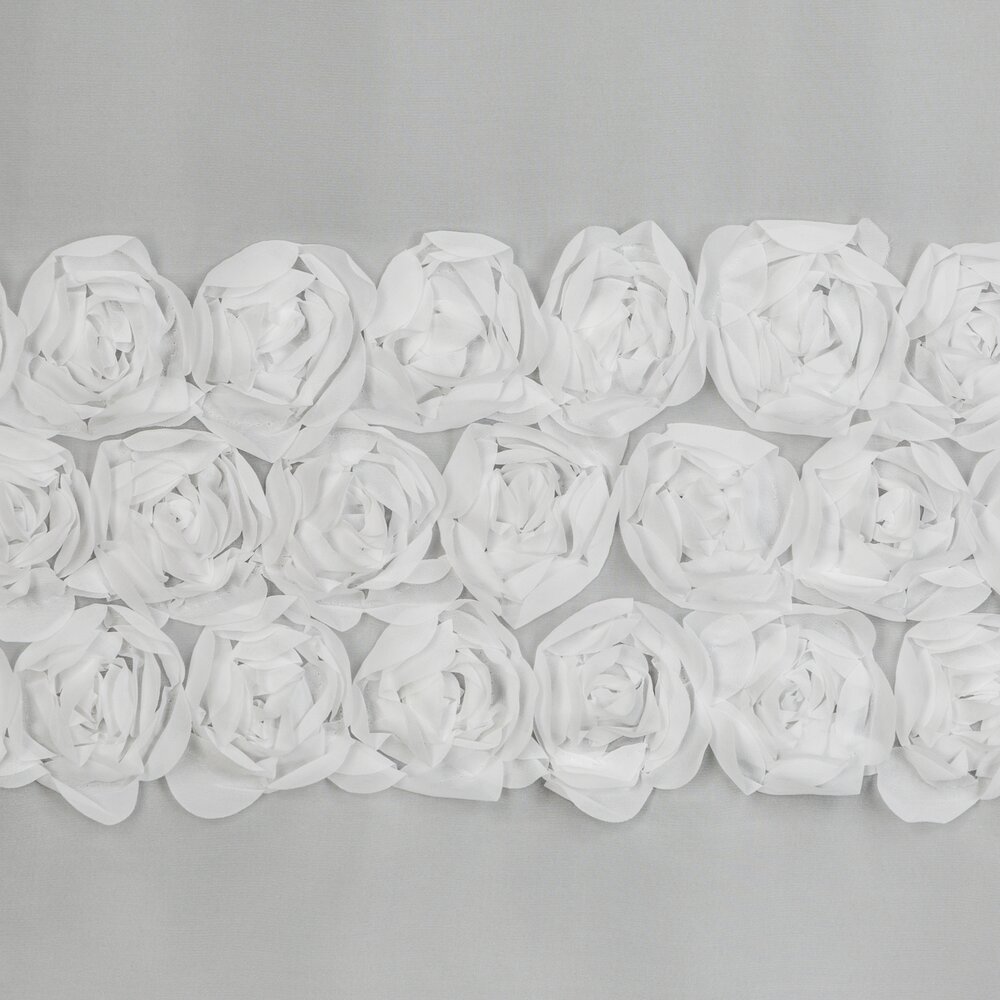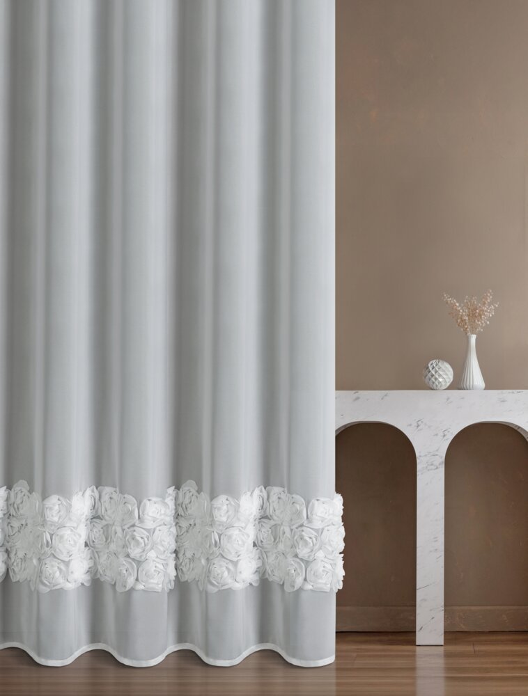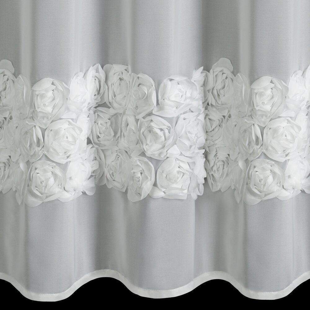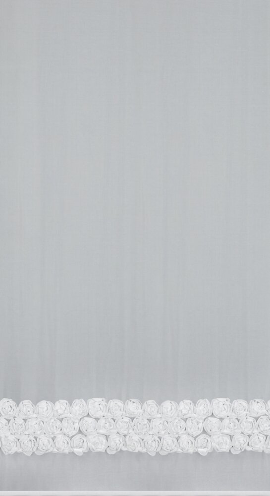 Dolną część firany zdobią trzy pasy aplikacji 3D w formie romantycznych róż wykonanych z tkaniny.
