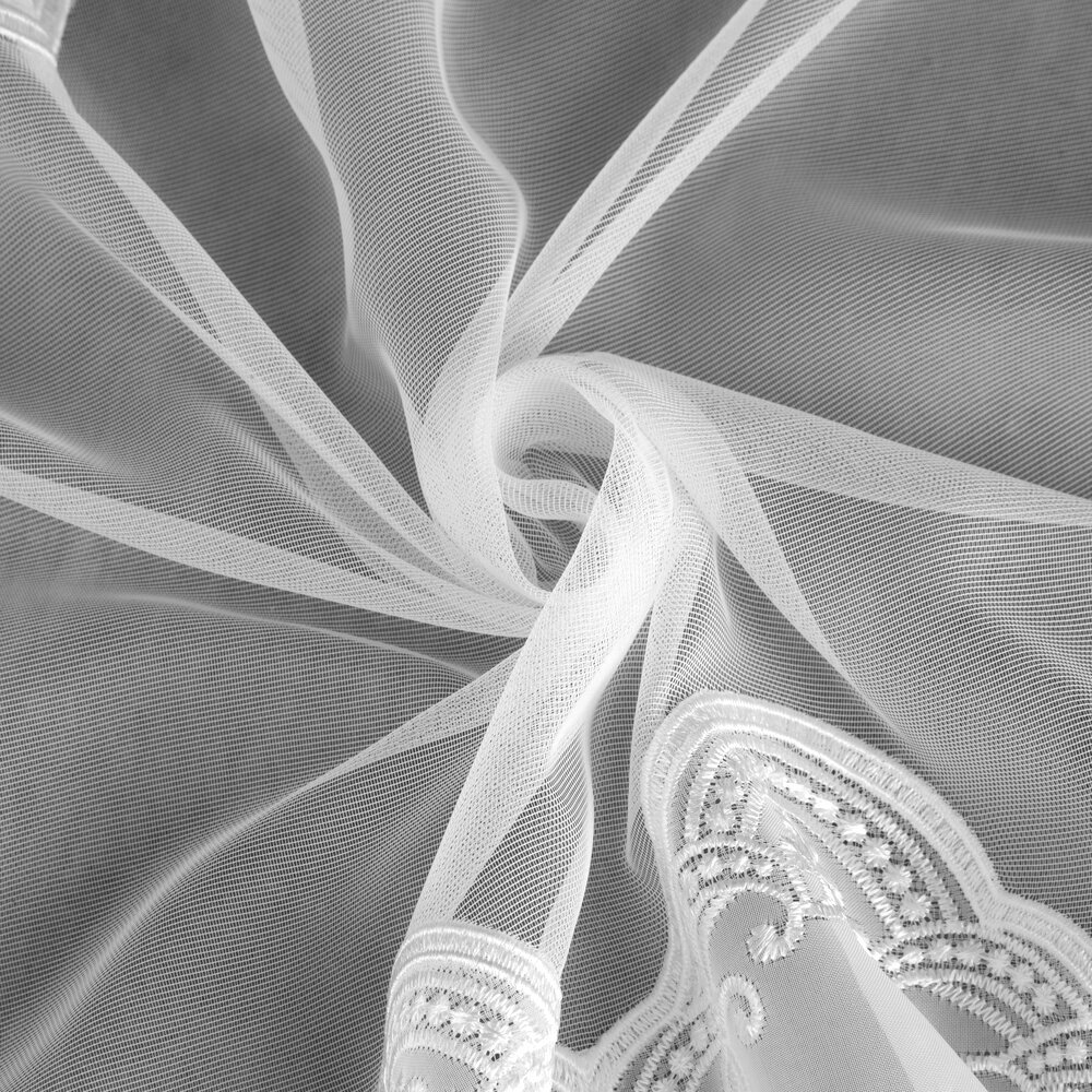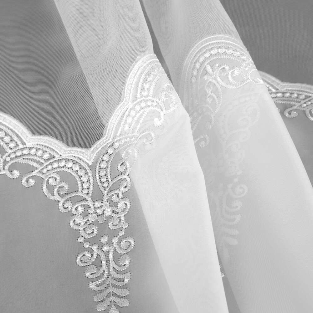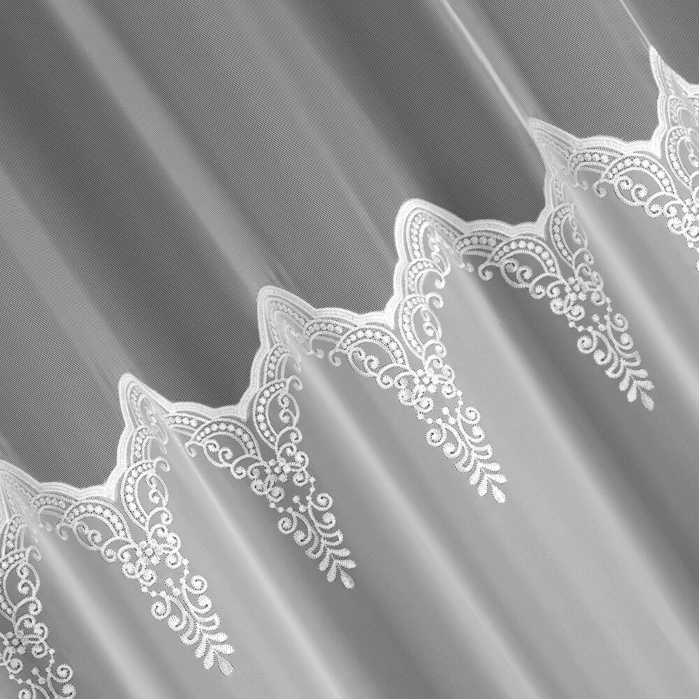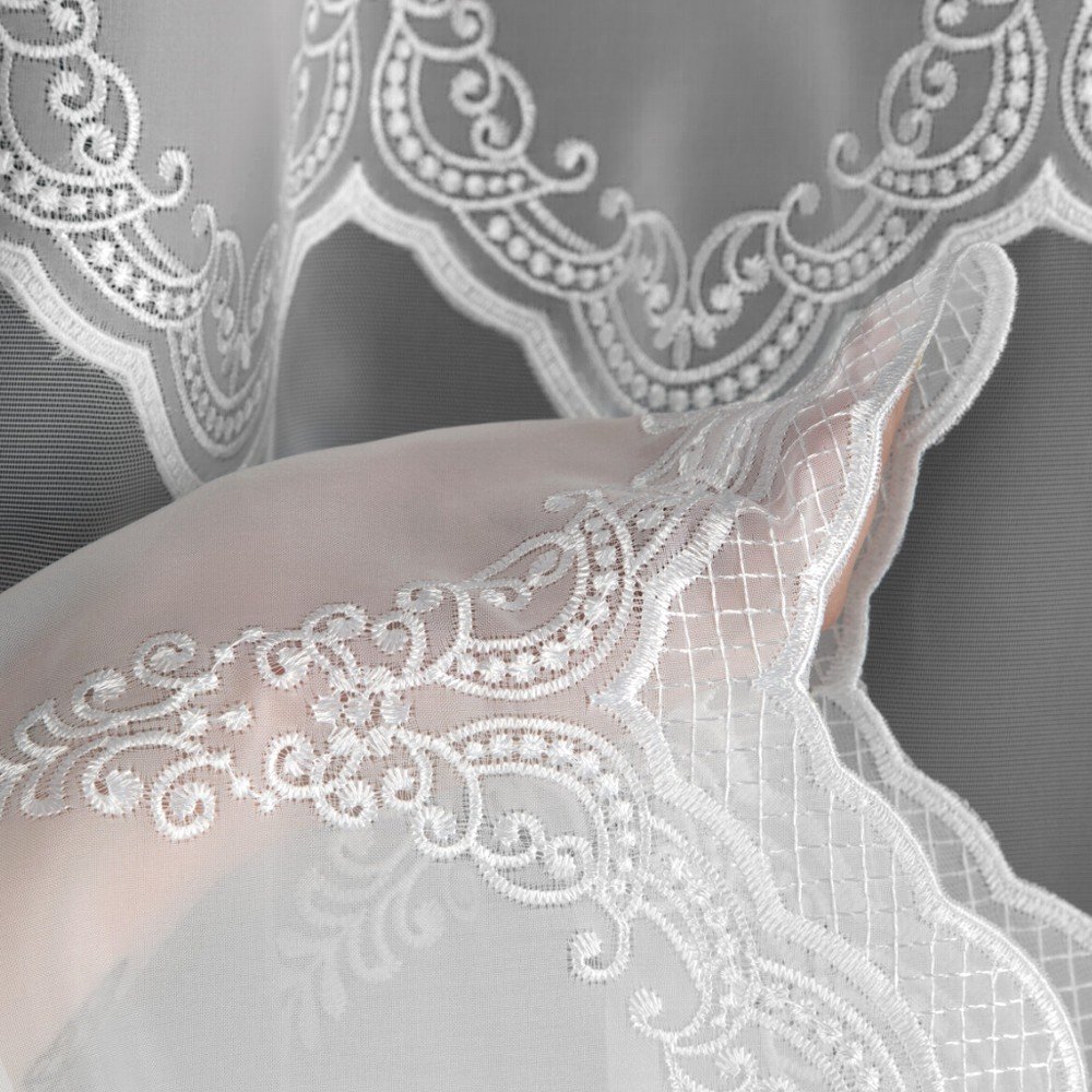 Odkryj firankę ELEONOR – ekskluzywny model, który łączy woal ze wstawką markizety w wyjątkowo eleganckim wydaniu. Ta biała firana premium zachwyca dopracowanymi detalami – szeroki, ozdobny haft u dołu oraz wykończona dekoracyjnymi haftami wstawka z markizety nadają jej wyrafinowanego charakteru. Szlak umieszczony wyżej sprawia, że wzór pięknie prezentuje się nad parapetem, eksponując zdobienie w centralnej części okna.