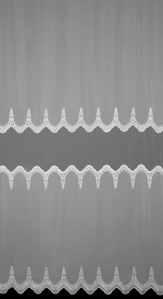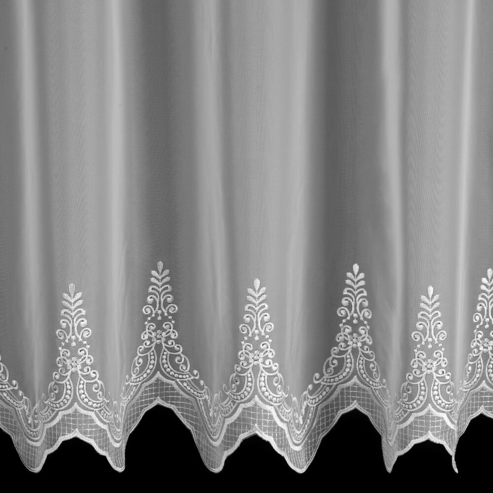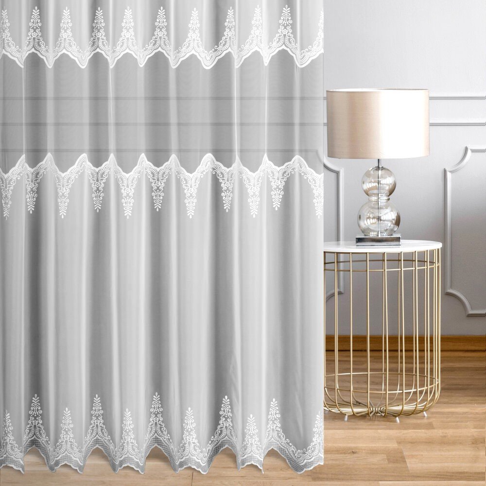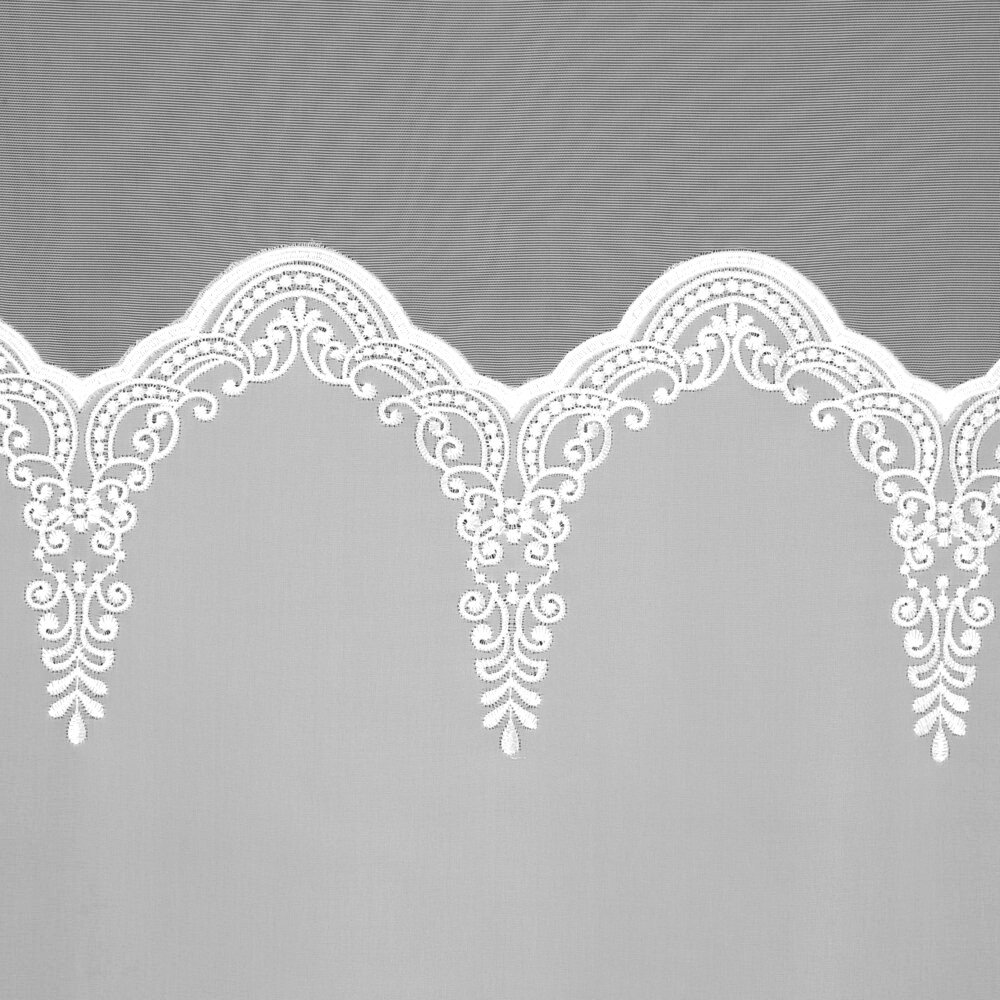 Odkryj firankę ELEONOR – ekskluzywny model, który łączy woal ze wstawką markizety w wyjątkowo eleganckim wydaniu. Ta biała firana premium zachwyca dopracowanymi detalami – szeroki, ozdobny haft u dołu oraz wykończona dekoracyjnymi haftami wstawka z markizety nadają jej wyrafinowanego charakteru. Szlak umieszczony wyżej sprawia, że wzór pięknie prezentuje się nad parapetem, eksponując zdobienie w centralnej części okna.