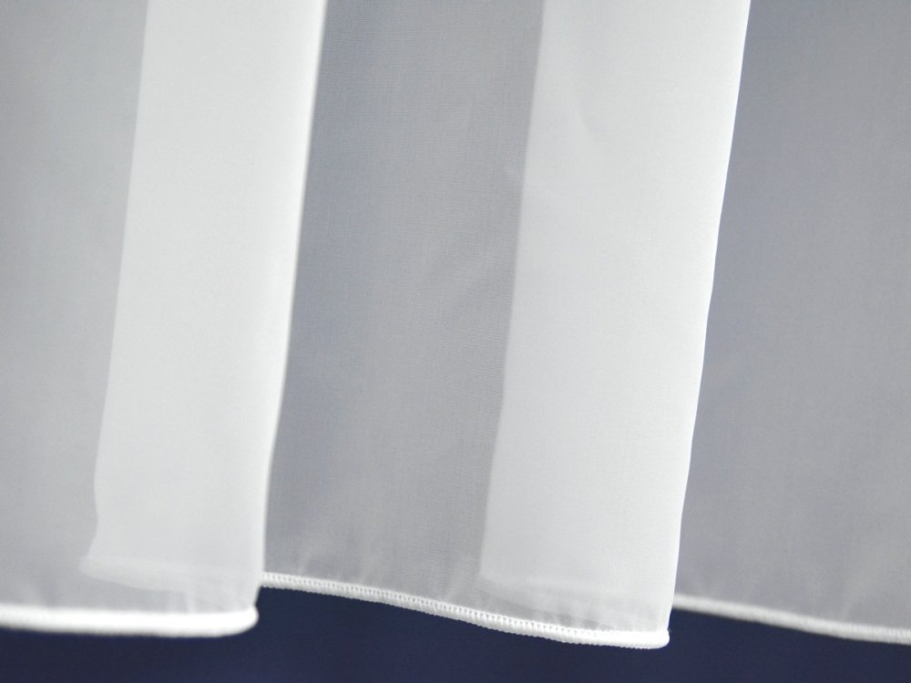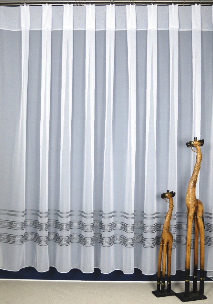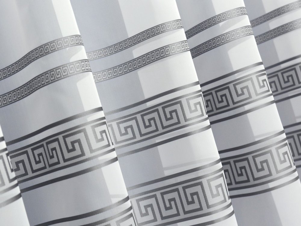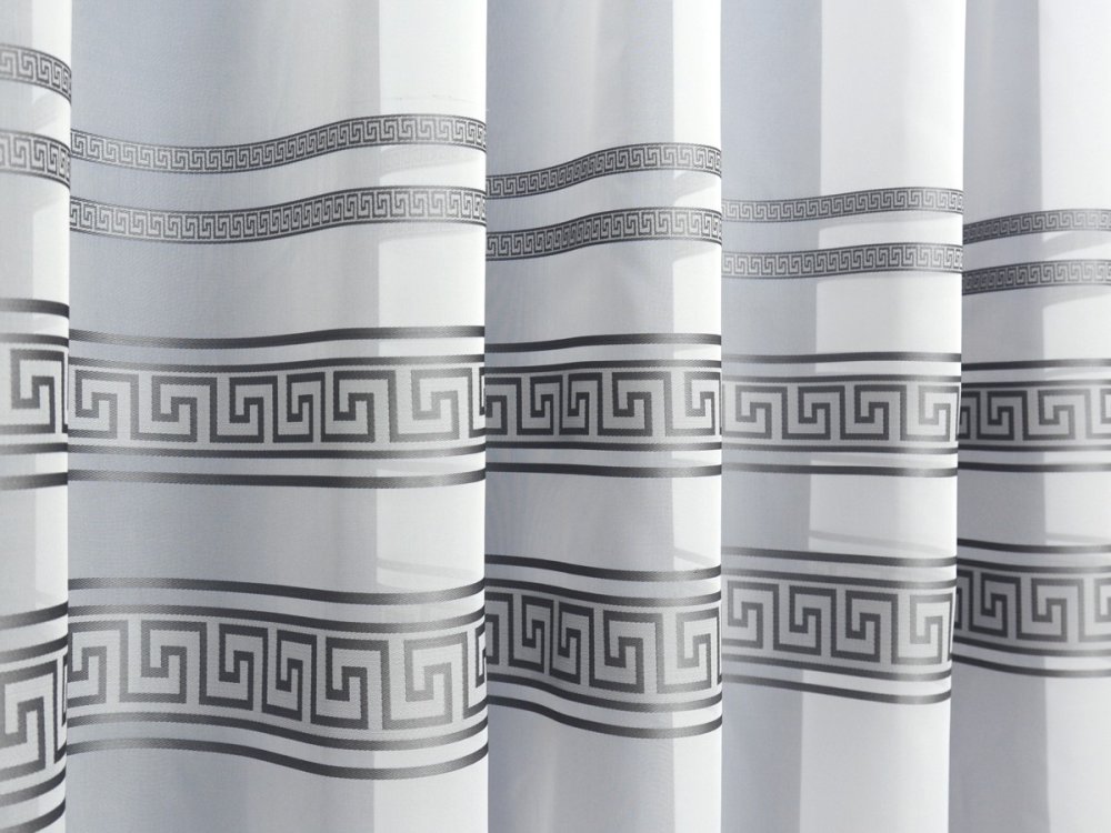 EKSKLUZYWNA FIRANA Z WOALU WYKOŃCZONA SATYNOWO - ŻAKARDOWYMI LAMPASAMI ZE WZOREM GRECKIEJ DROGI. APLIKACJA NA LAMPASACH DODAJE TKANINIE SZYKU I KLASY. FIRANA IDEALNA DO NOWOCZESNYCH WNĘTRZ. TKANINA JEST BARDZO PLASTYCZNA I PODDATNE W UKŁADANIU. KOLOR NA LAMPASACH DWUSTRONNY, AWERS JASNE TŁO CIEMNY WZÓR (NA ZDJĘCIU), REWERS CIEMNE TŁO JASNY WZÓR. DÓŁ FIRANY WYKOŃCZONY FABRYCZNIE OŁOWIANYM OBCIĄŻNIKIEM/