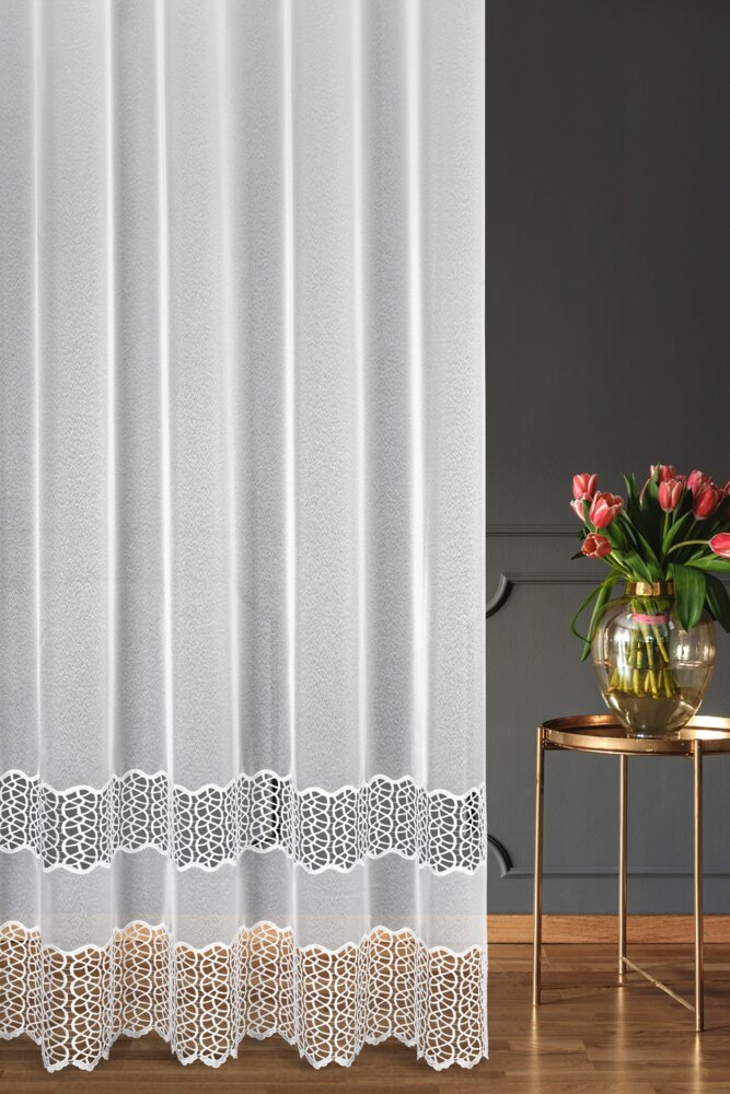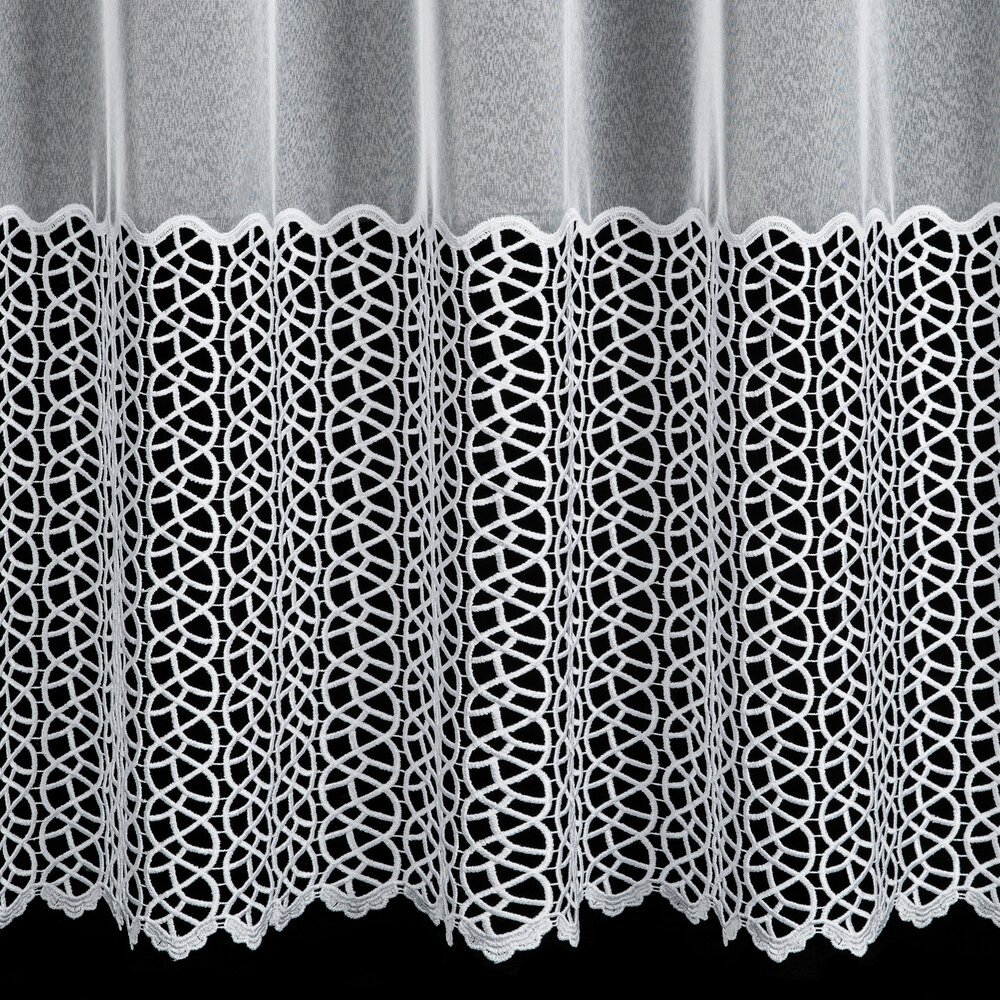Nowoczesna firana z markizety AZURA o wysokości 175 cm to elegancka dekoracja okna do salonu, jadalni i sypialni. Jej największym wyróżnikiem są dwa szlaki gipiury oraz przemyślany, proporcjonalny układ wzoru, który daje efekt lekkości, a jednocześnie wyraźnie podkreśla dół firany.