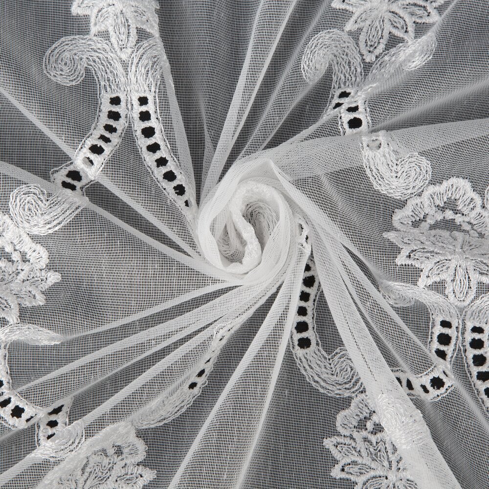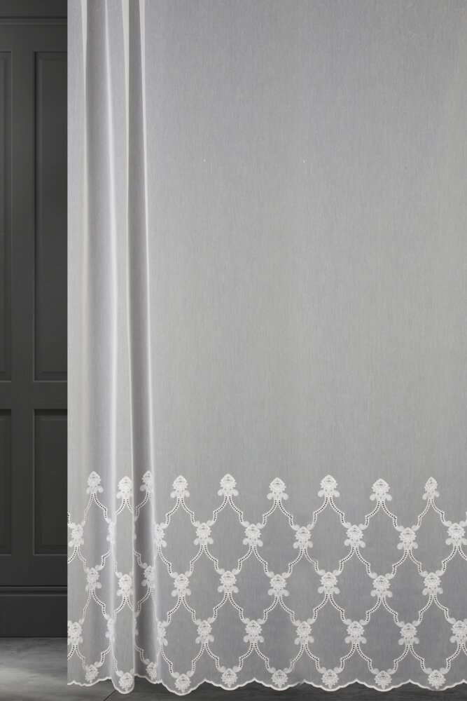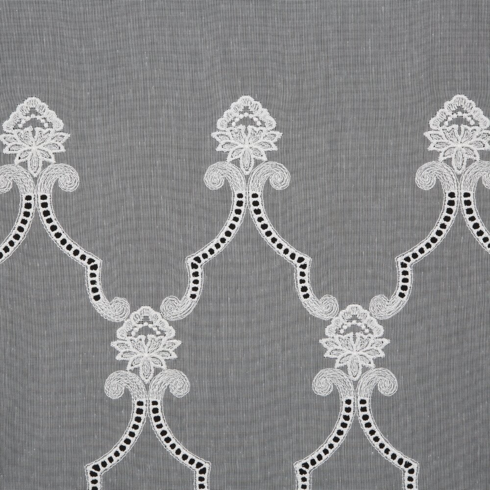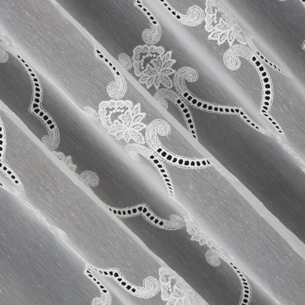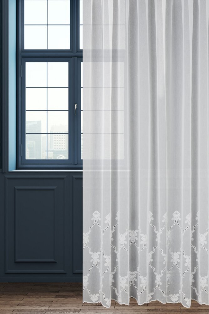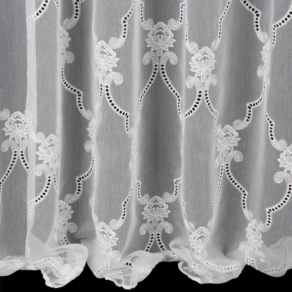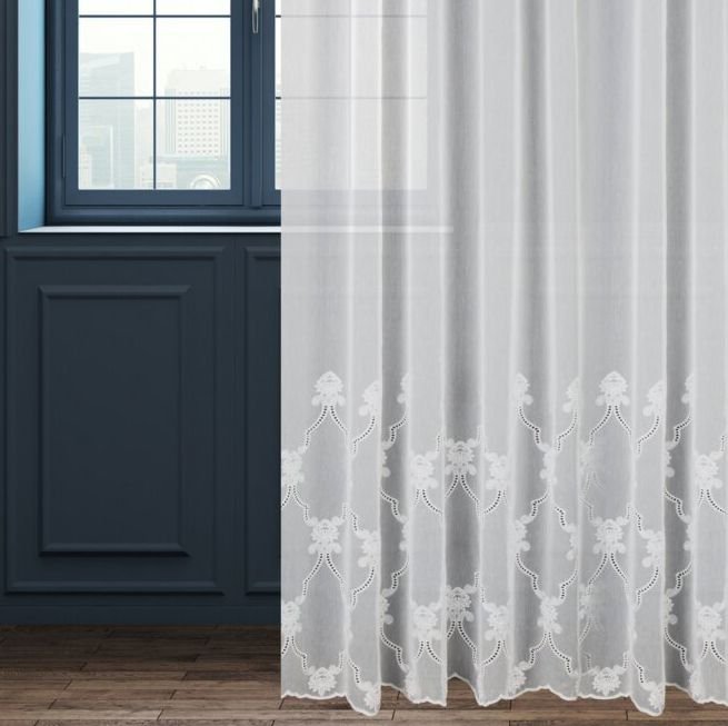 Dolną część firany zdobi szeroki, ażurowy haft przedstawiający ornamenty i motywy kwiatowe, które tworzą wyrafinowaną kompozycję o dekoracyjnym, ale wciąż ponadczasowym charakterze. Haft zakończony jest delikatnymi ząbkami, co nadaje całości lekkości i elegancji.