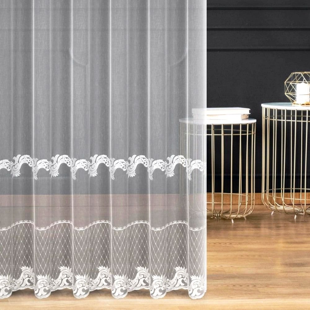 Eleganckie firany haftowane będą ozdobą każdego okna w salonie, jadalni lub sypialni. Haftowane Firany do okna wykonane z markizety typu aden potocznie zwana "bambusem". Firana o zwartej strukturze z delikatnym deszczykiem. Bardzo dobrze przepuszcza światło. Haftowany wzór na firanie ma ozdobną i wyrafinowaną formę. Element florystyczny połączony z esami oraz eleganckim lampasem haftu w kształcie karo. Haft na firanie sięga do wysokości 0,75m.