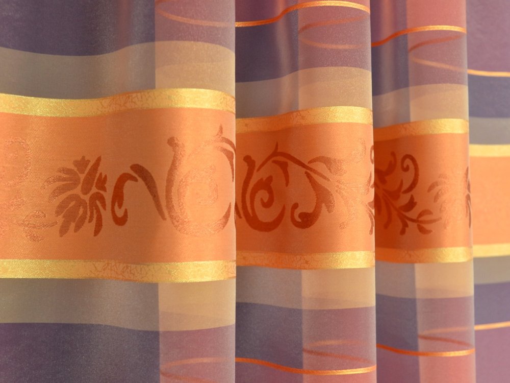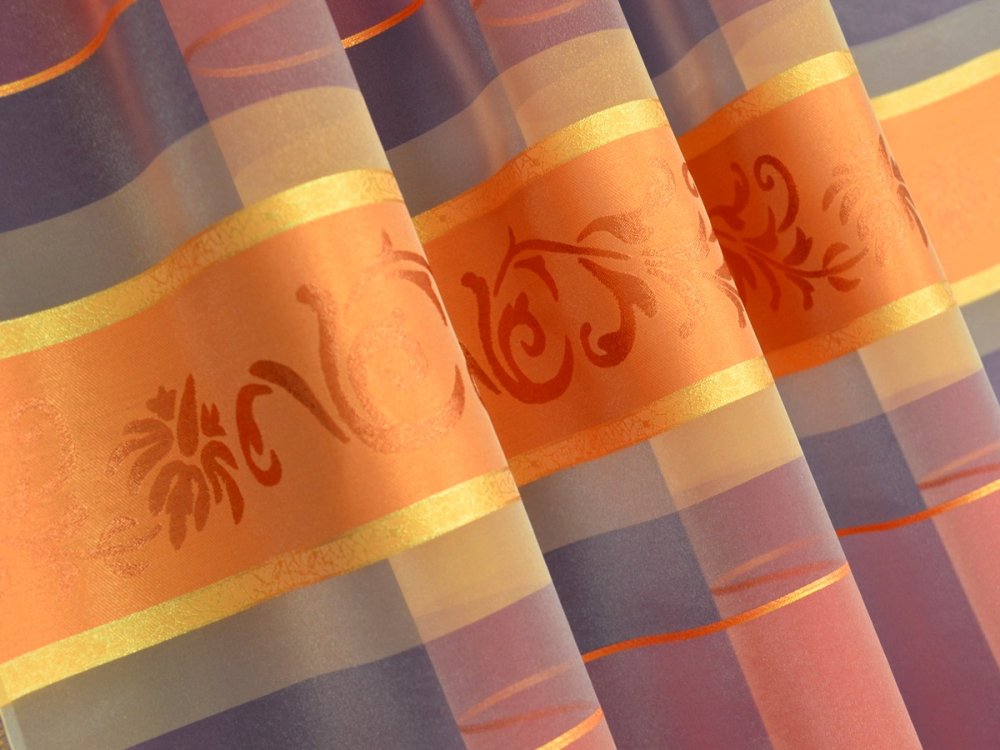 ELEGANCKA FIRANA PANELOWA Z ORGANTYNY. ORGANTYNA Z MISTETNIE UTKANYM SATYNOWYM WZOREM. SATYNOWE PASY DODATKOWO ZDOBIONE MOTYWEM ROŚLINNYM.