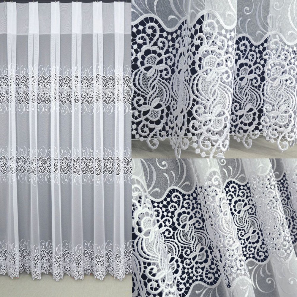 Dostępność różnych wysokości – oprócz wersji 2,80 m dostępna także biała firana z gipiurą „Margarita” 1,80 m — idealna na firany krótkie oraz komplet firan do okna i drzwi balkonowych.
