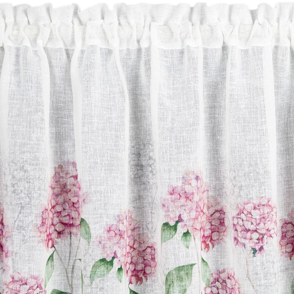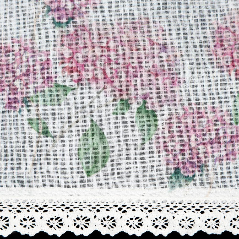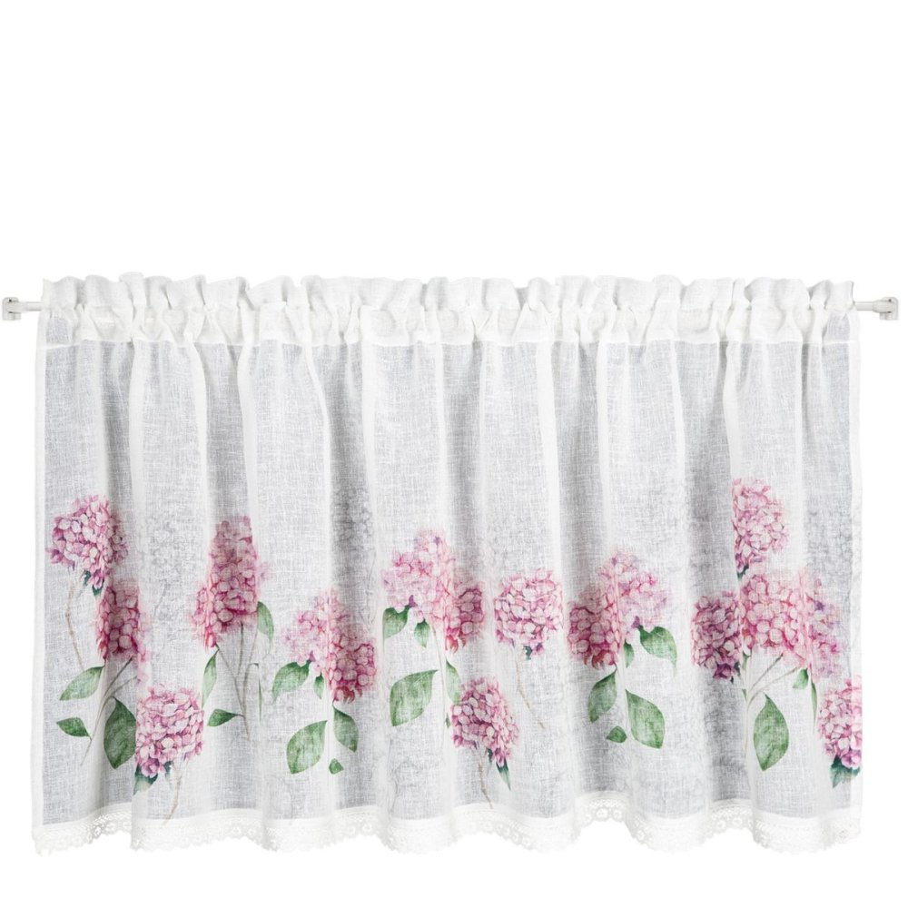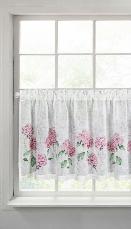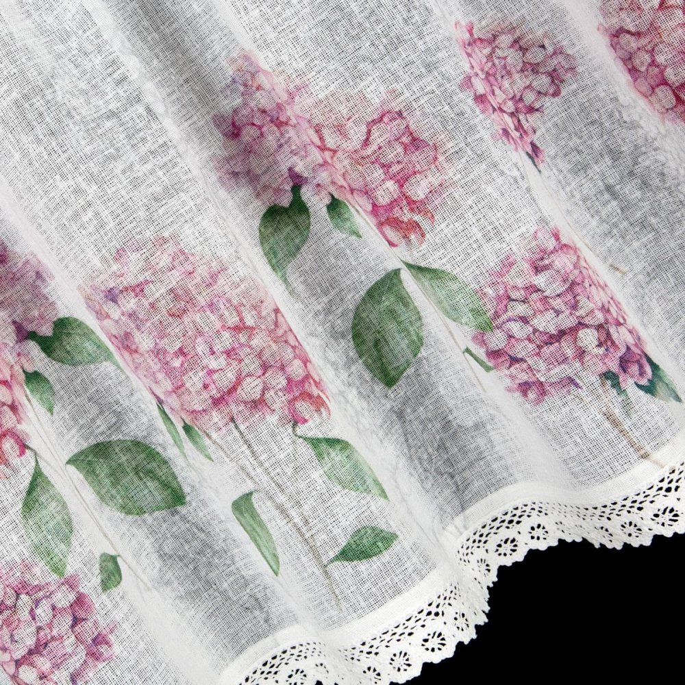 Zazdrostki kuchenne "Mona" to idealna propozycja dla miłośników sielskiego, prowansalskiego stylu. Ich uroczy wzór różowych kwiatów hortensji w połączeniu z delikatną, ażurową koronką sprawia, że wnętrze staje się przytulne i pełne romantycznego uroku. Zazdrostki są gotowe do zawieszenia – górna część posiada tunel z ozdobną kryzą, która tworzy efektowną falbankę.