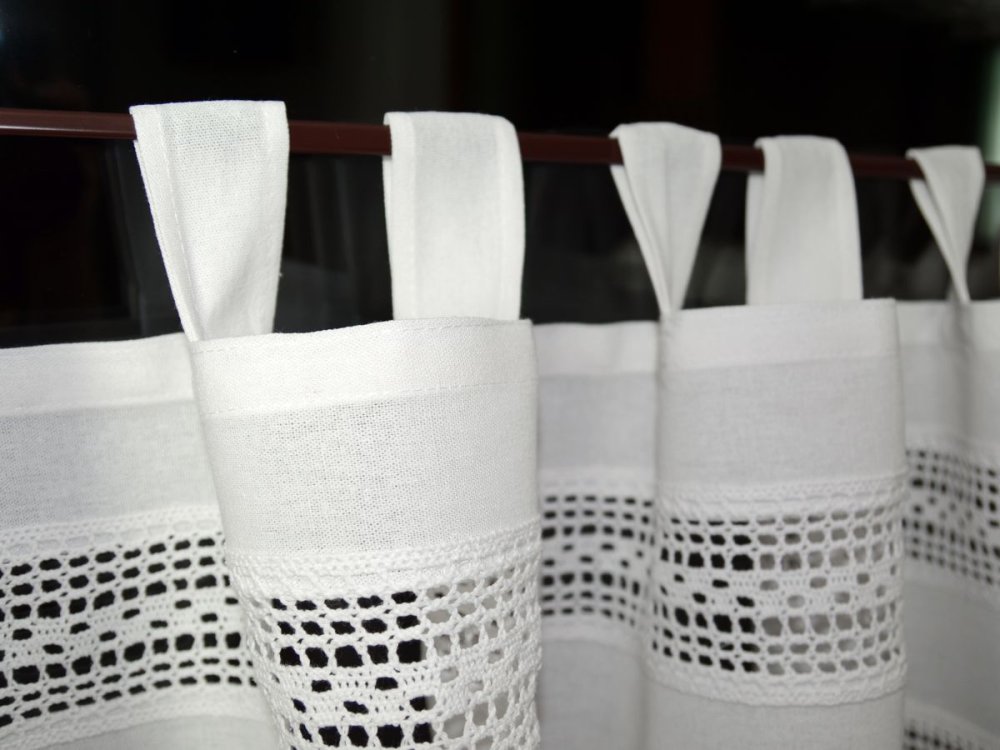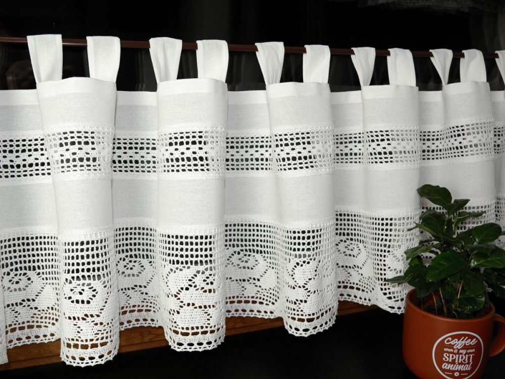 Zazdrostki KLARA wykonane są z wysokiej jakości bawełnianej tkaniny, zdobionej efektownymi koronkowymi wstawkami: