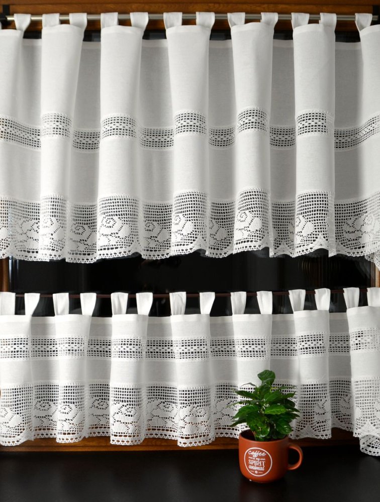 Koronkowe wstawki zdobi piękny, kwiatowy wzór inspirowany motywem róży, który podkreśla rustykalny i romantyczny charakter zazdrostki. Motyw róży, obecny w tradycyjnych koronkach, doskonale oddaje klimat dawnych wnętrz, a jednocześnie subtelnie filtruje światło dzienne, tworząc przytulną atmosferę.
