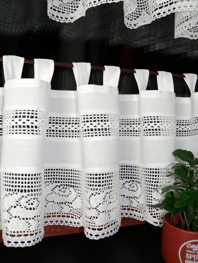 Rustykalna zazdrostka z koronką KLARA o wysokości 45 cm to wyjątkowa dekoracja okienna inspirowana urokiem tradycyjnych, babcinych firanek kuchennych. Biała kolorystyka, naturalna bawełniana tkanina oraz dekoracyjne koronki sprawiają, że zazdrostka wprowadza do wnętrza ciepło, autentyczność i ponadczasowy, rustykalny charakter. To idealny wybór do kuchni w stylu wiejskim, prowansalskim, retro i vintage.