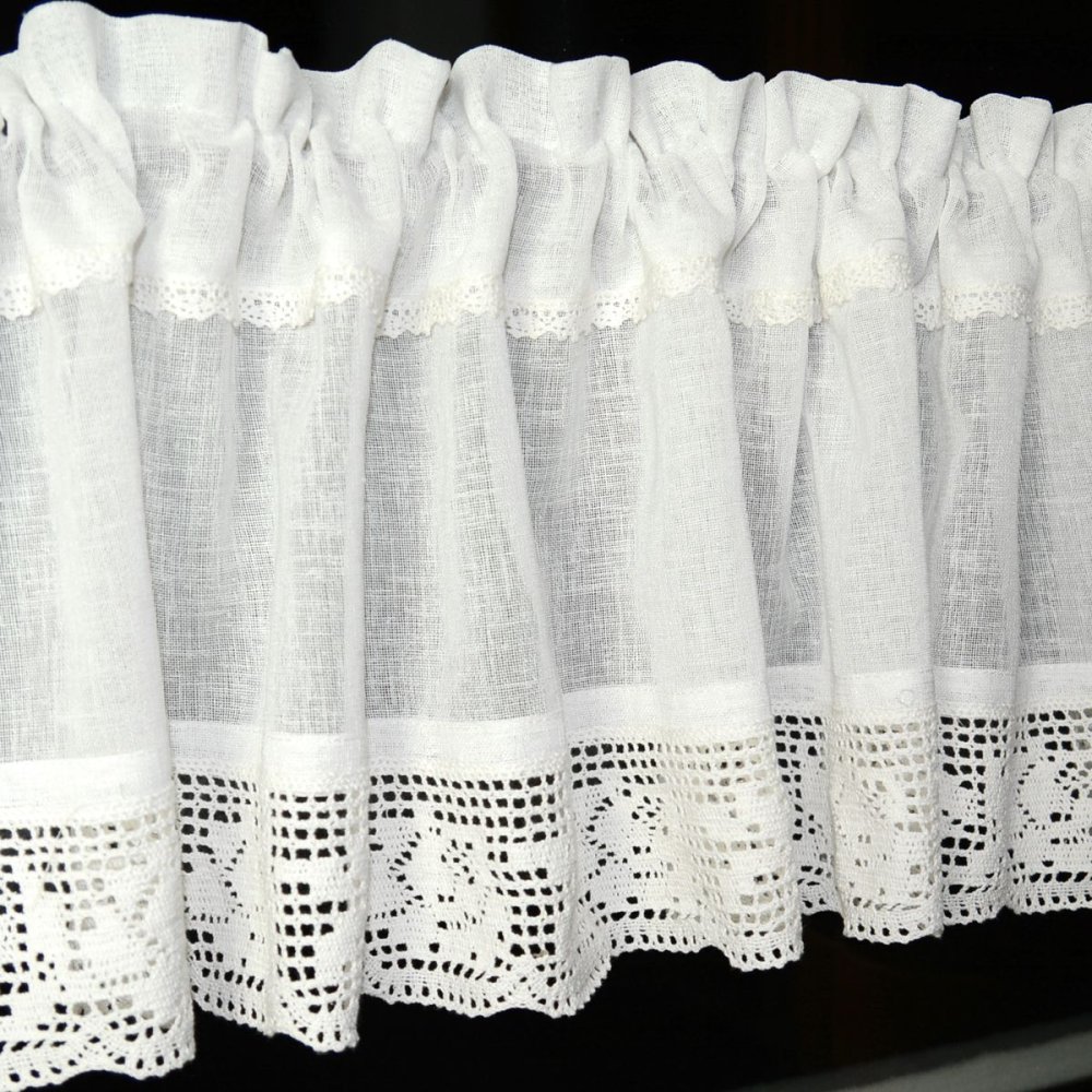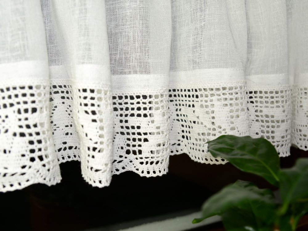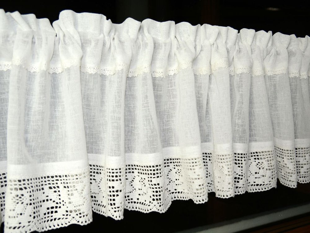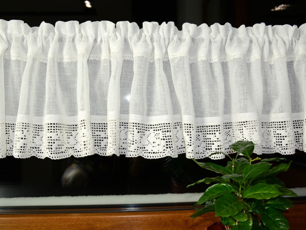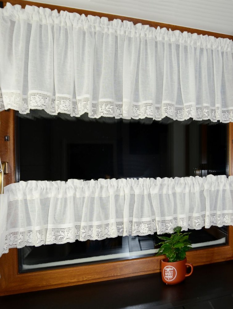 Dodatkowym atutem jest wąska, dekoracyjna koronka wszyta tuż pod linią tunelu, która subtelnie podkreśla górną część zazdrostki i nadaje całości lekkości.