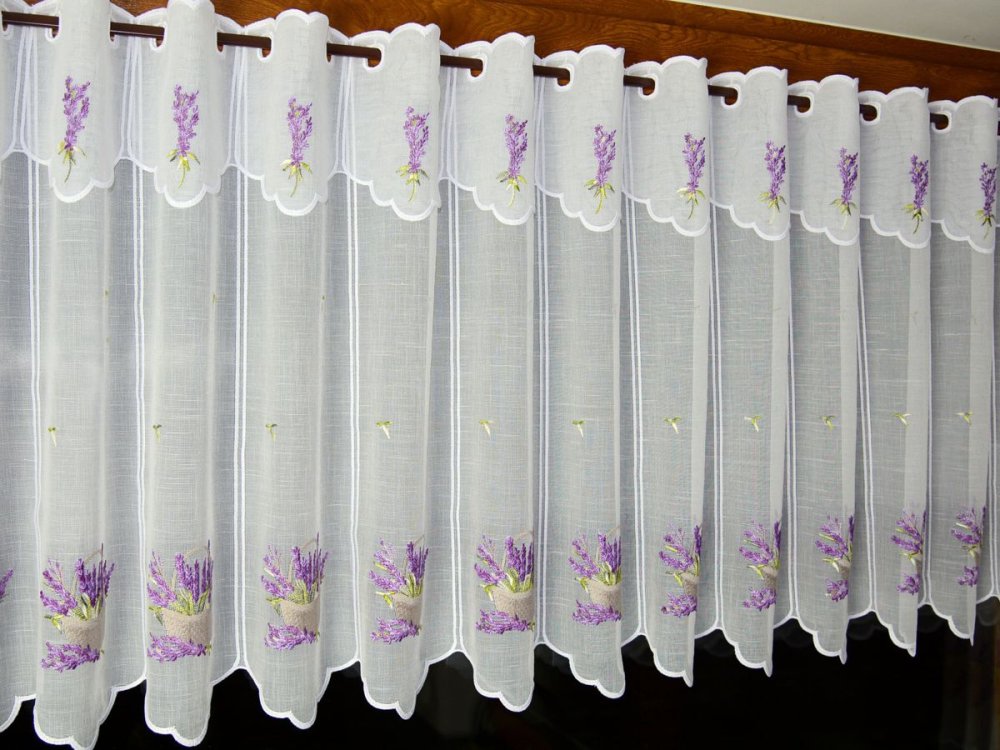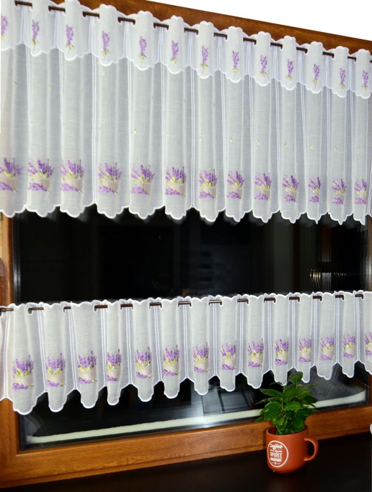 Zazdrostka LAWENDA KOSZYCZEK o wysokości 17 cm to delikatna, lekka dekoracja okienna inspirowana prowansalskim klimatem. Wykonana z białej, matowej etaminy, zdobiona finezyjnym haftem przedstawiającym lawendę w koszyczku, wprowadza do kuchni naturalność, świeżość i sielski charakter.