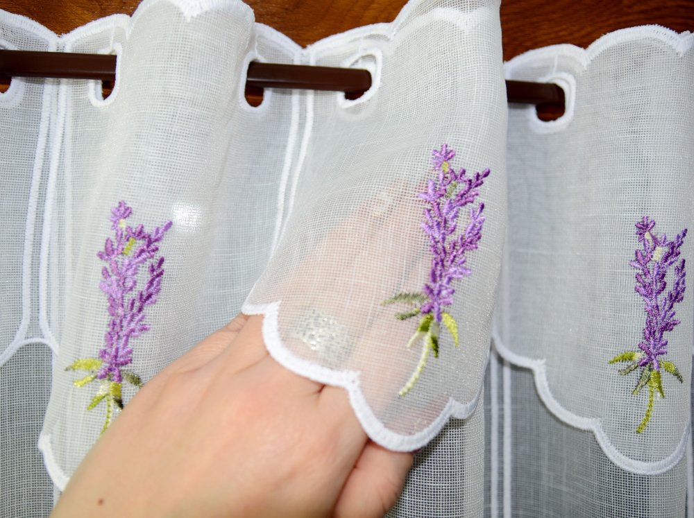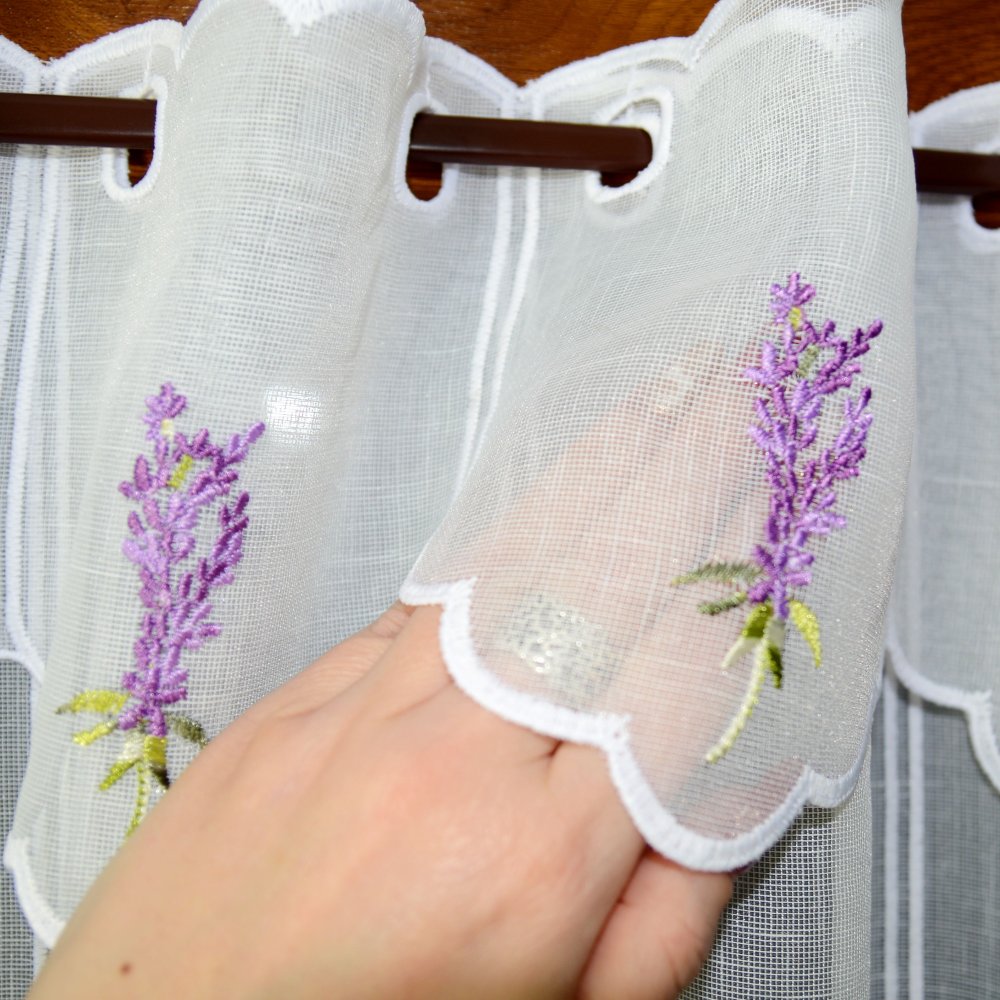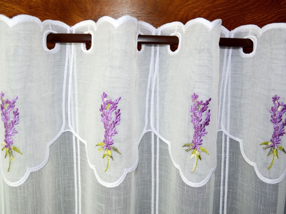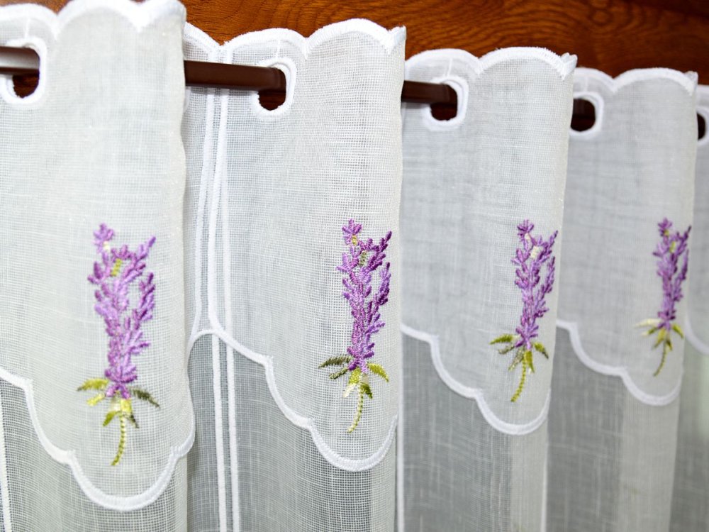 Haft lawendy jest czytelny i dekoracyjny zarówno od strony wnętrza, jak i od zewnątrz okna.