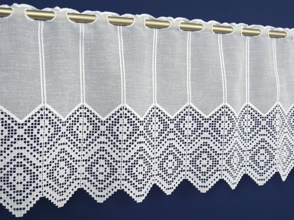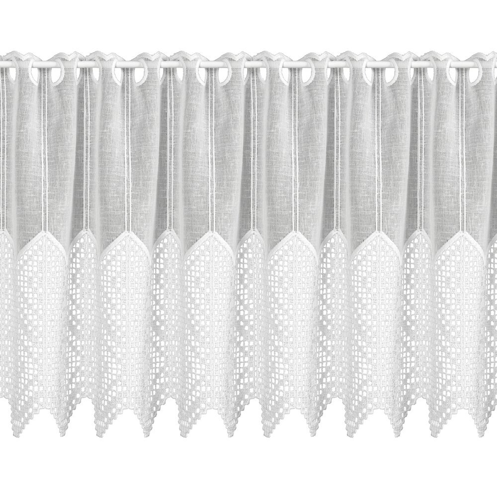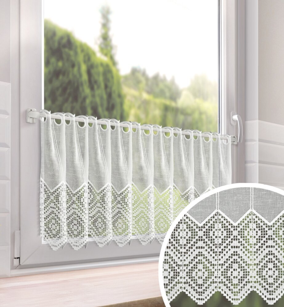 Zazdrostki panelowe Bello to elegancka dekoracja okna do kuchni wykonana z etaminy i wykończona gipiurą, w klasycznym kolorze białym. Wariant o wysokości 40 cm sprawdza się jako krótka firanka, która doświetla wnętrze, a jednocześnie nadaje oknu schludny, uporządkowany wygląd. Etamina ceniona jest za lekkość i delikatny, „naturalny” charakter splotu, a gipiura dodaje całości dekoracyjnego, bardziej eleganckiego wykończenia. Produkt jest oferowany na metry, co ułatwia dopasowanie długości do szerokości okna i planowanego marszczenia.