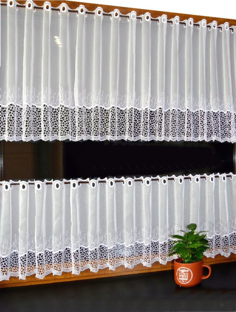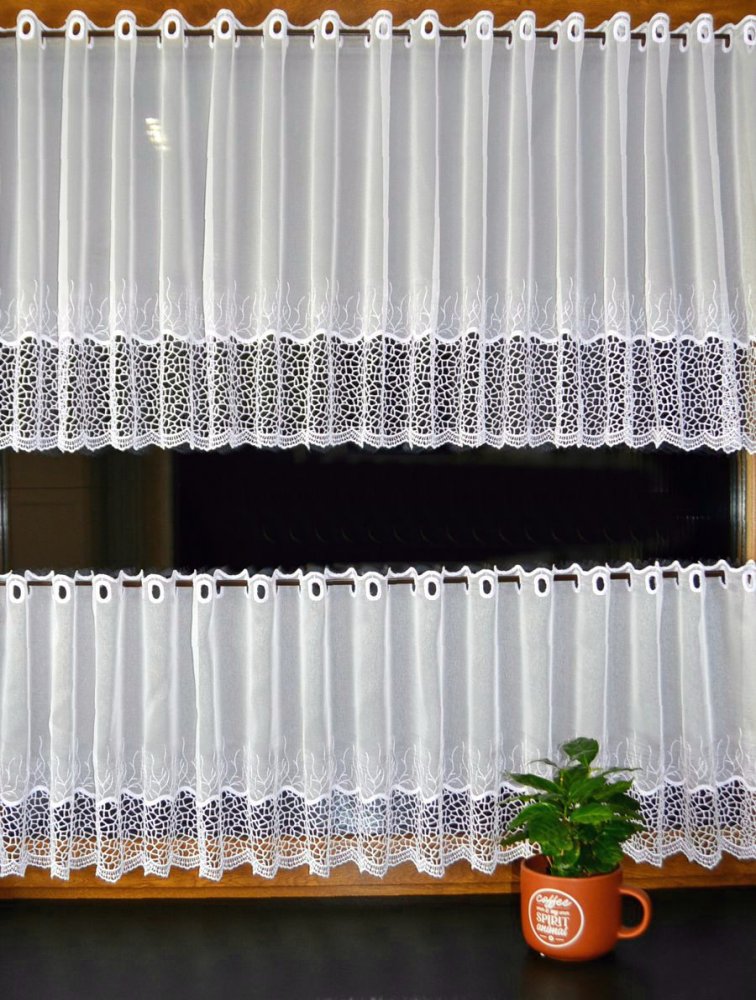 oraz jako firany z jednym, dwoma i trzema szlakami gipiury, co pozwala stworzyć spójną dekorację okien w kuchni, jadalni lub otwartych przestrzeniach (np. salon z aneksem).