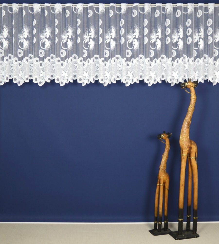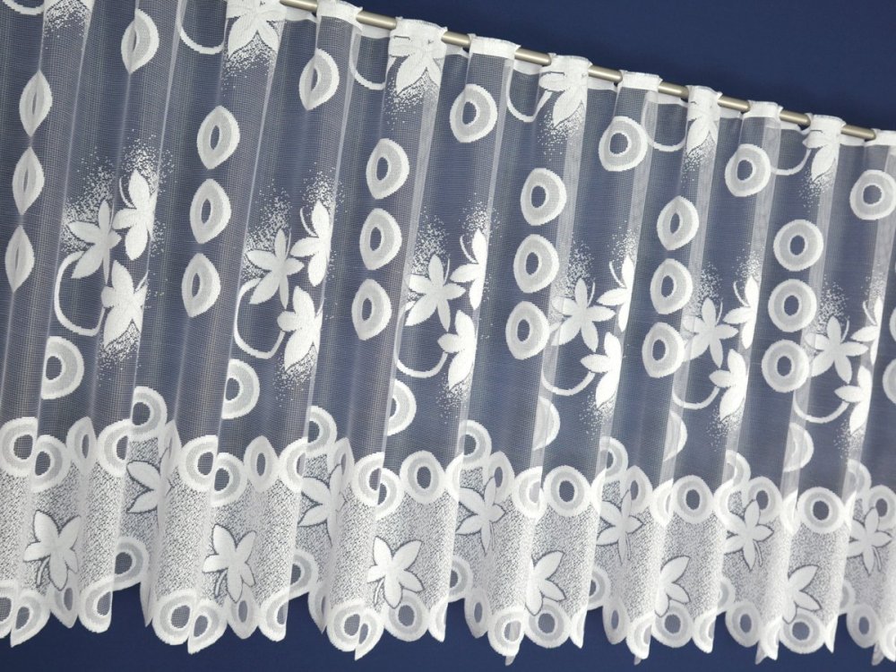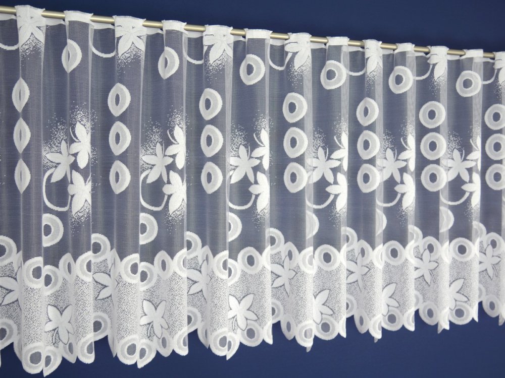 GŁADKIE TŁO ZDOBIONE OD DOŁU SZEROKIM WZOREM NA A'LA LISTWIE ORAZ NA CAŁOŚCI WZOREM LIŚCIA ORAZ KÓŁECZKAMI. GĘSTY, WYRAŹNY WZÓR NA FIRANECZE DOSKONALE WIDOCZNY JEST W OKNIE. ŚWIETNIE PREZENTUJE SIĘ ZARÓWNO OD WEWNĄTRZ JAK I NA ZEWNĄTRZ.