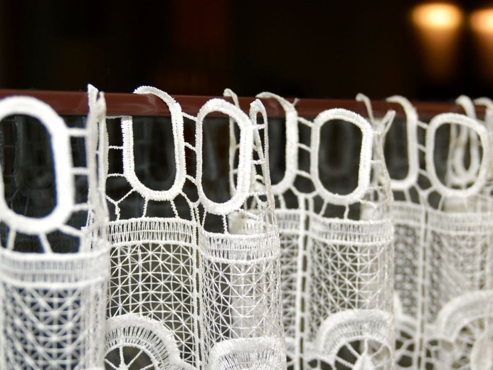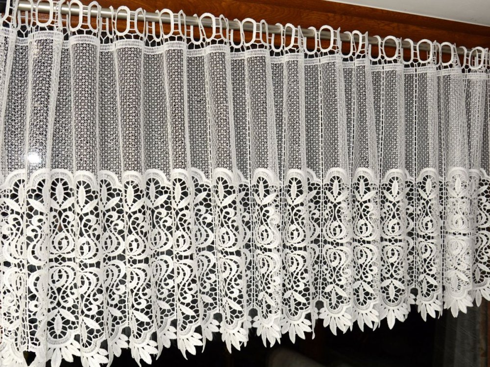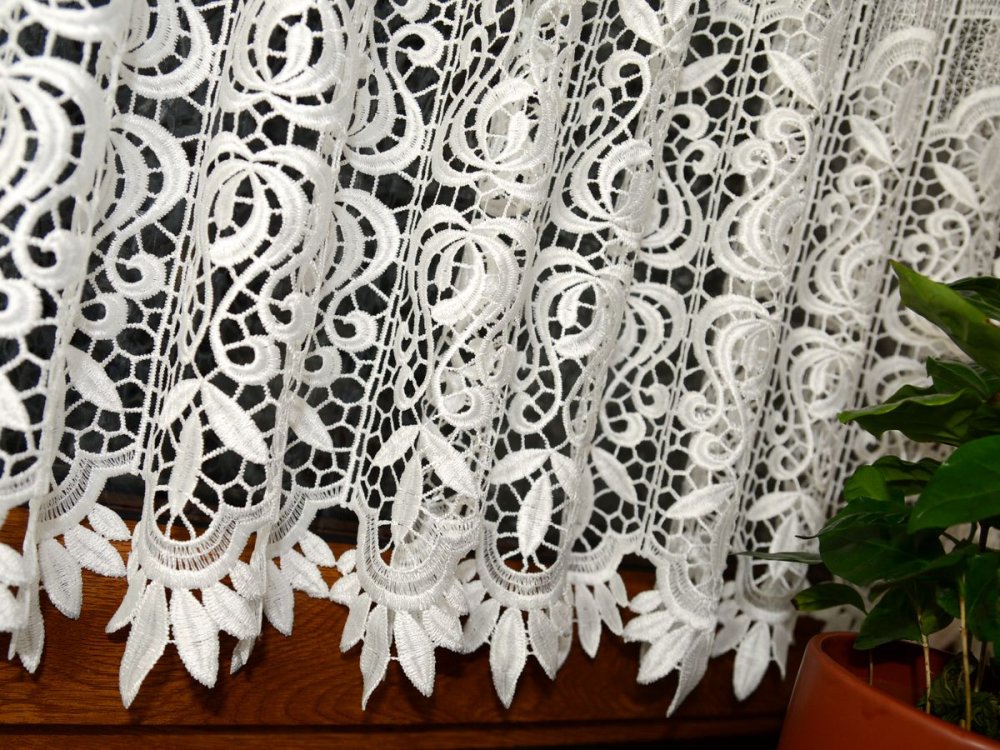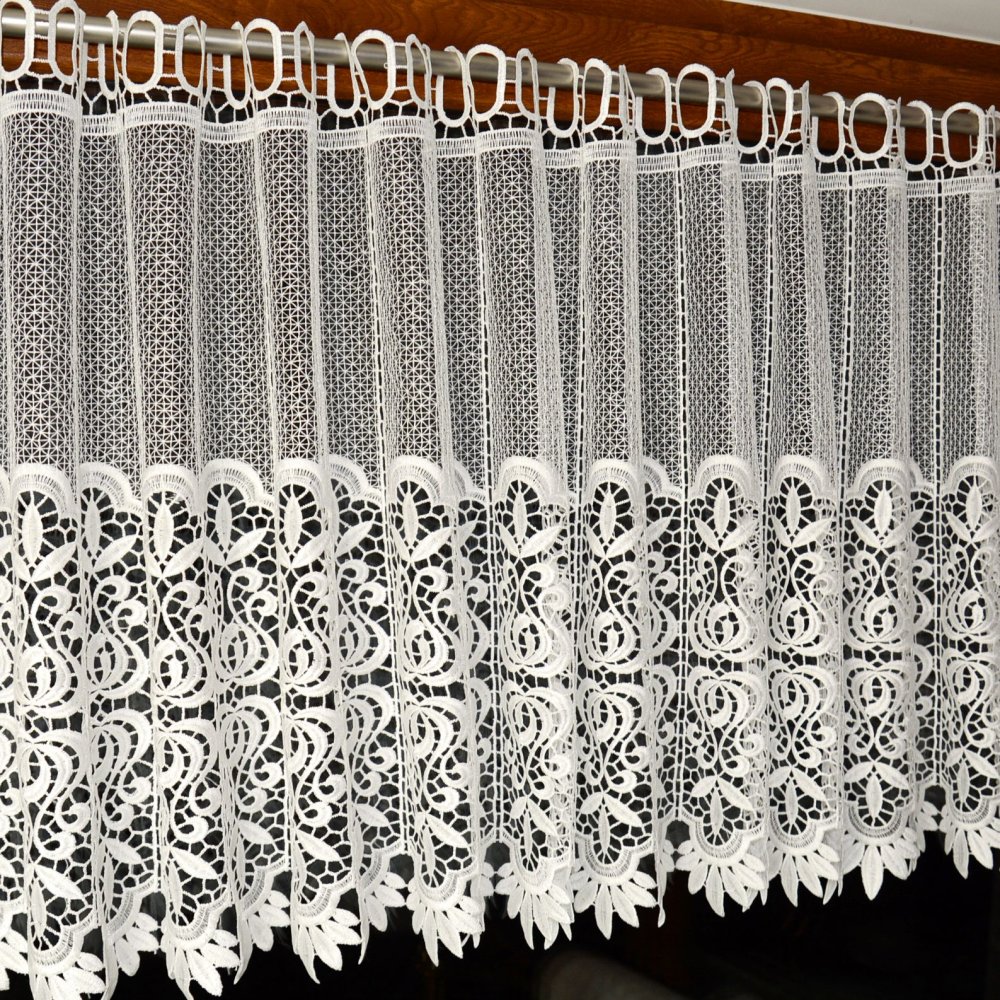 Góra zazdrostki: duże, solidne oczka gipiurowe, wrobione bezpośrednio w strukturę tkaniny – bez problemu pasują nawet na gruby karnisz kuchenny