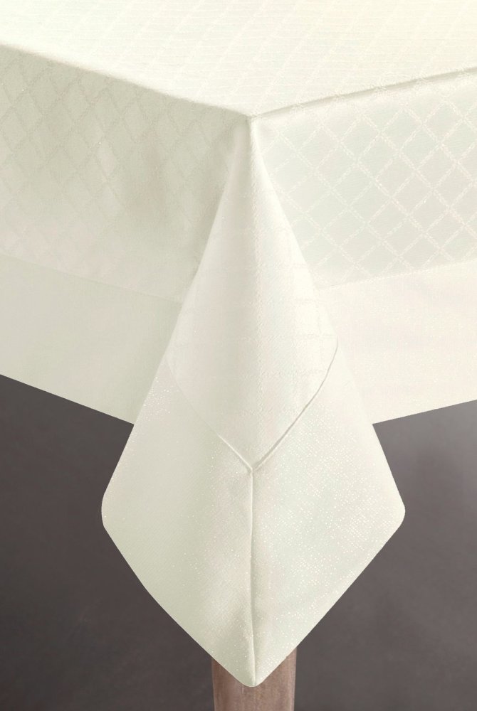 OBRUS Z ELEGANCKIM I PONADCZASOWYM WZOREM W KSZTAŁCIE KARO. WYSOKIEJ JAKOŚCI TKANINA BĘDĄCA MIESZANKĄ BAWEŁNY I POLIESTRU BARDZO ŁADNIE UKŁADA SIĘ NA STOLE. TKANINA O SUBTELNYM POŁYSKU. OBRUS WYKOŃCZONY PIĘKNĄ SZERSZĄ PLISĄ KTÓRA DODAJE MU STYLU I KLASY. PASUJE DO RÓŻNEGO TYPU WNĘTRZ.