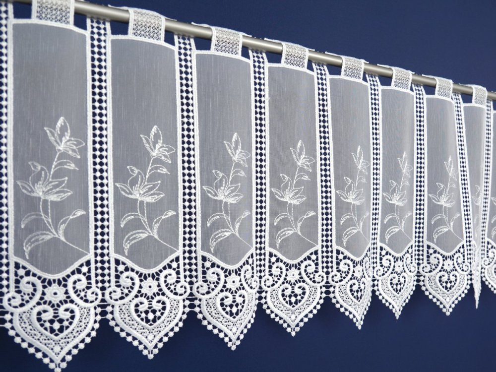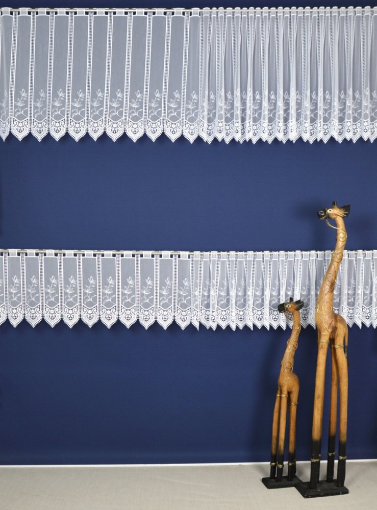 Zazdrostki kuchenne „Eliza” to doskonały wybór dla osób ceniących połączenie funkcjonalności i elegancji. Wykonane z wysokiej jakości tkaniny aden o splocie zbliżonym do klasycznej markizety, zapewniają doskonałe przepuszczanie światła, nadając wnętrzu lekkości i ciepłego charakteru. Firanka w formie paneli prezentuje się niezwykle efektownie – każdy panel został starannie wykończony gipiurą, a środkową część zdobi haftowany, kwiatowy wzór, który dodaje całości subtelnej dekoracyjności.